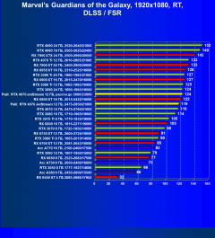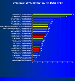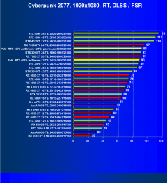 - Результаты тестов со включенной аппаратной трассировкой лучей и/или DLSS/FSR в разрешениях 1920×1080, 2560×1440 и 3840×2160