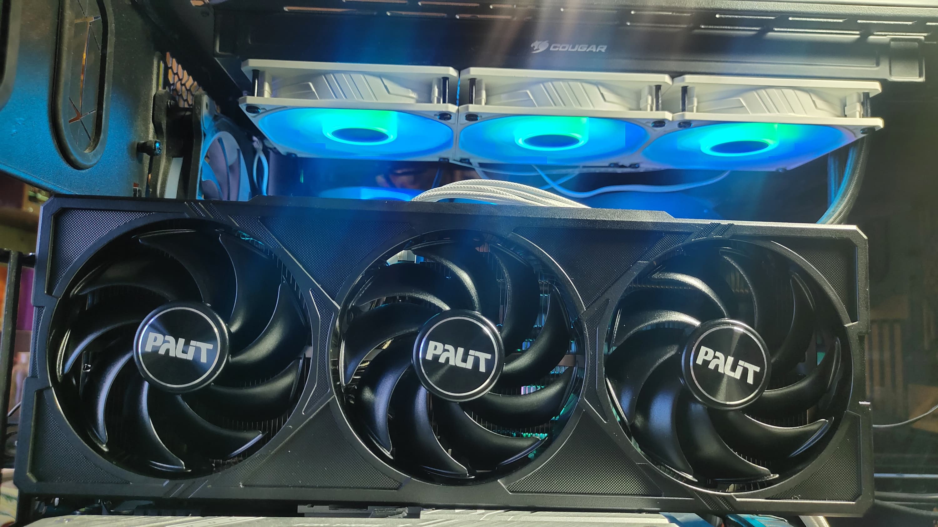 Поверх радиатора установлен кожух с тихими (под нагрузкой 28,1 дБА) и надежными вентиляторами, такая система охлаждения называется Gale Hunter Fan. Вентиляторы ∅100 мм, имеют по 9 лопастей и работают на единой частоте вращения (по умолчанию, но через программу ThunderMaster можно настроить их работу раздельно по двум группам: центральный — одна группа, два крайних — другая группа). Радиатор продувается насквозь крайним правым вентилятором.