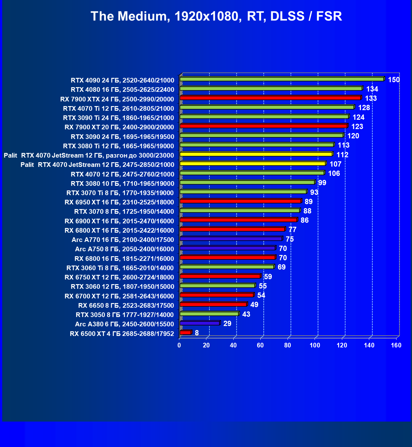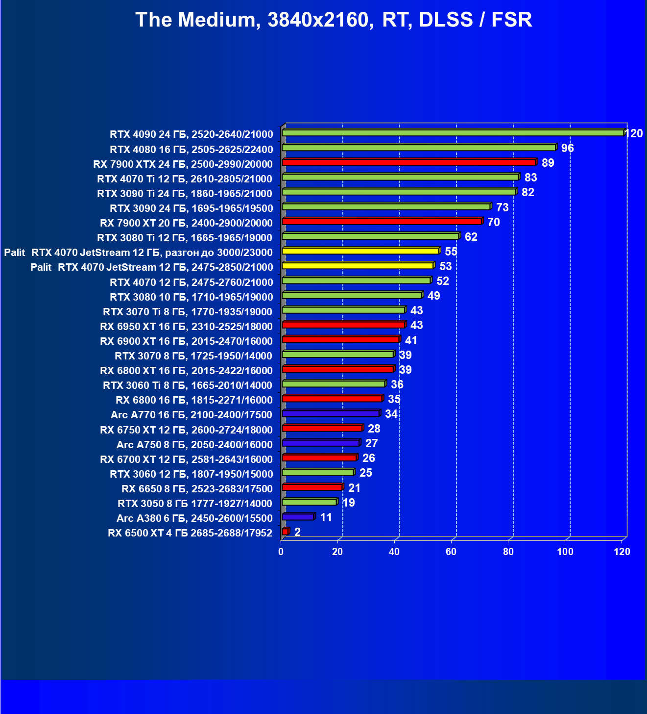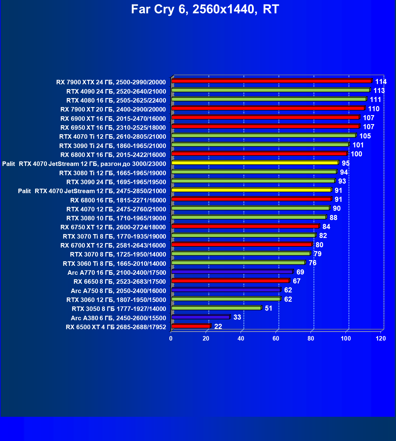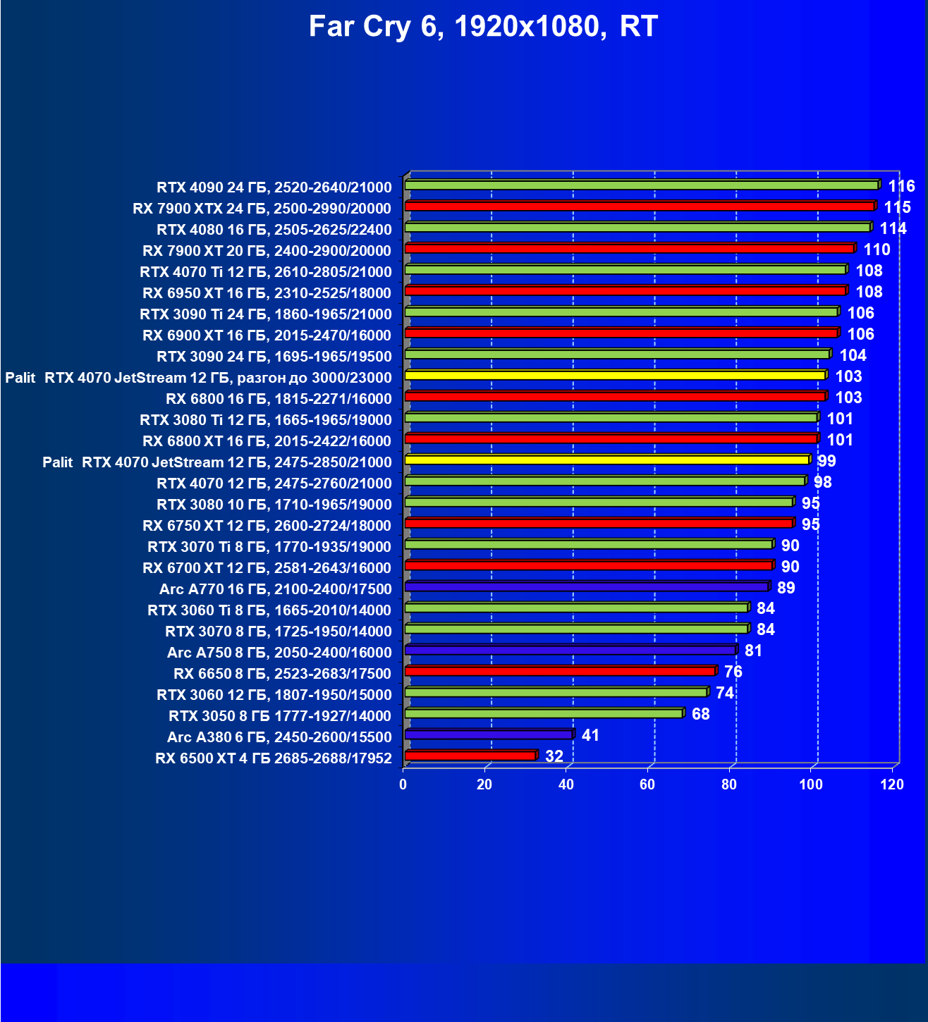 | 06 | Palit RTX 4070 JetStream 12 ГБ, 2475—2850/21000 | 118 | 736 | 62 500 |