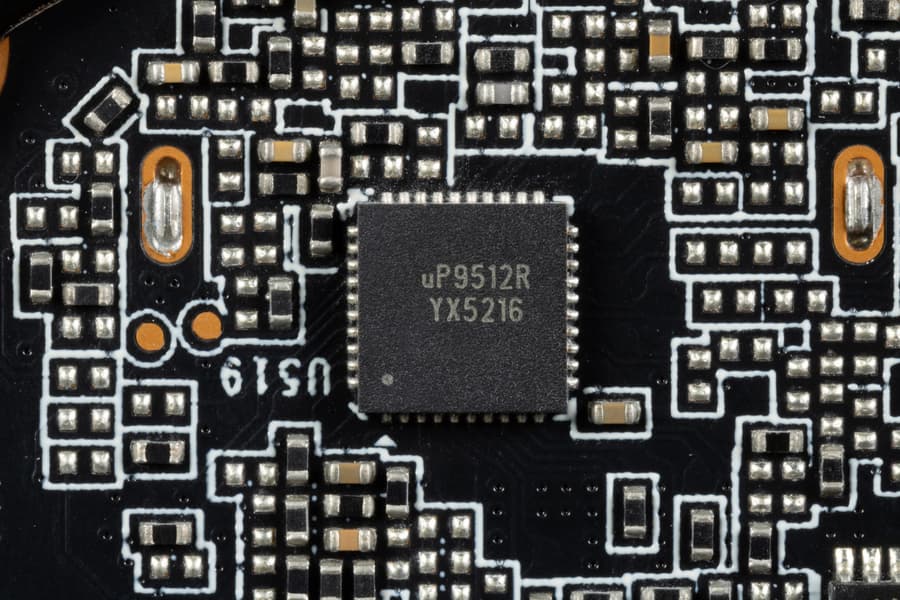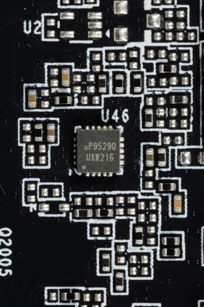 6 фазами питания ядра управляет ШИМ-контроллер uP9512R (uPI Semiconductor) расположенный на оборотной стороне PCB. Он рассчитан максимум на 12 фаз.