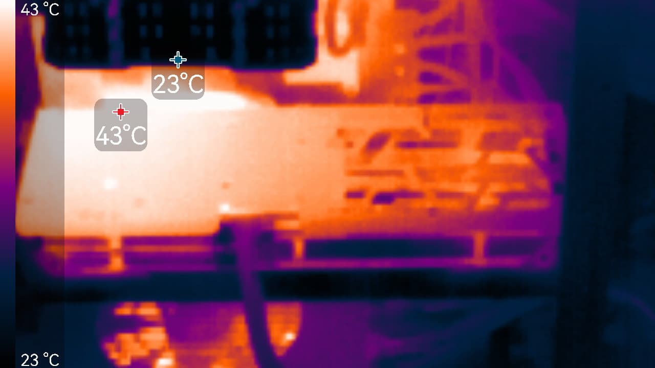 Максимальный нагрев наблюдался с обратной стороны у разъема PCI-E, а также в области преобразователей питания VRM.