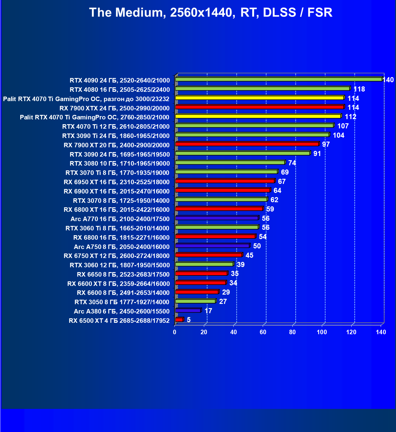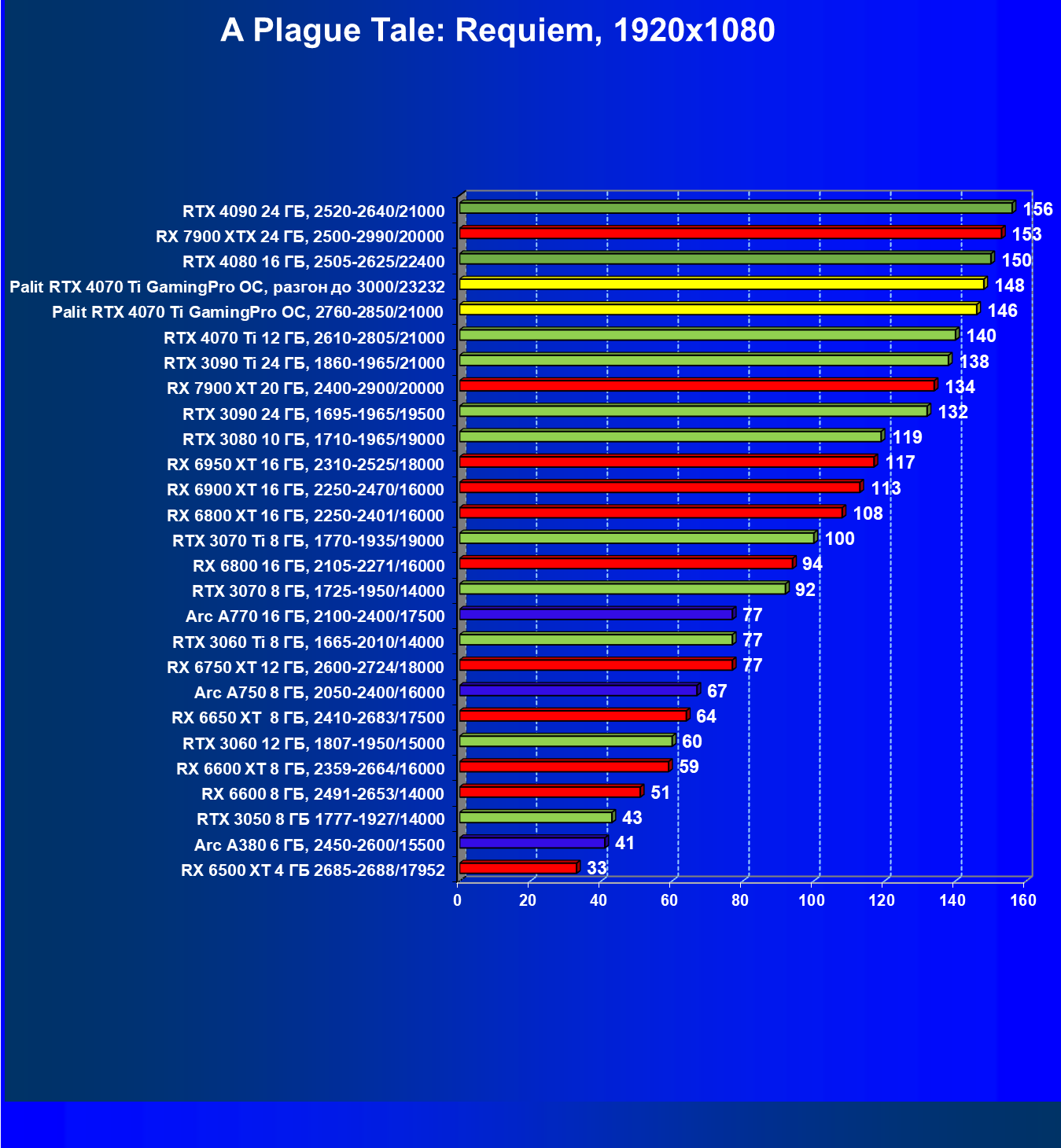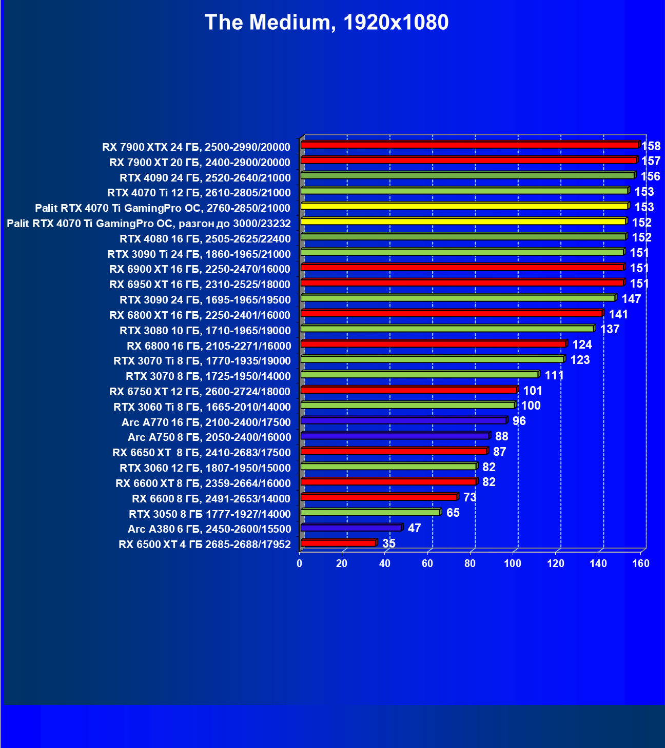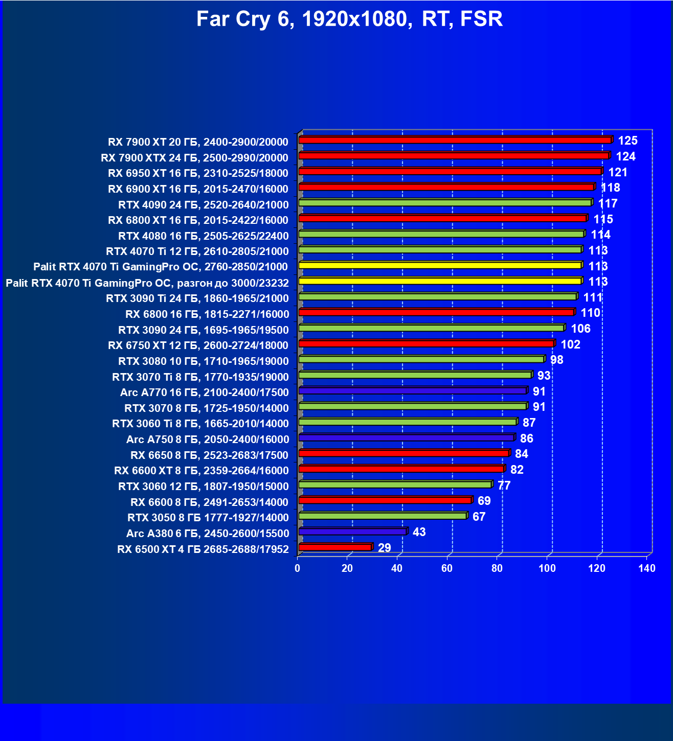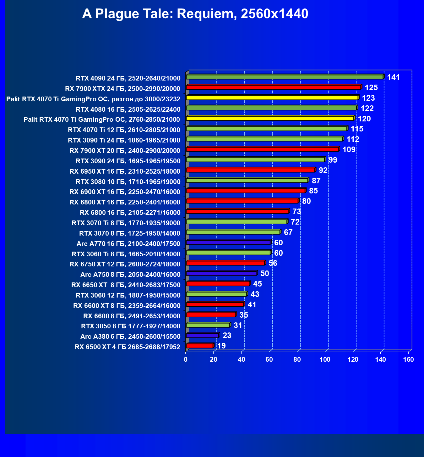 Вот здесь (из-за большей уязвимости производительности карт клана Radeon при использовании RT) уже совсем иная картина: и RTX 4070 Ti одержал верх даже над RX 7900 XTX (чуть-чуть, но быстрее, а карта Palit засчет фабричного разгона этот разрыв чуть увеличила). При этом RTX 4070 Ti оказался быстрее, чем RX 7900 XT на 14%, что полностью затмевает предыдущее поражении в сражении в классических играх.