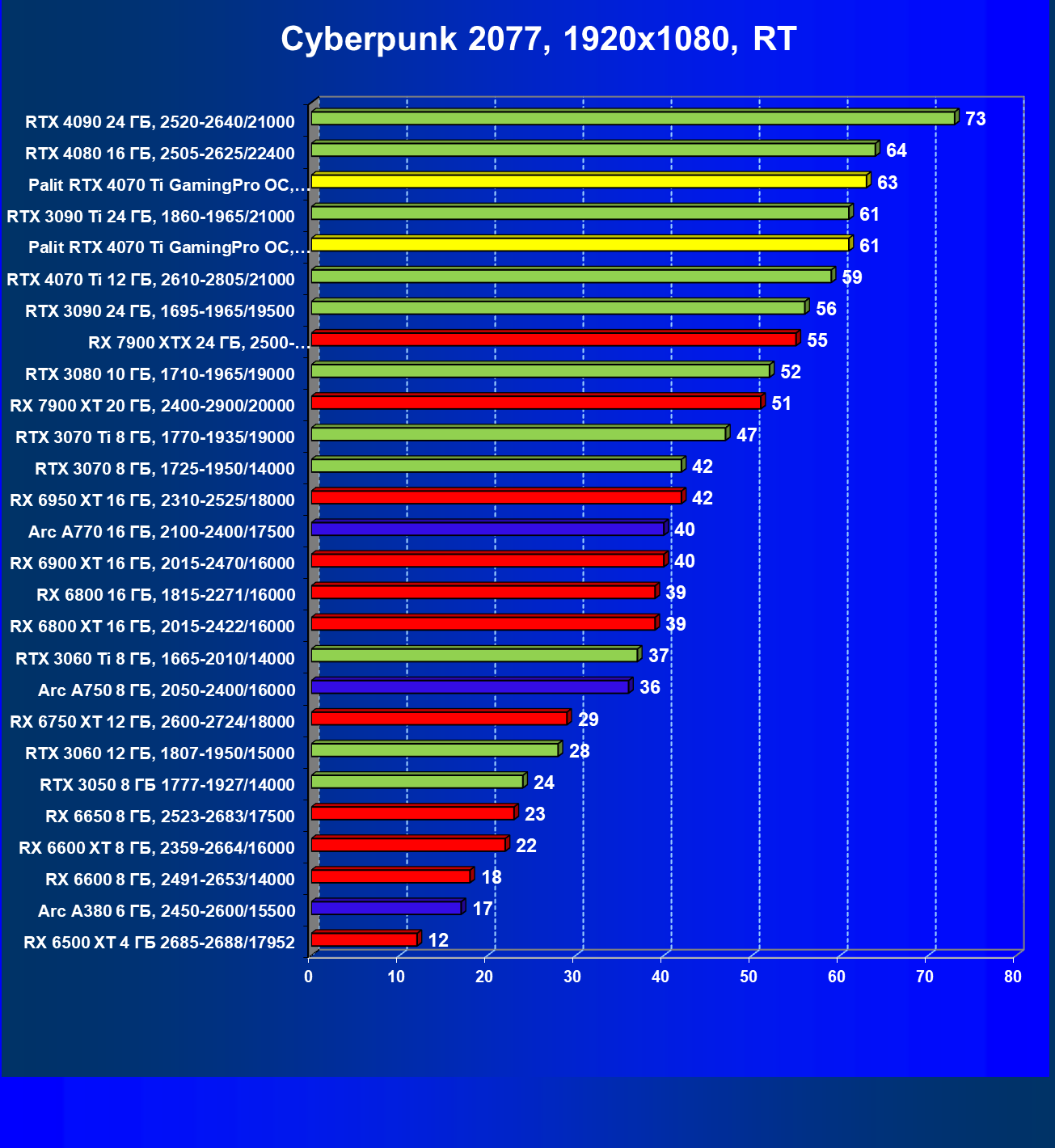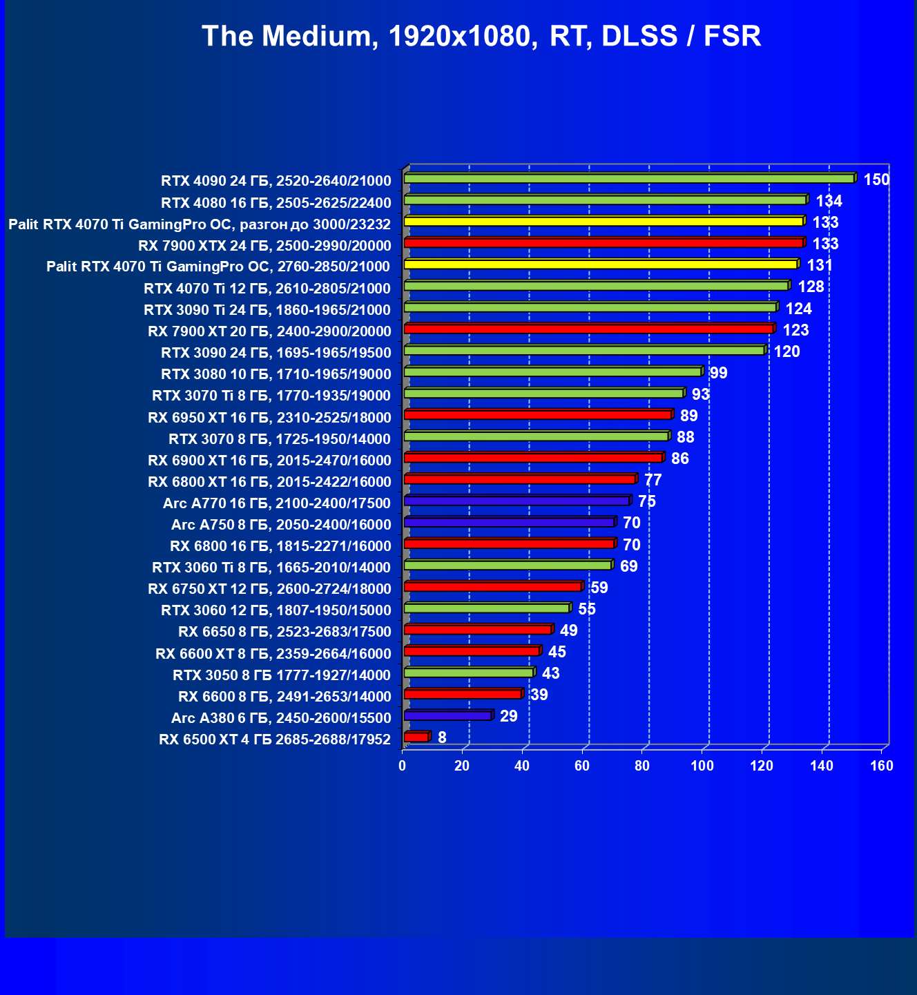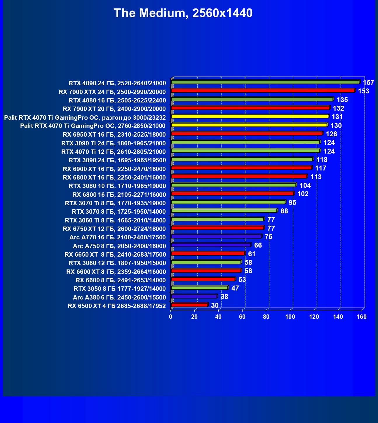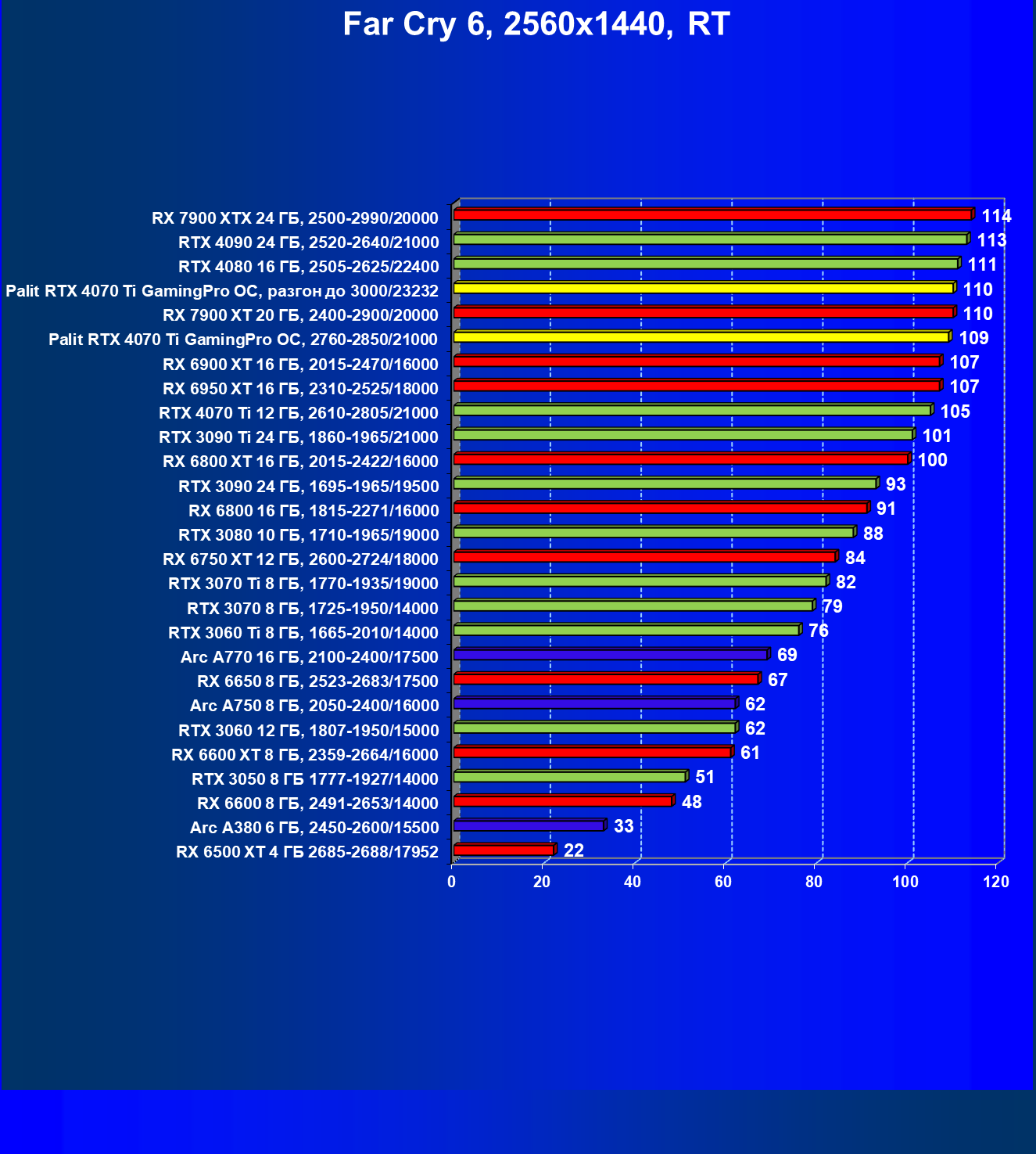 Вот здесь (из-за большей уязвимости производительности карт клана Radeon при использовании RT) уже совсем иная картина: и RTX 4070 Ti одержал верх даже над RX 7900 XTX (чуть-чуть, но быстрее, а карта Palit засчет фабричного разгона этот разрыв чуть увеличила). При этом RTX 4070 Ti оказался быстрее, чем RX 7900 XT на 14%, что полностью затмевает предыдущее поражении в сражении в классических играх.
