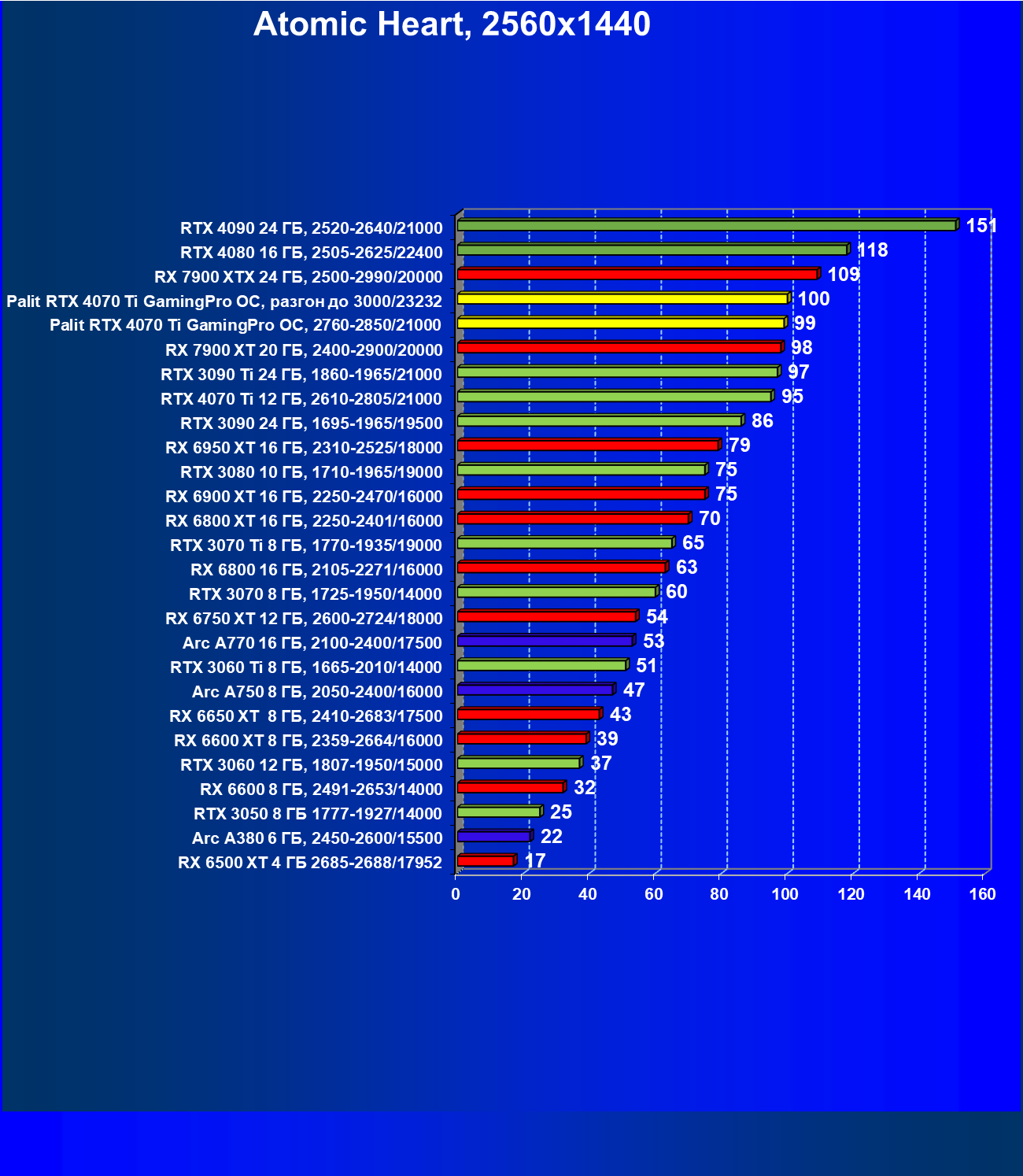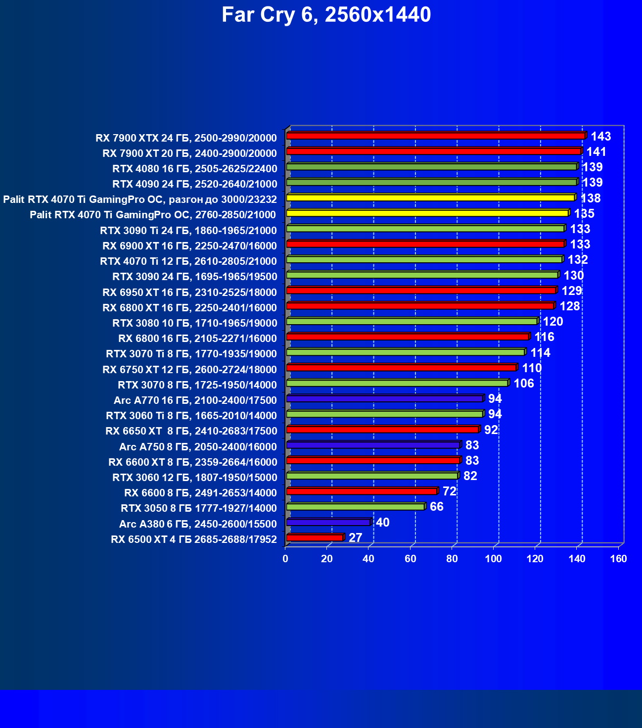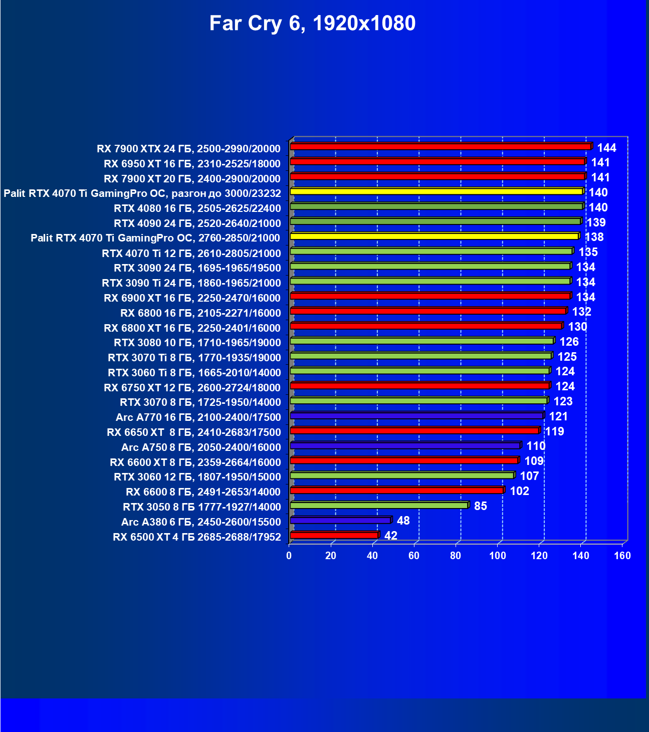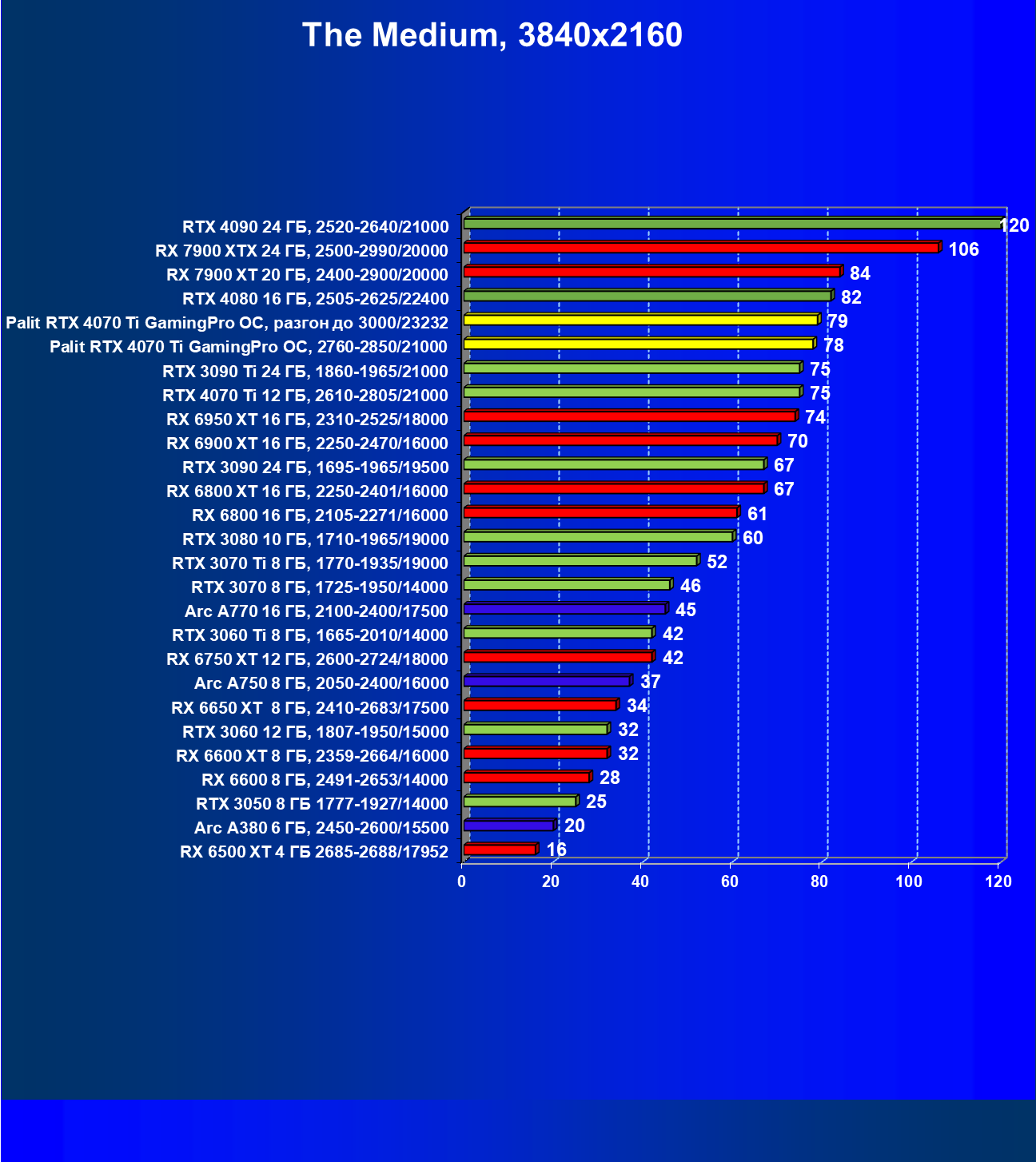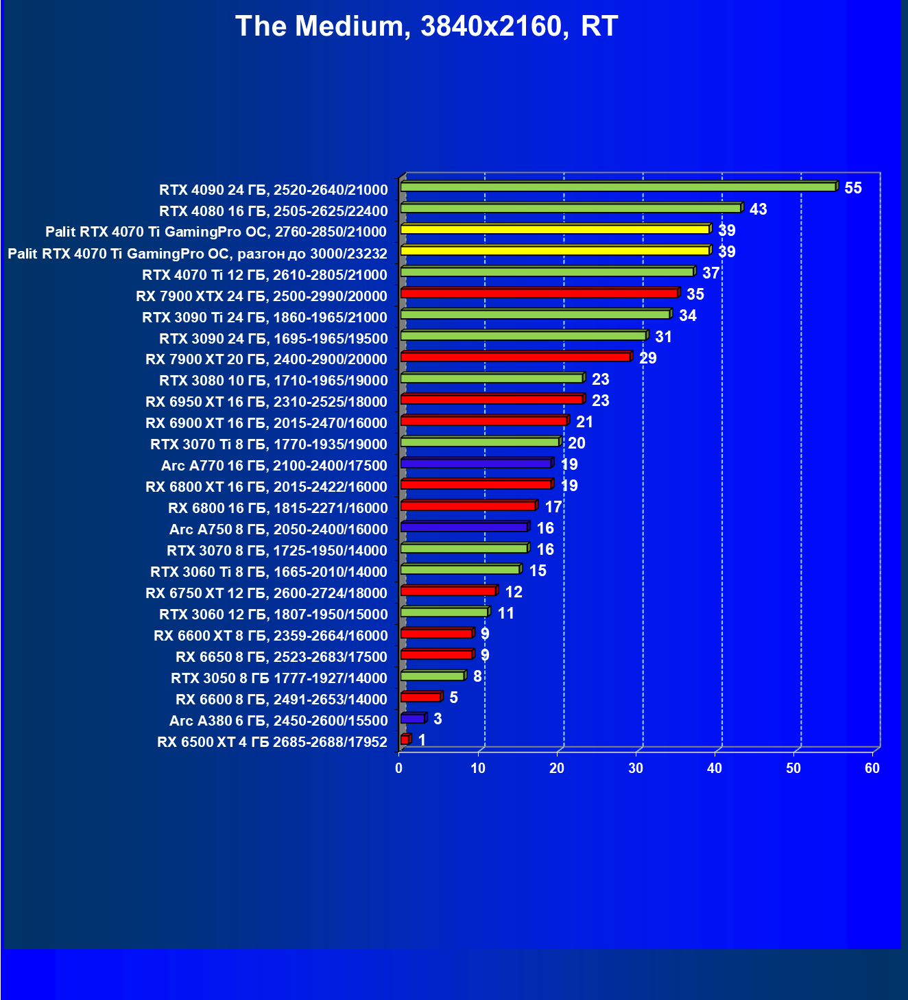 Вот здесь (из-за большей уязвимости производительности карт клана Radeon при использовании RT) уже совсем иная картина: и RTX 4070 Ti одержал верх даже над RX 7900 XTX (чуть-чуть, но быстрее, а карта Palit засчет фабричного разгона этот разрыв чуть увеличила). При этом RTX 4070 Ti оказался быстрее, чем RX 7900 XT на 14%, что полностью затмевает предыдущее поражении в сражении в классических играх.
