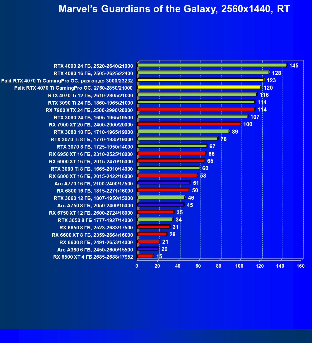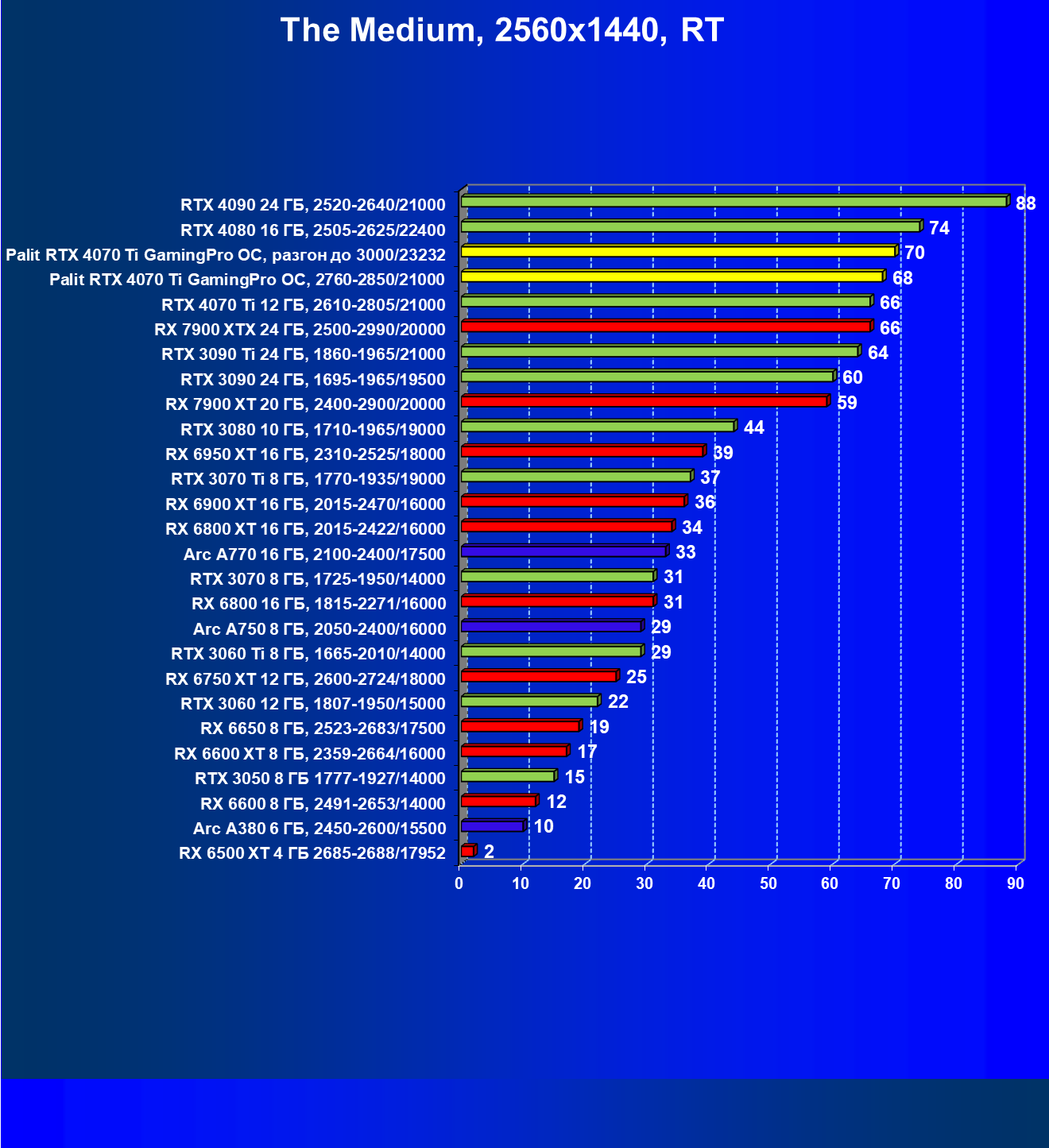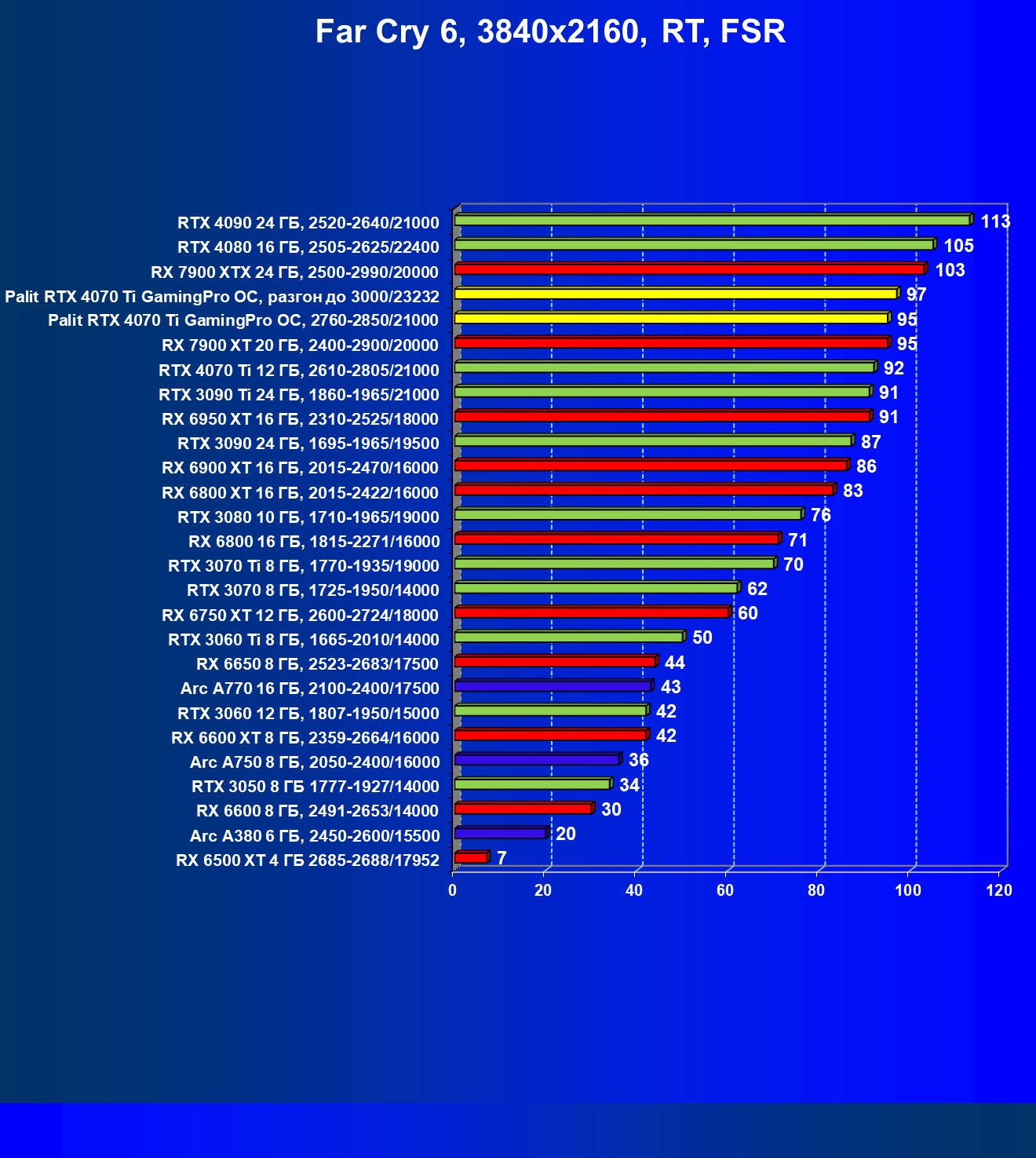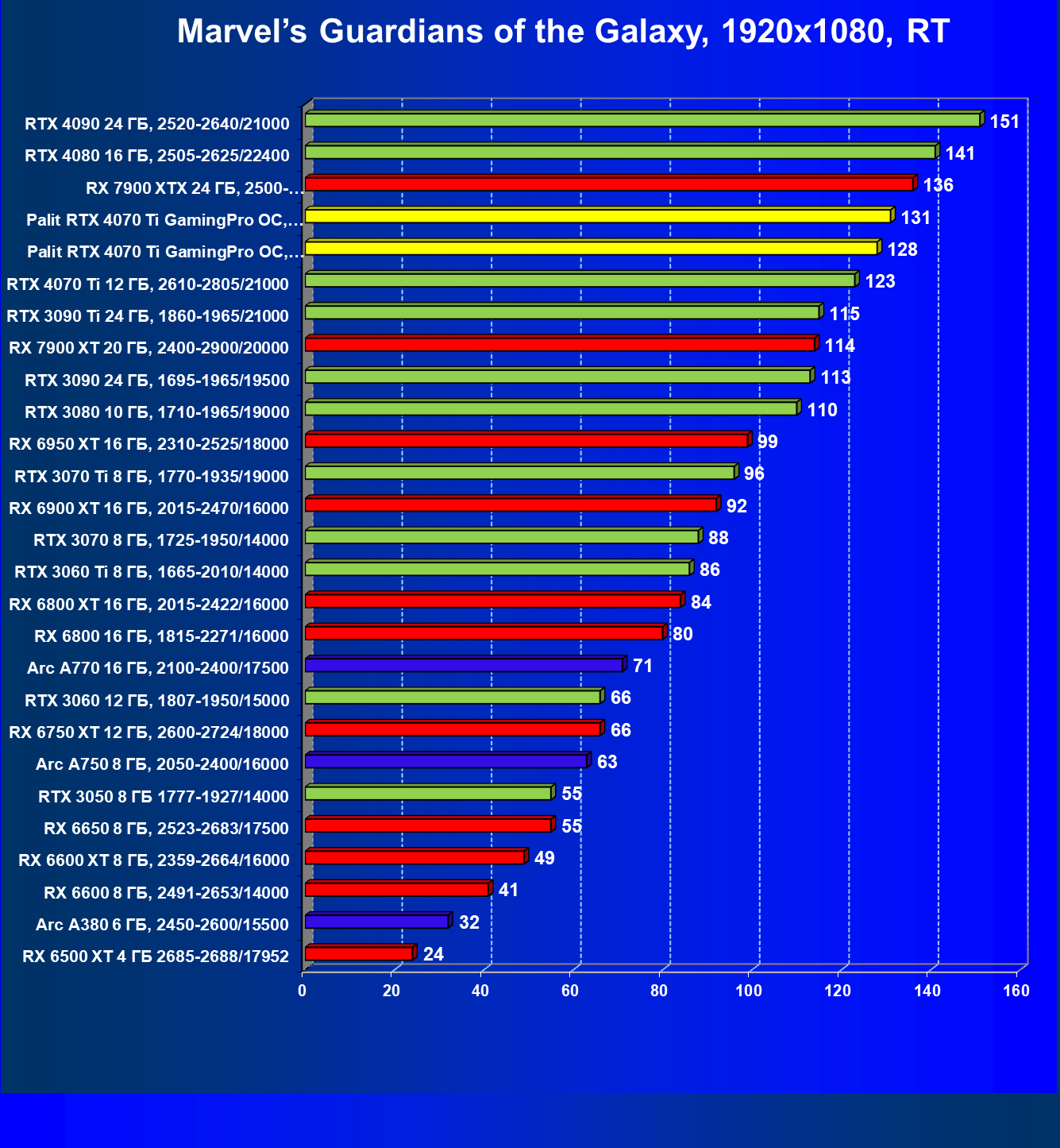 Вот здесь (из-за большей уязвимости производительности карт клана Radeon при использовании RT) уже совсем иная картина: и RTX 4070 Ti одержал верх даже над RX 7900 XTX (чуть-чуть, но быстрее, а карта Palit засчет фабричного разгона этот разрыв чуть увеличила). При этом RTX 4070 Ti оказался быстрее, чем RX 7900 XT на 14%, что полностью затмевает предыдущее поражении в сражении в классических играх.
