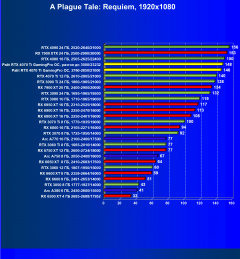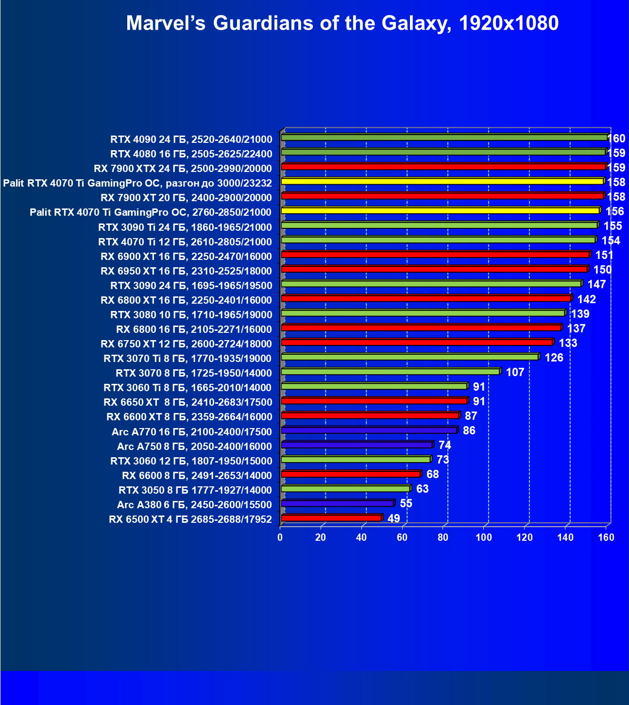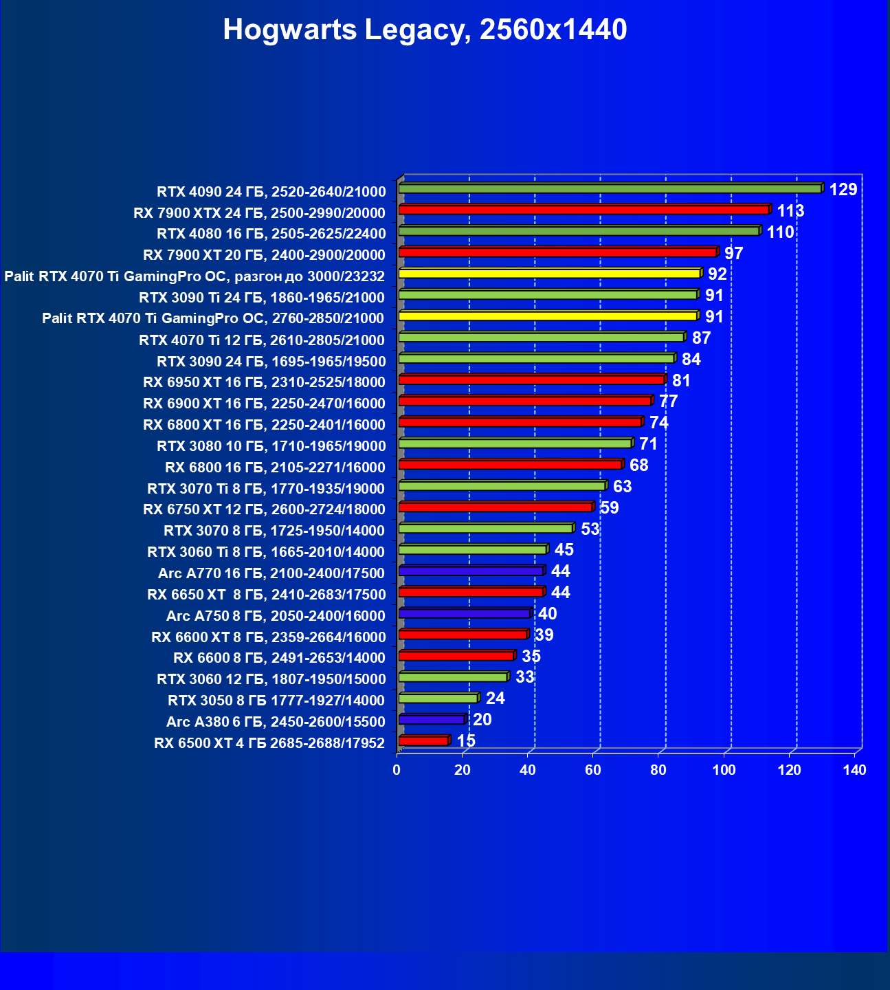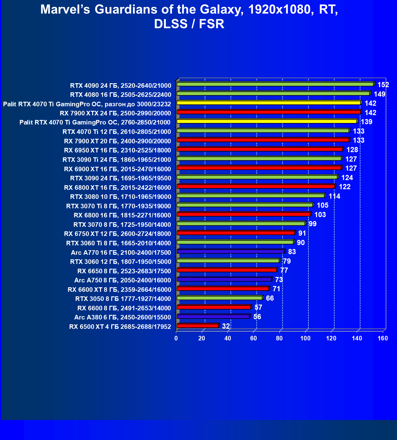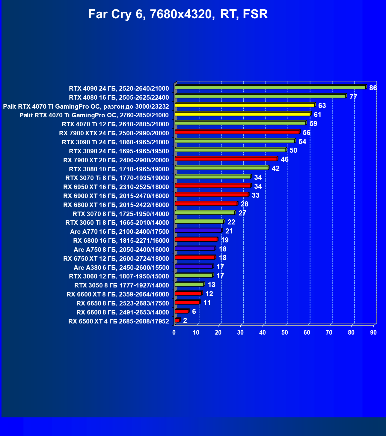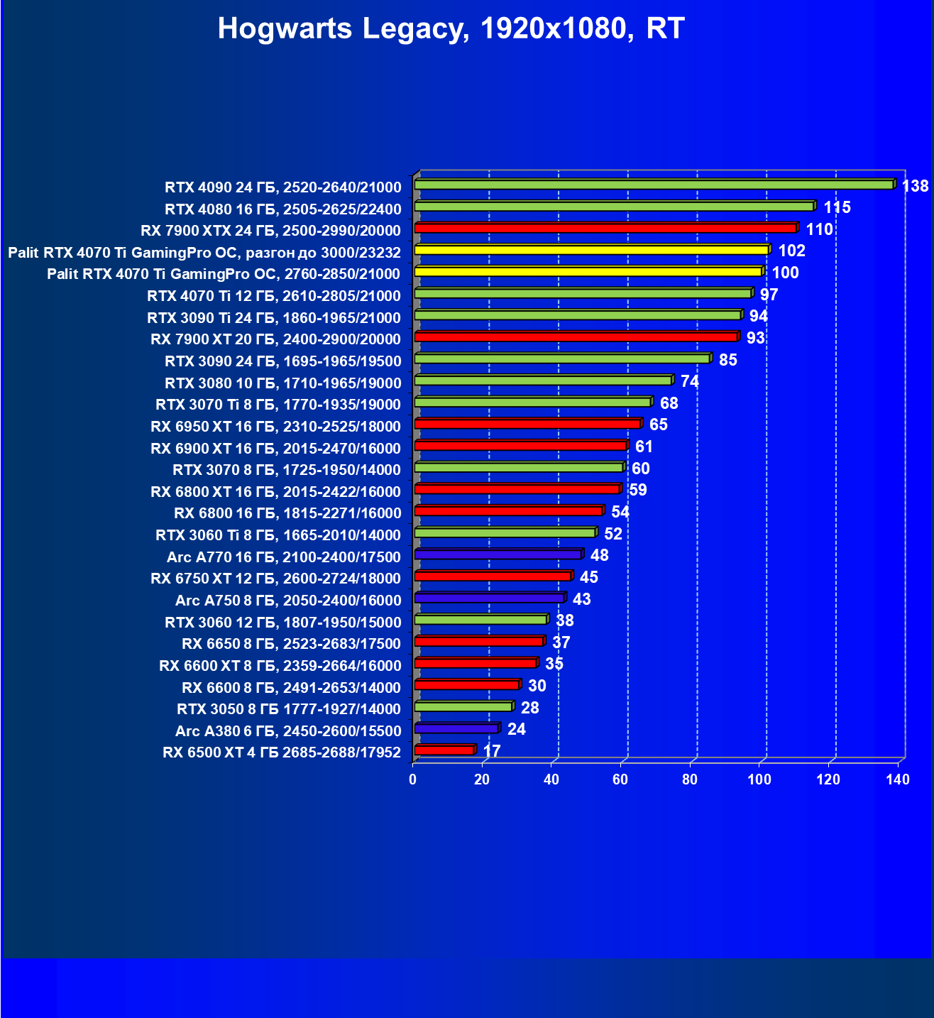 Вот здесь (из-за большей уязвимости производительности карт клана Radeon при использовании RT) уже совсем иная картина: и RTX 4070 Ti одержал верх даже над RX 7900 XTX (чуть-чуть, но быстрее, а карта Palit засчет фабричного разгона этот разрыв чуть увеличила). При этом RTX 4070 Ti оказался быстрее, чем RX 7900 XT на 14%, что полностью затмевает предыдущее поражении в сражении в классических играх.