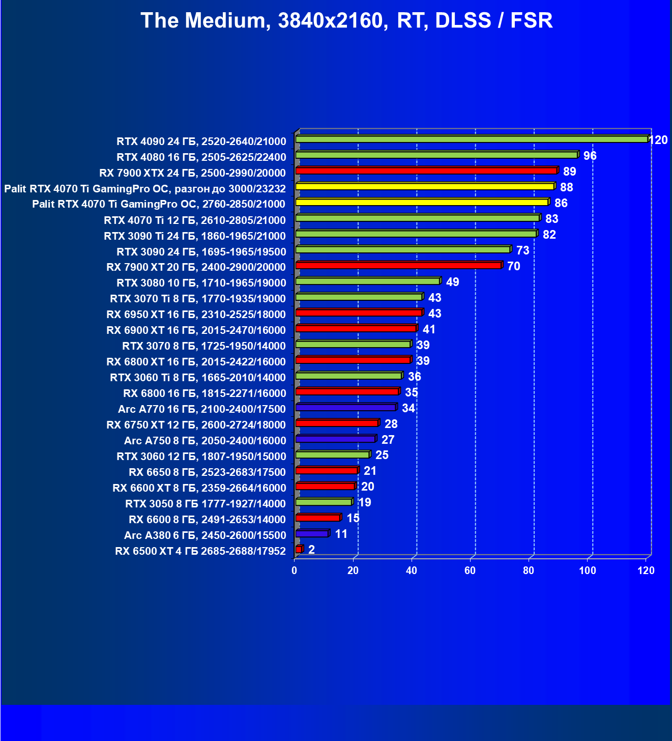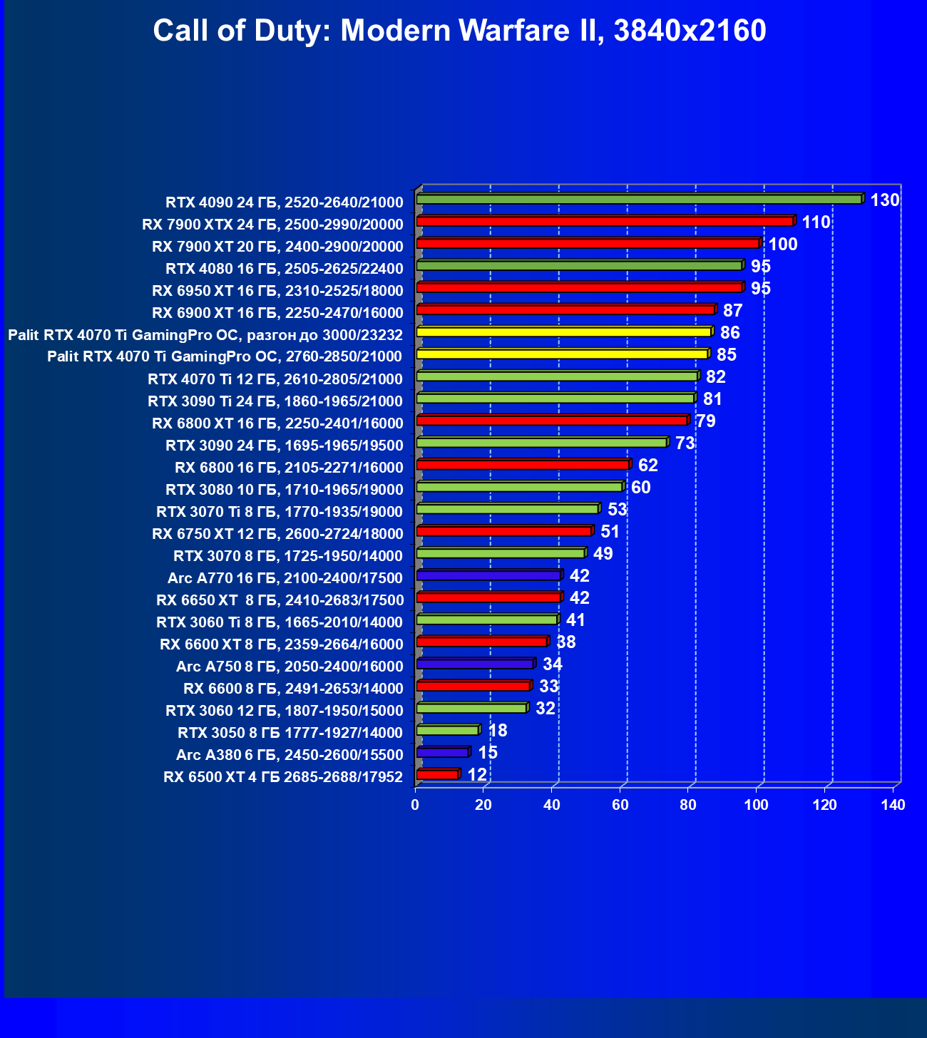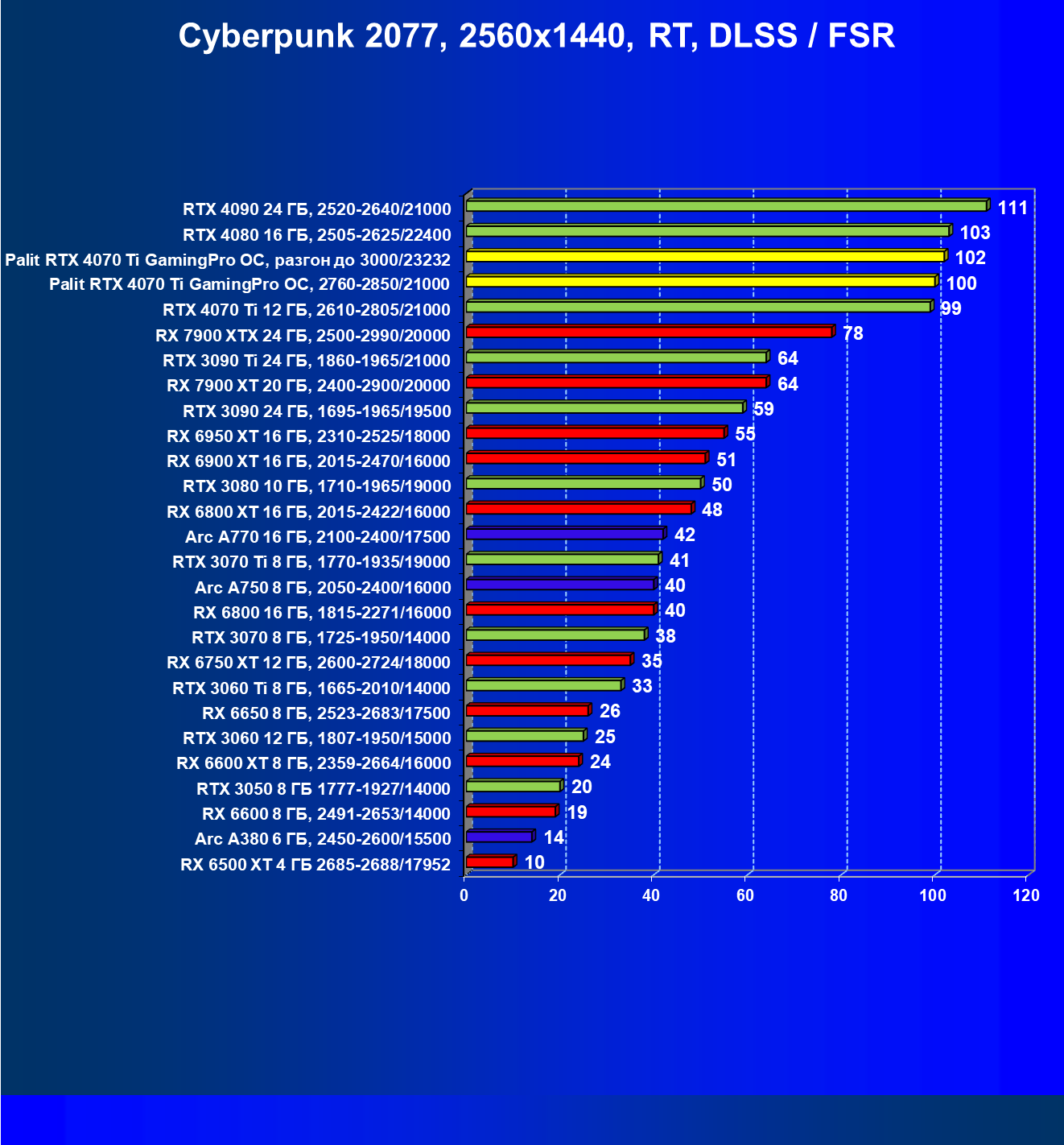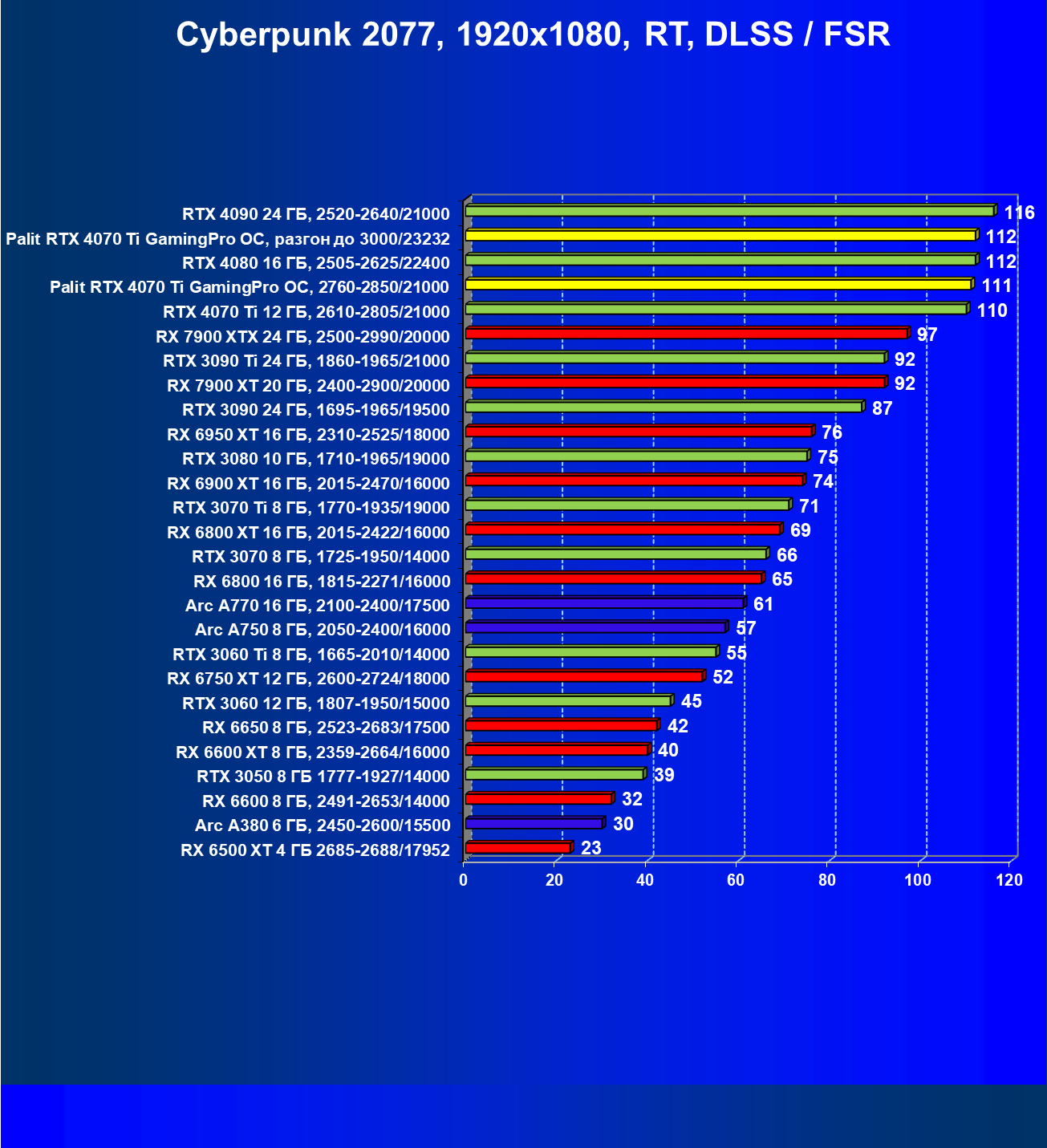 | 02 | Palit RTX 4070 Ti GamingPro OC, разгон до 3000/23232 | 130 | 999 | 77 000 |