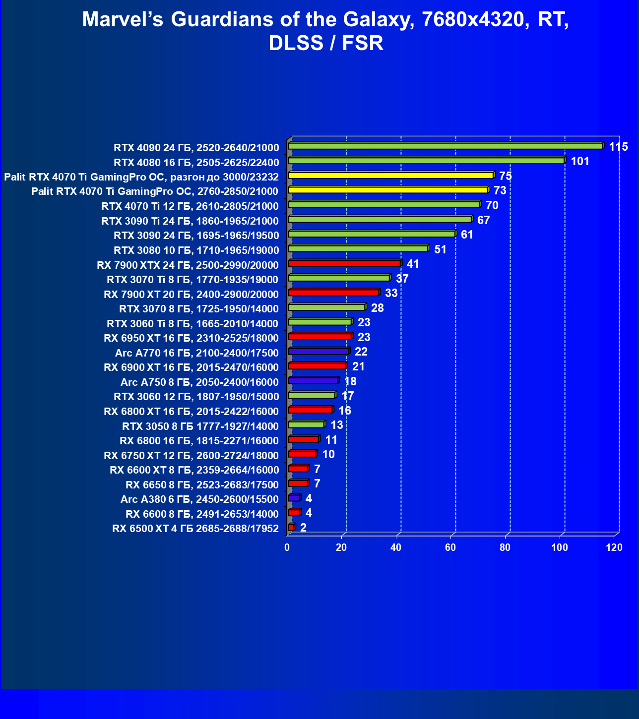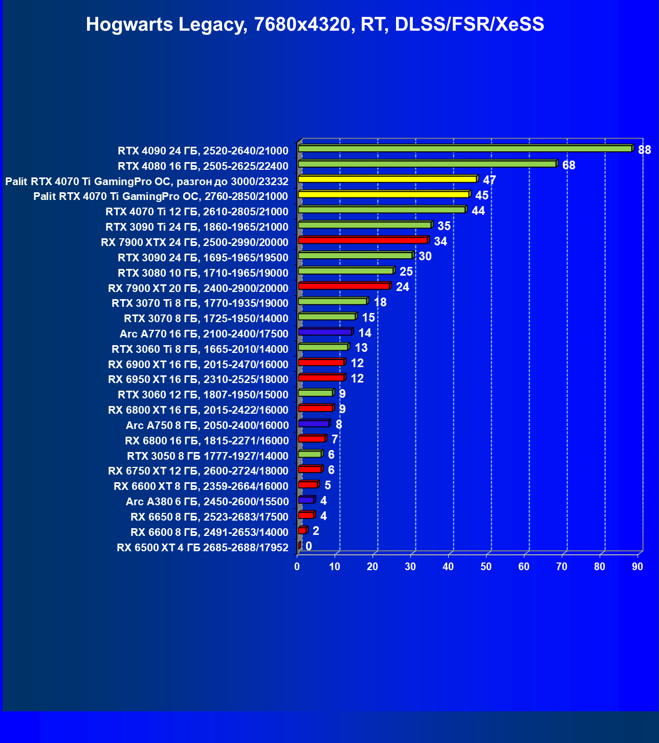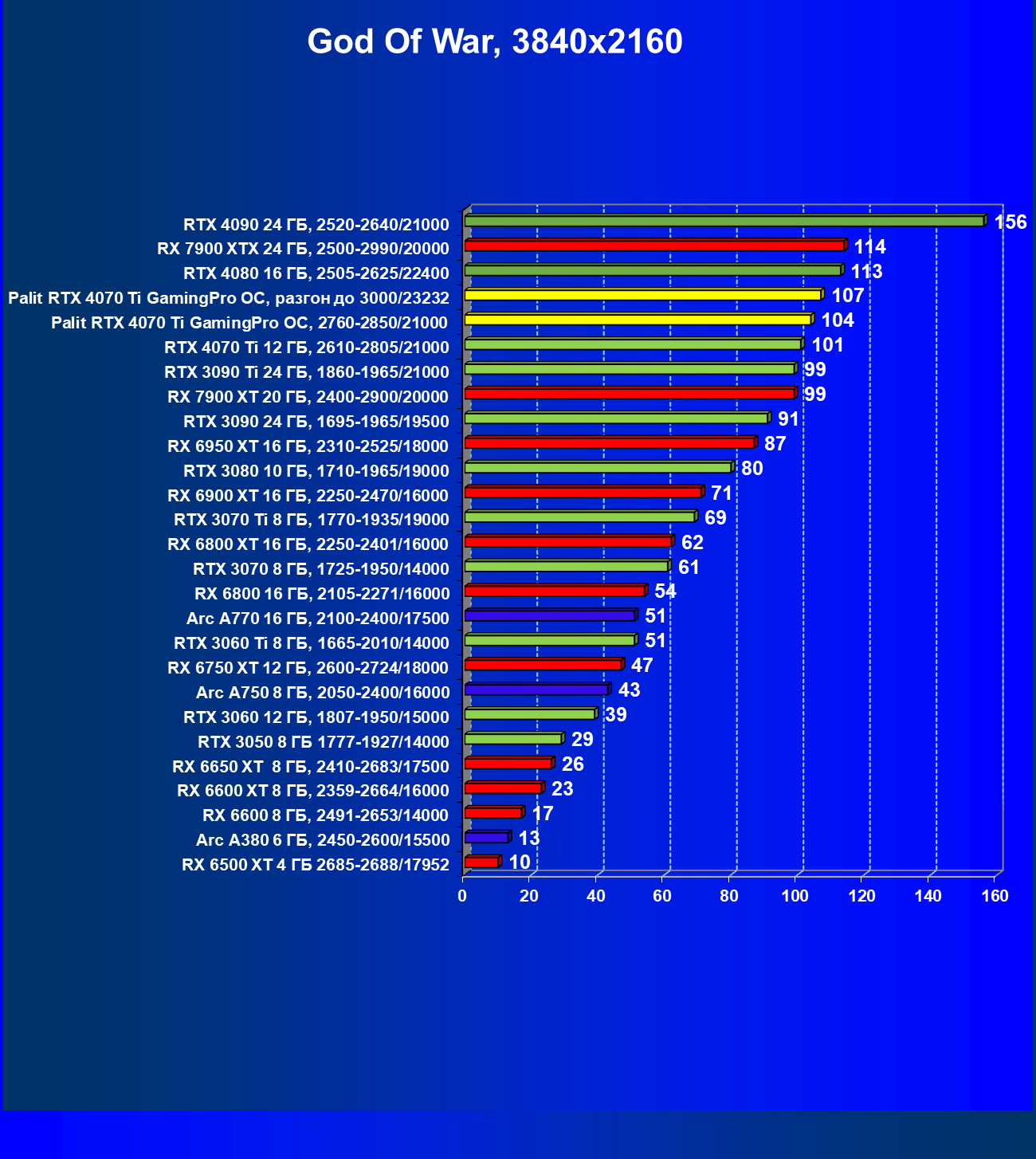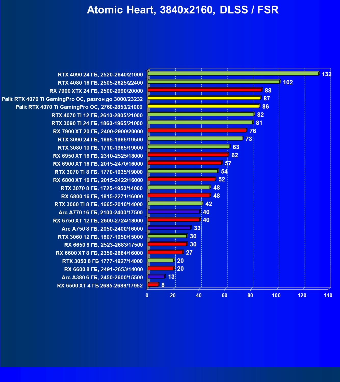 | 02 | Palit RTX 4070 Ti GamingPro OC, разгон до 3000/23232 | 130 | 999 | 77 000 |