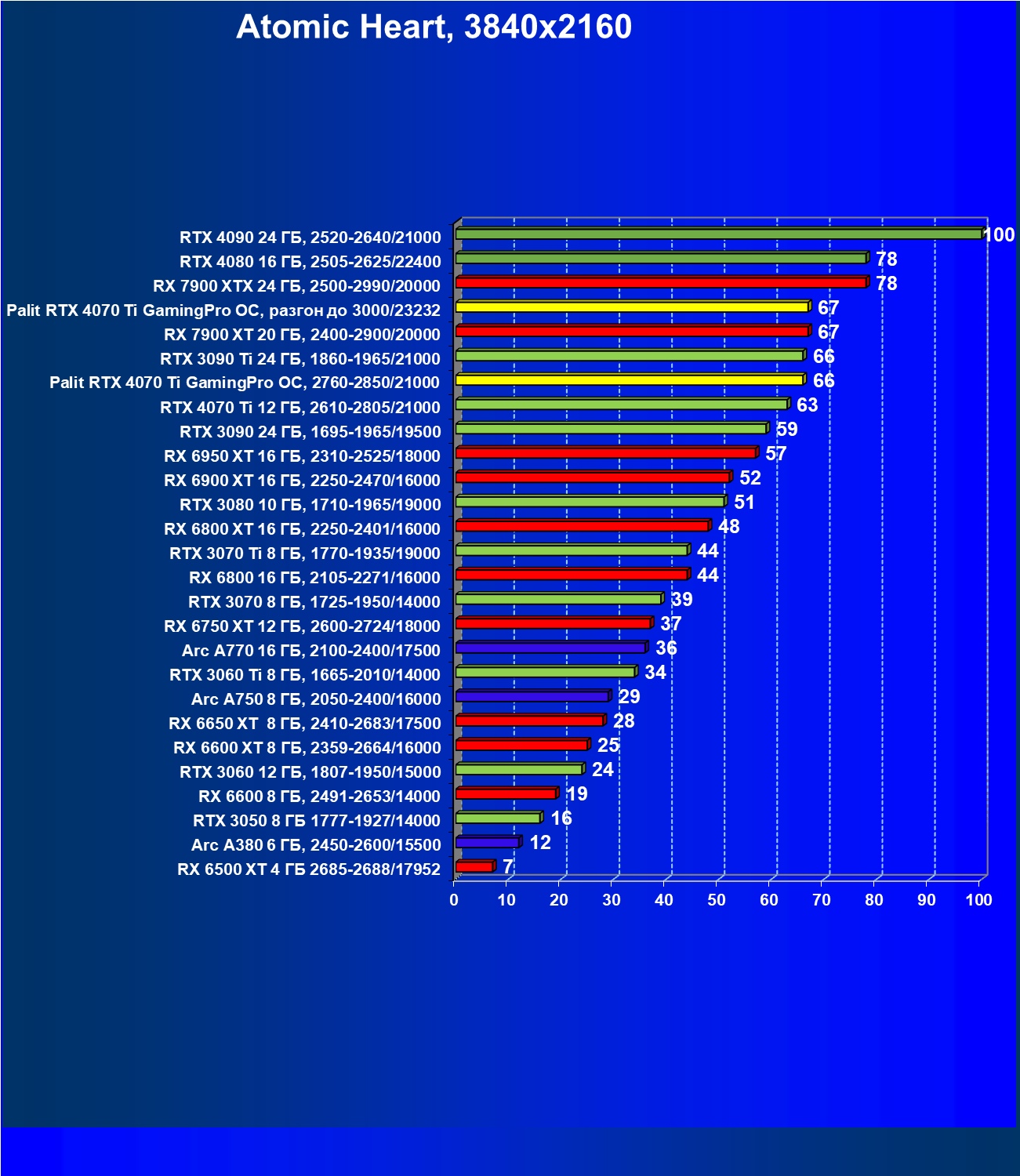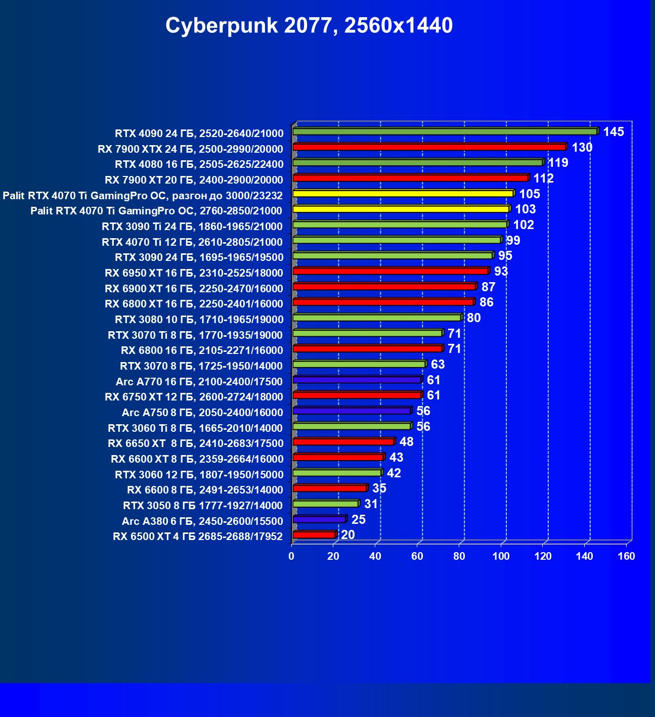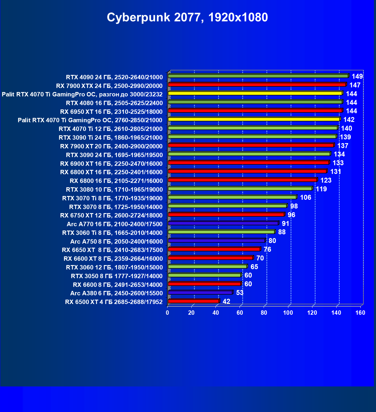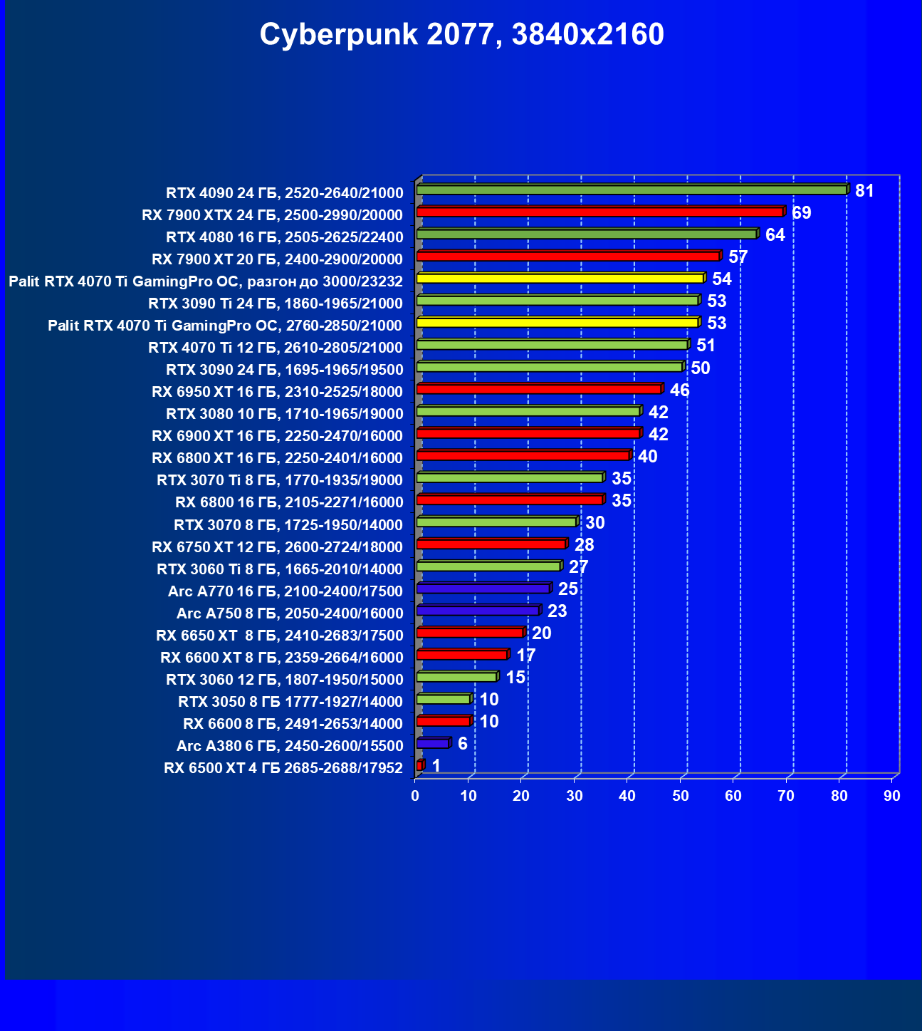 | 05 | Palit RTX 4070 Ti GamingPro OC, разгон до 3000/23232 | 999 | 130 | 77 000 |
