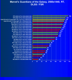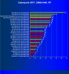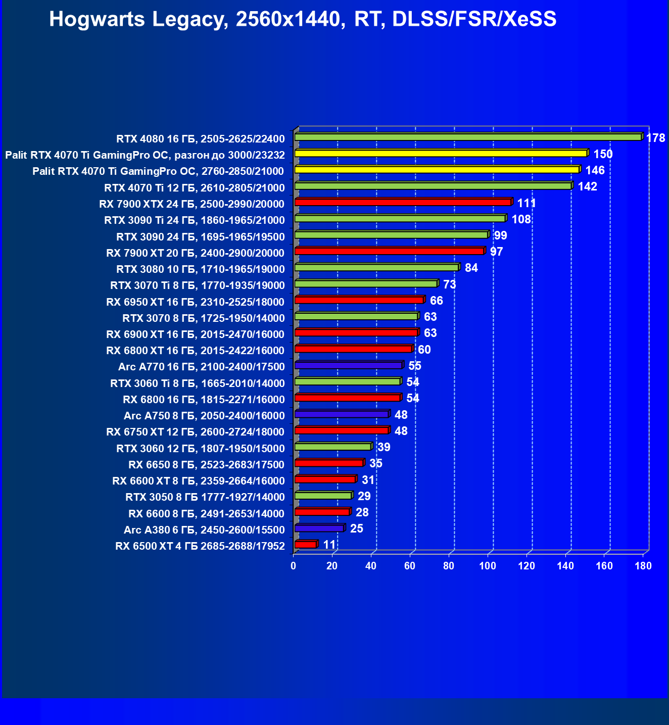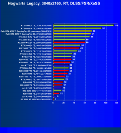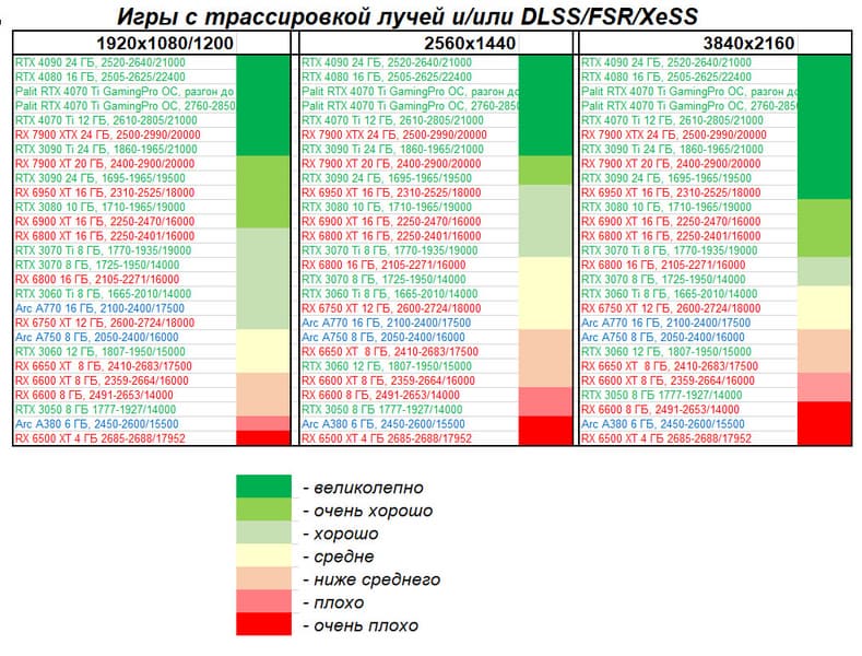 - Результаты тестов со включенной аппаратной трассировкой лучей и/или DLSS/FSR/XeSS в разрешениях 1920×1080, 2560×1440 и 3840×2160