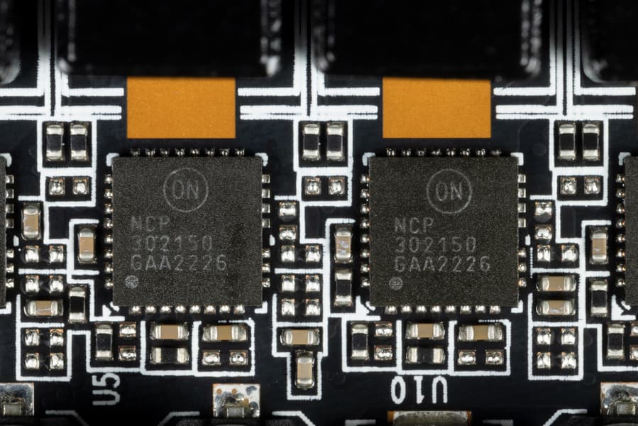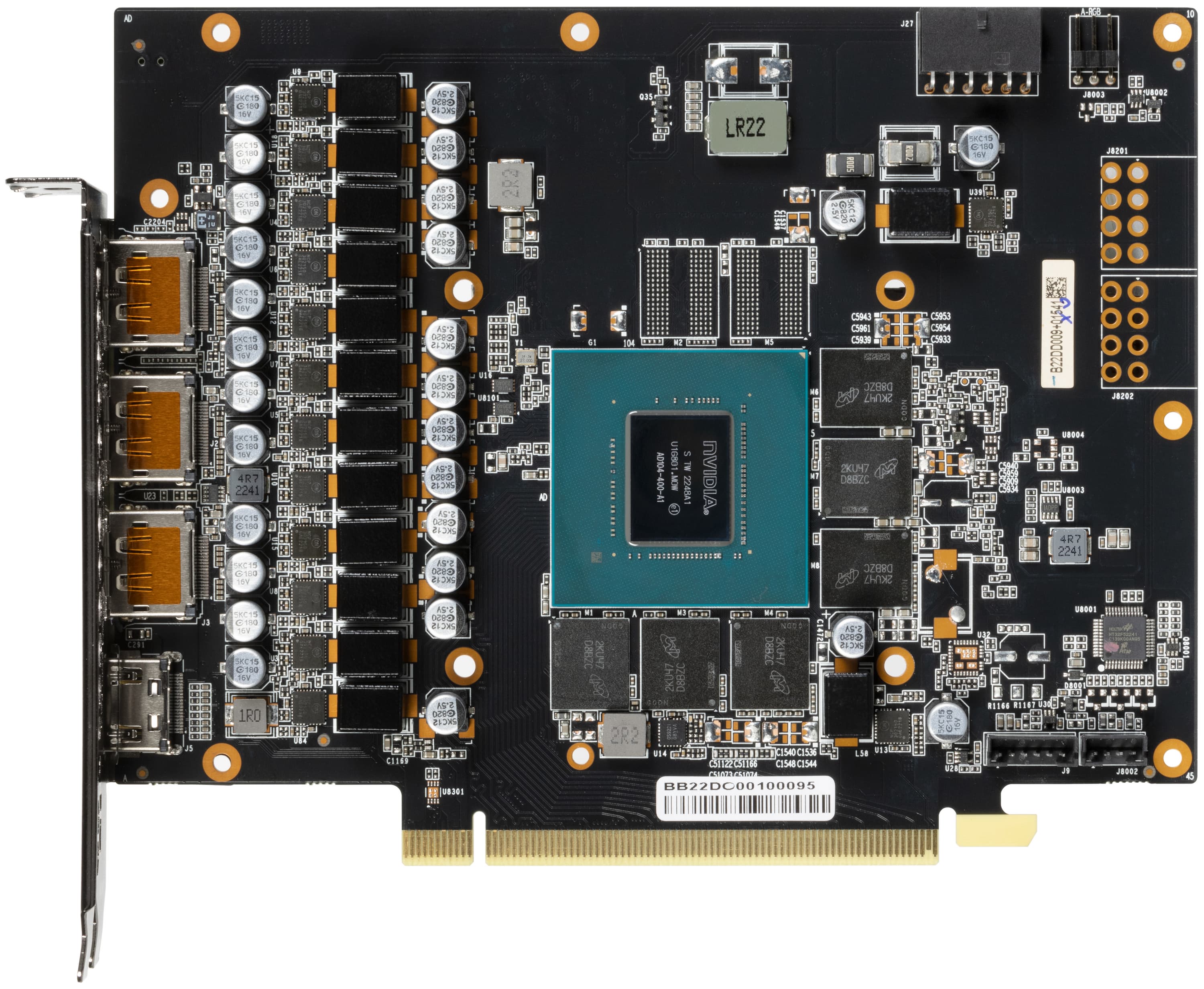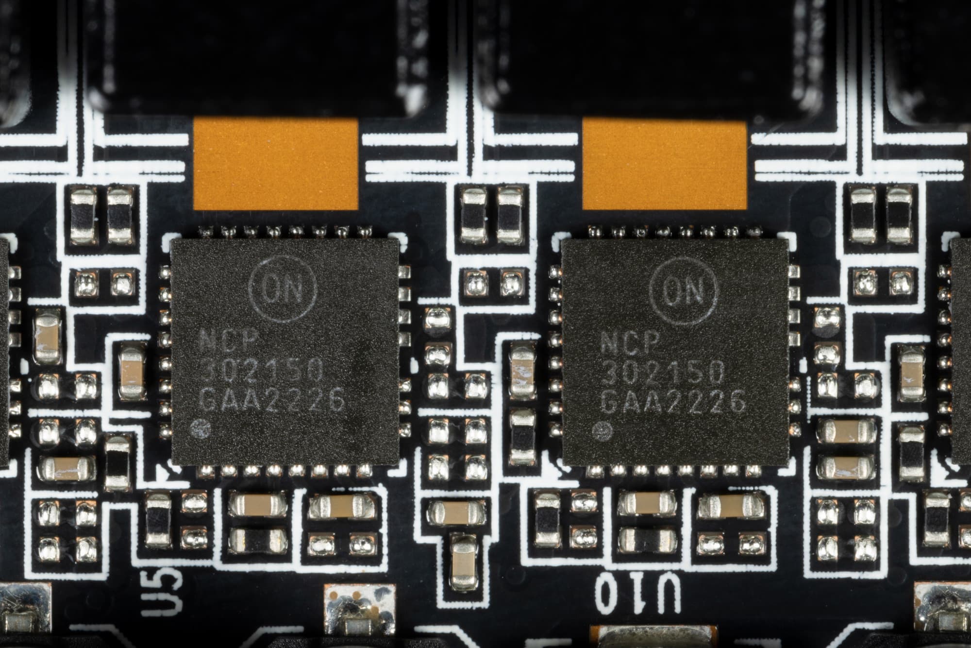В преобразователе питания, традиционно для всех видеокарт Nvidia, используются транзисторные сборки DrMOS — в данном случае NCP302150 (On Semi), каждая из которых рассчитана максимально на 50 А.