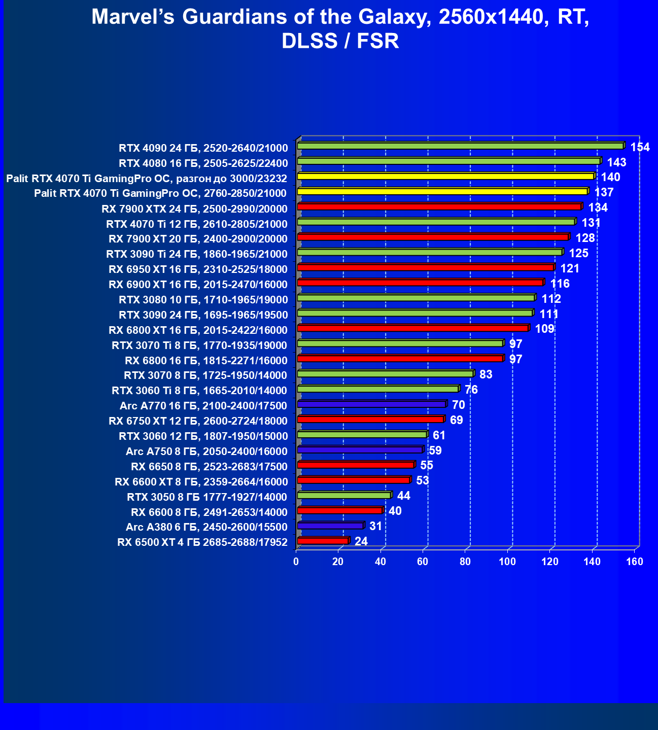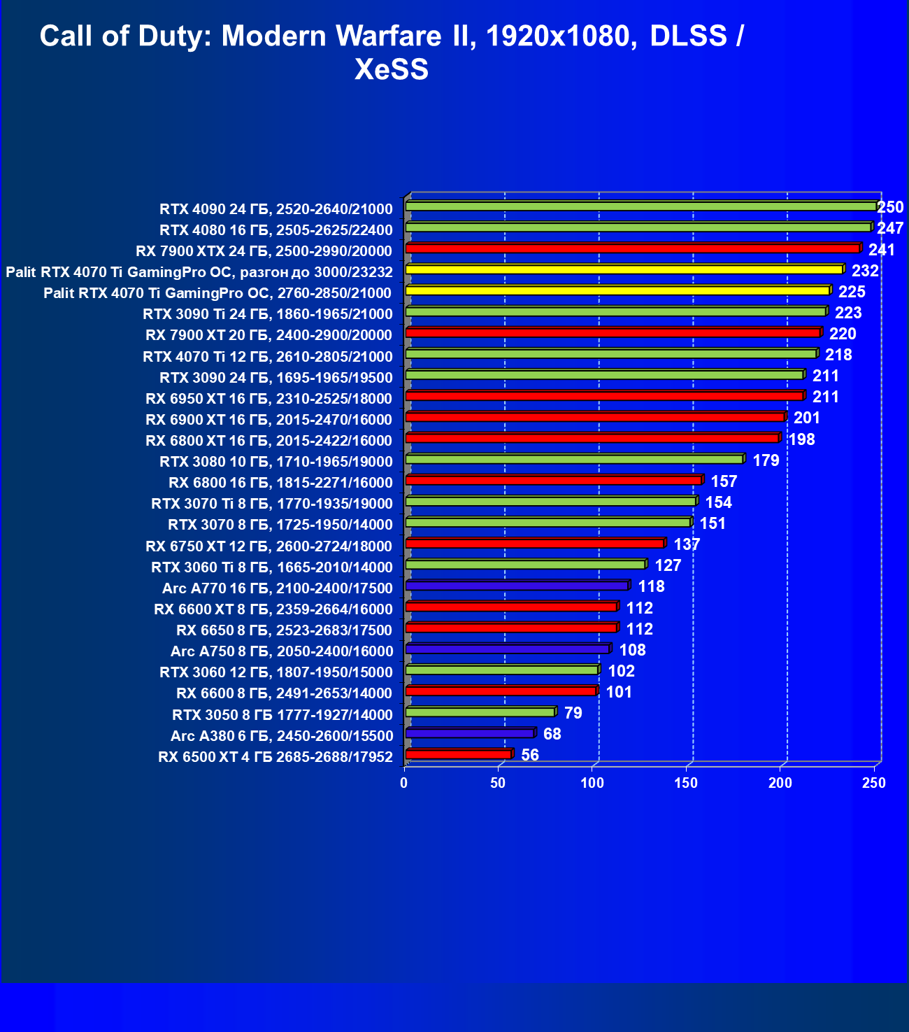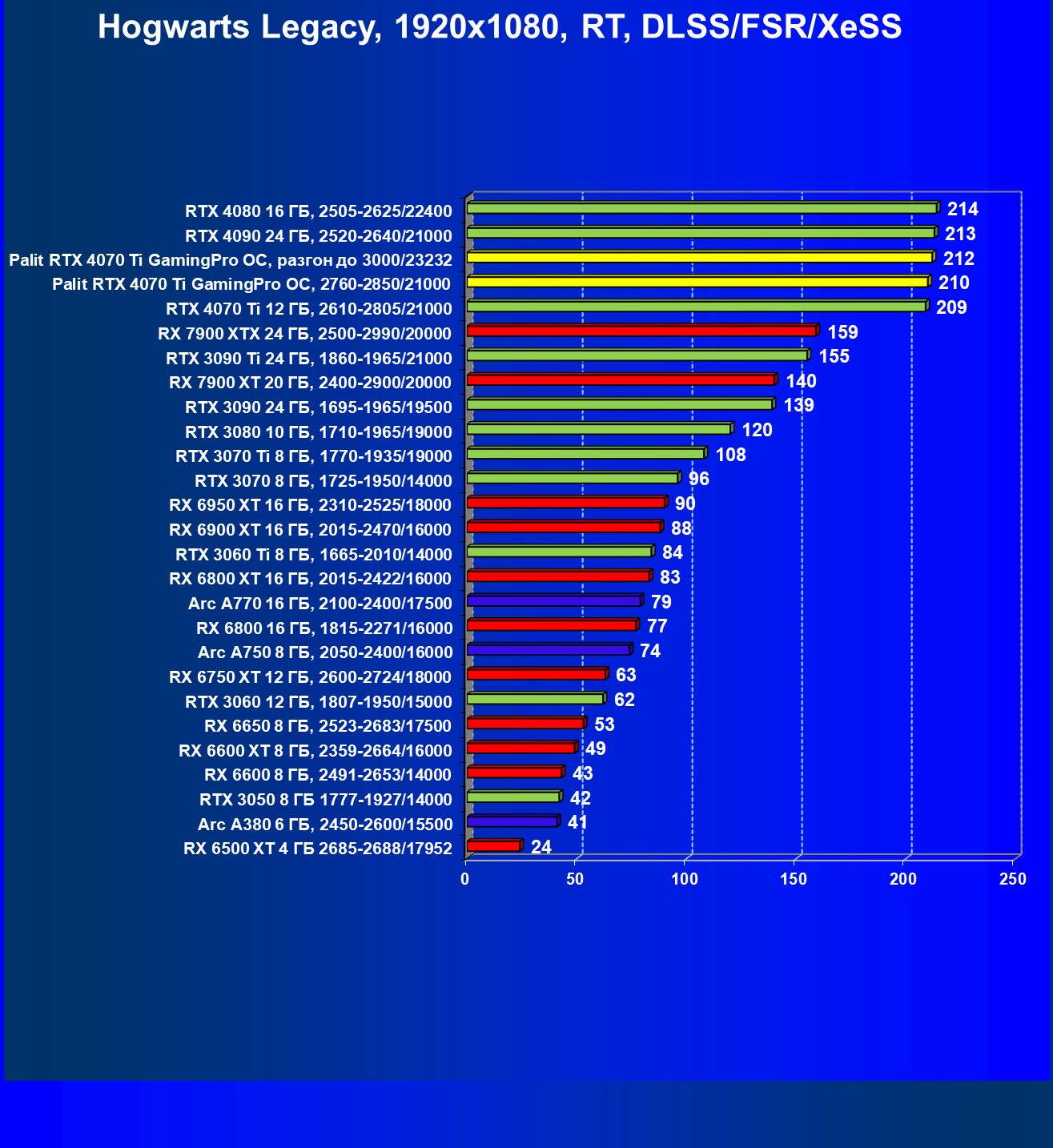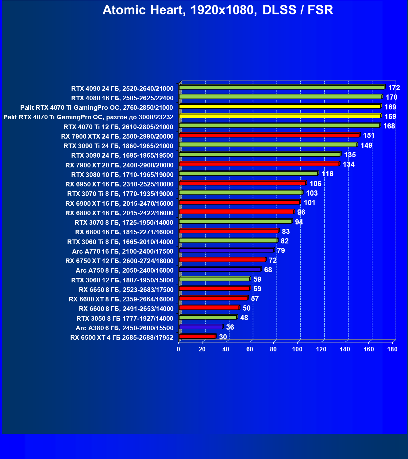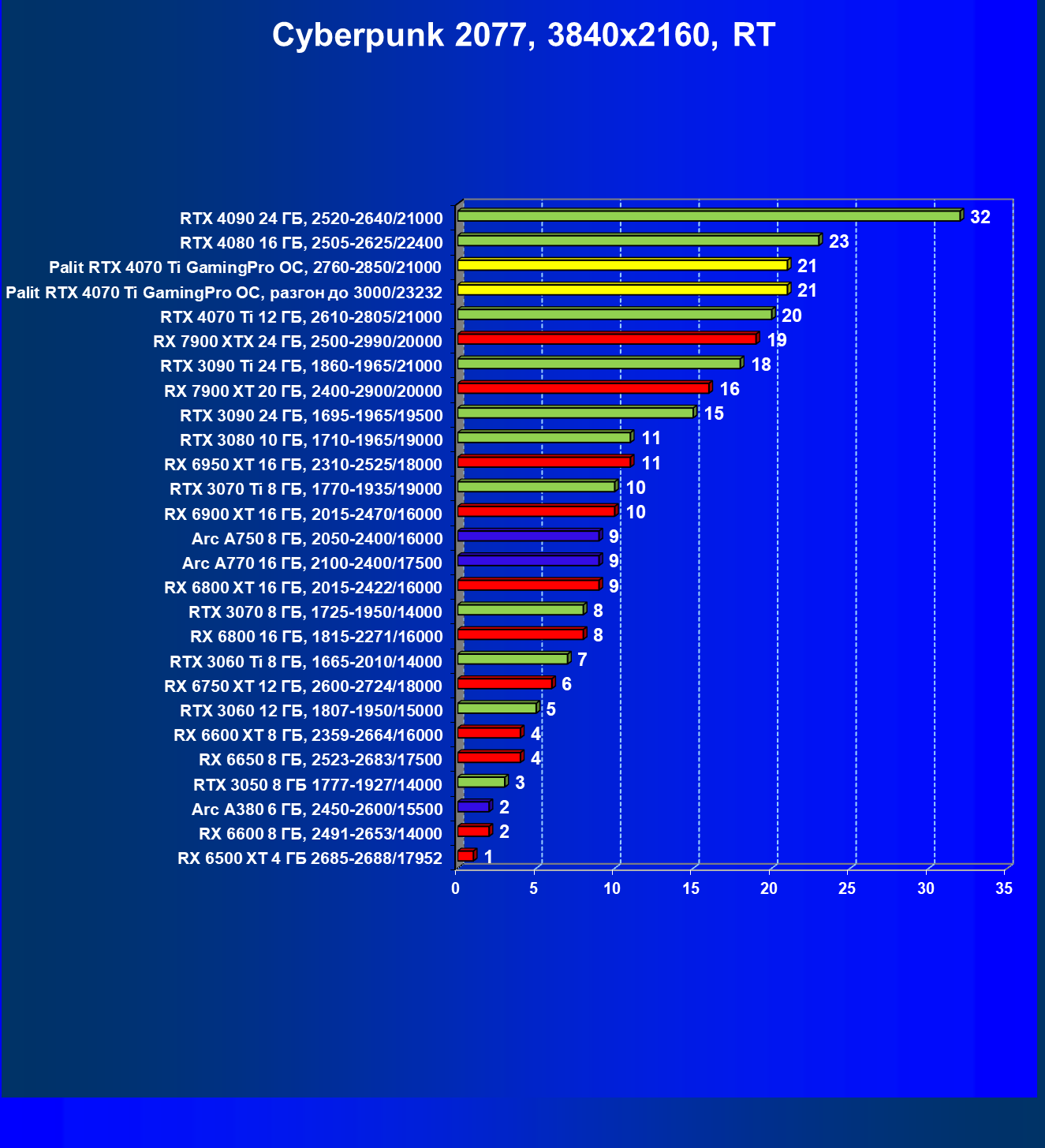 | 03 | Palit RTX 4070 Ti GamingPro OC, разгон до 3000/23232 | 1686 | 219 | 77 000 |