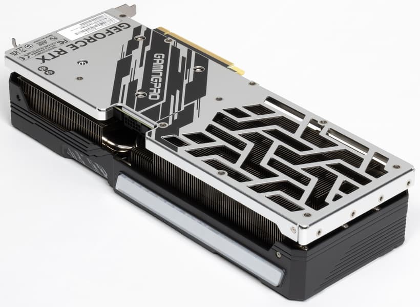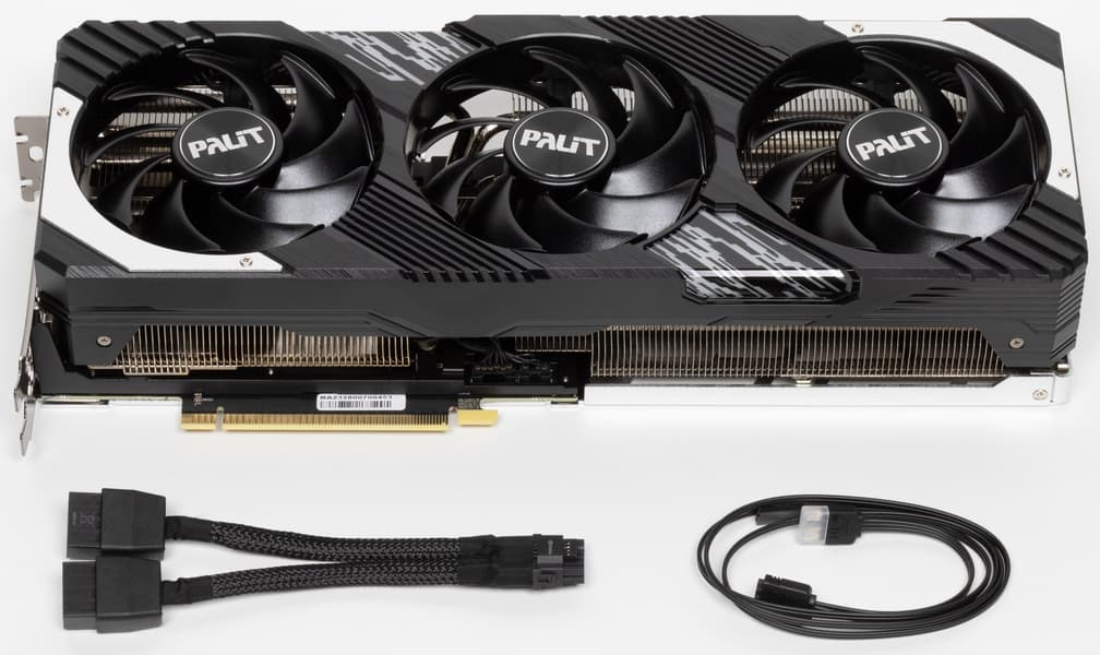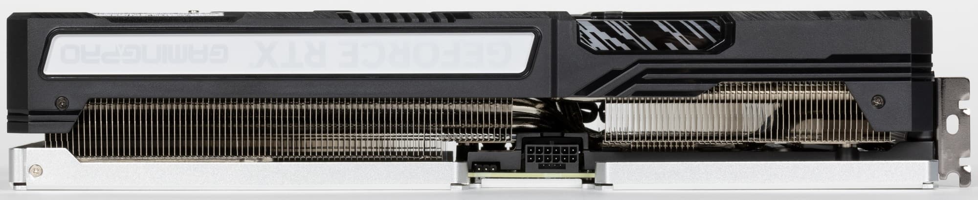 Карта Palit имеет 16-контактный разъем питания версии PCIe 5.0. Хотя в комплекте поставки имеется адаптер-переходник для подключения разъемов питания типа PCIe 2.0 (с 2 таких разъемов), лучше всё же использовать блоки питания стандарта ATX 3.0 с полноценной поддержкой питания PCIe 5.0 (с кабелем 12VHPWR). Имеющийся же переходник питания ни в коем случае нельзя изгибать непосредственно после 16-контактного разъема.
