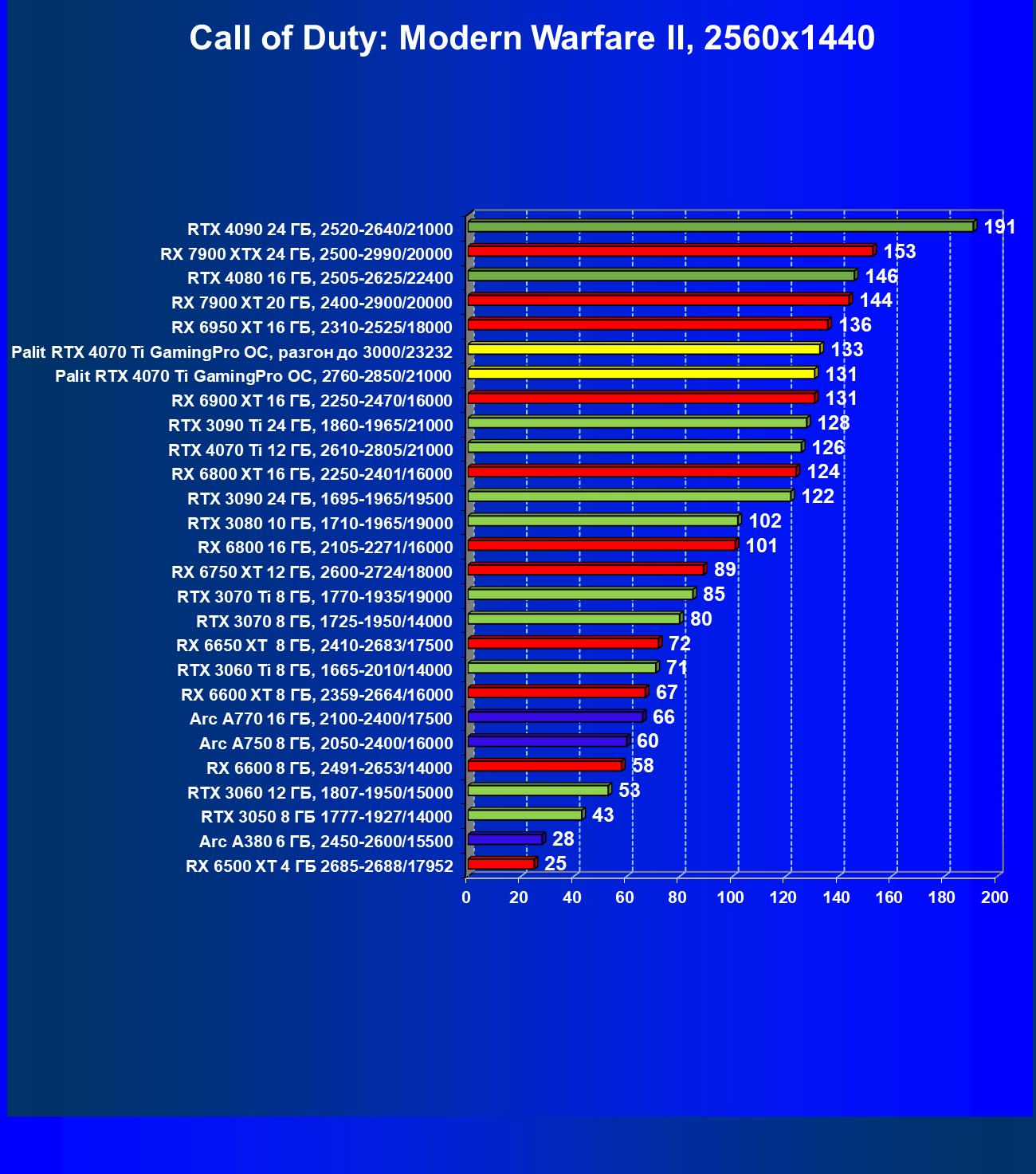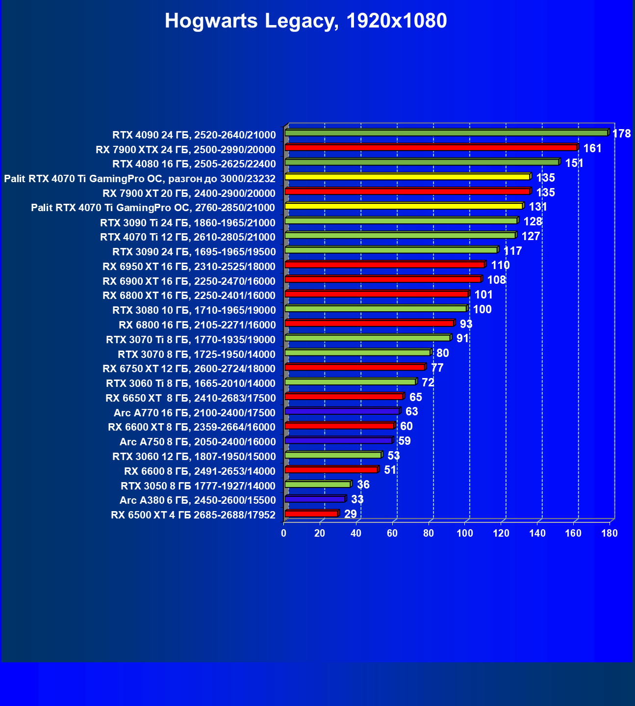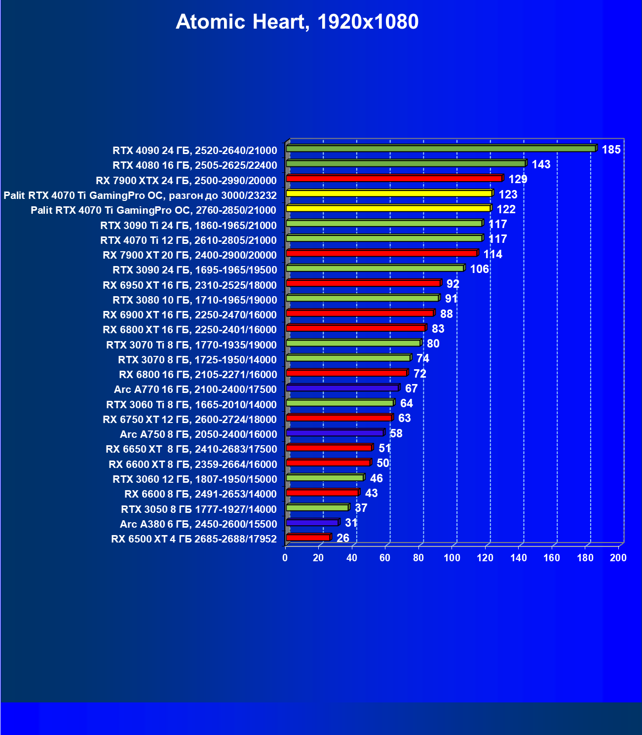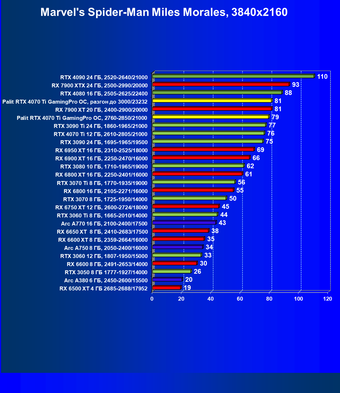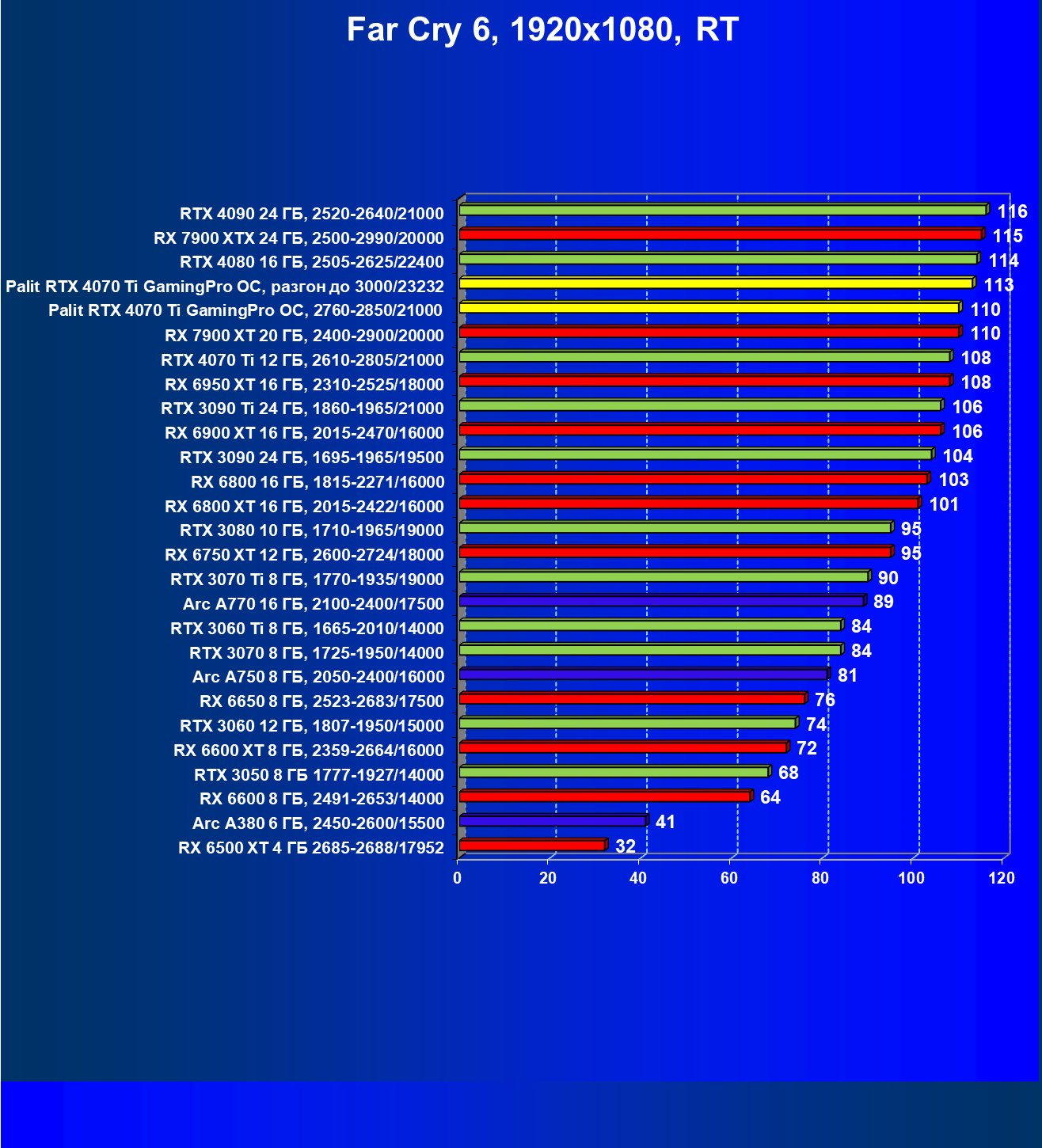 | 05 | Palit RTX 4070 Ti GamingPro OC, 2760—2850/21000 | 127 | 981 | 77 000 |