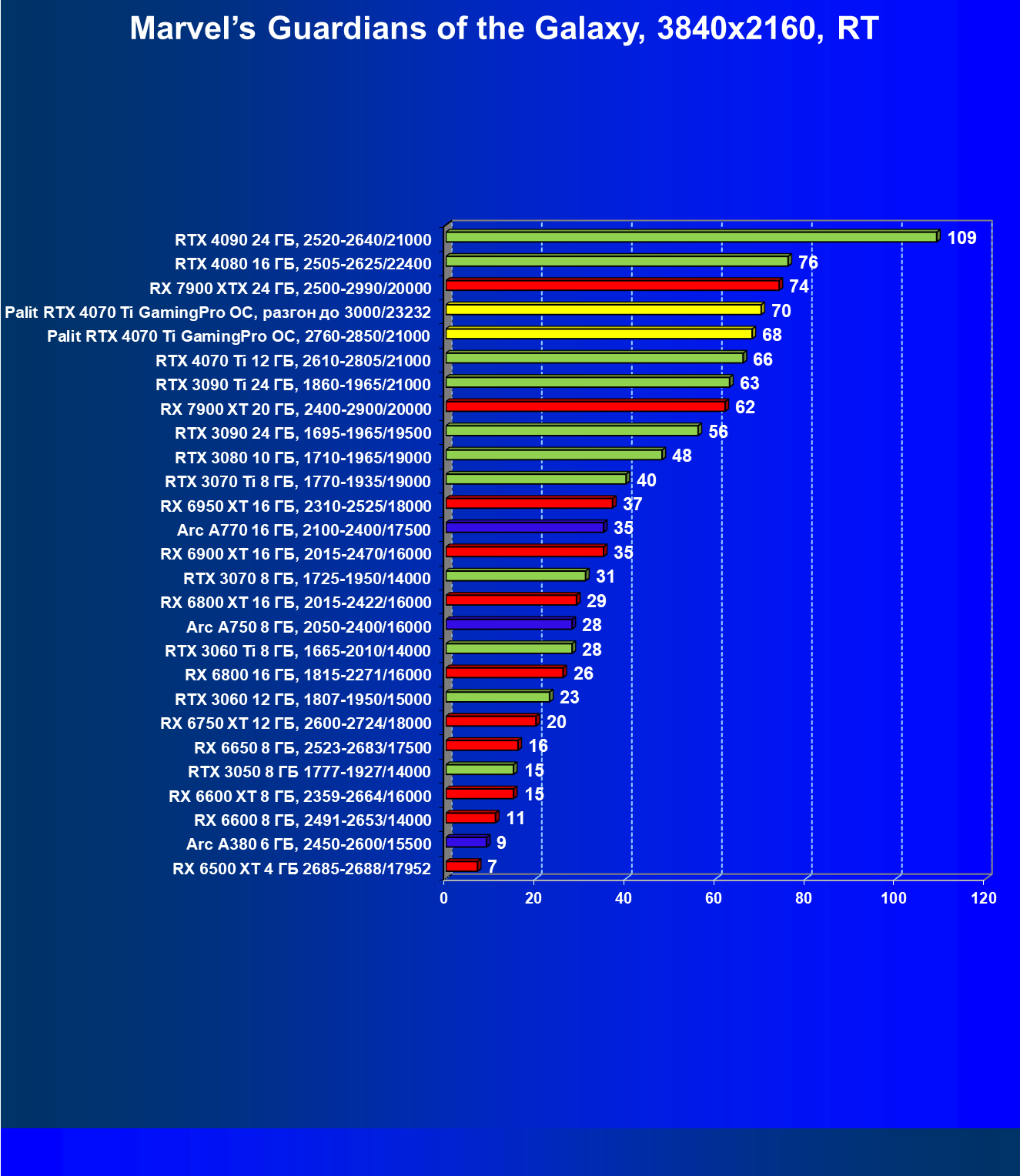 | 21 | RX 6950 XT 16 ГБ, 2310—2525/18000 | 109 | 874 | 80 000 |