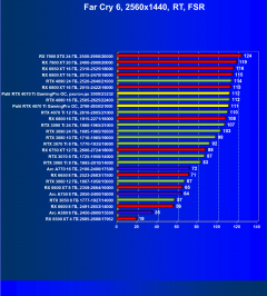 Рейтинг составлен по 8 тестам, в которых используется технология трассировки лучей и одновременно технология Nvidia DLSS, AMD FSR или Intel XeSS. Этот рейтинг нормирован по самому слабому ускорителю в данной группе — Radeon RX 6500 XT (то есть сочетание скорости и функций Radeon RX 6500 XT приняты за 100%).