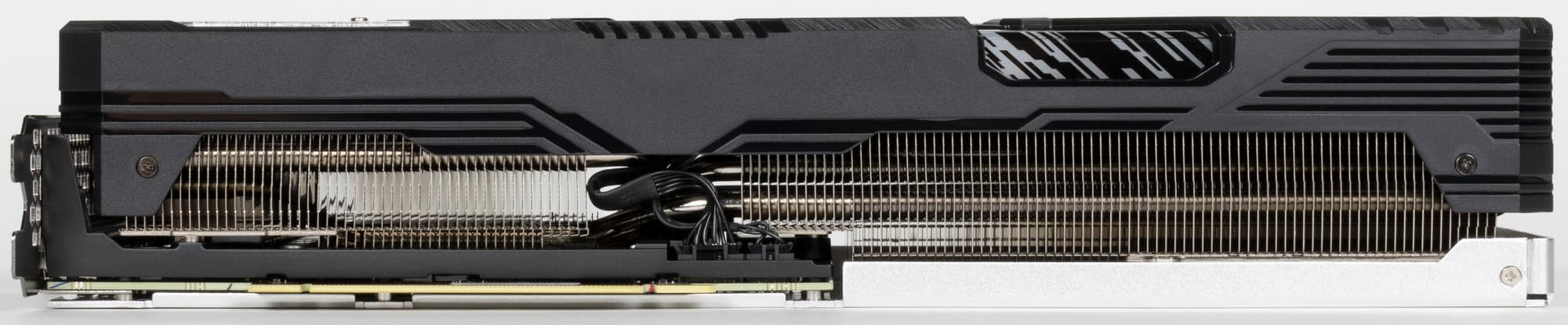 Отлично видна большая разница в разводке печатных плат обоих моделей. Palit GeForce RTX 4070 Ti GameRock имеет больше фаз питания GPU, это потребовало более высокую PCB, поэтому засчет выноса стабилизатора питания с правой стороны — на верх, длина печатной платы сильно сократилась. Сбоку справа на карте мы видим посадочные места, похожие на те, куда устанавливаются 8-контактные разъемы питания. На самом деле они предназначены для подключения мощных внешних вентиляторов в системах, использующих профессиональные версии подобных видеокарт (для игровых и профессиональных видеокарт используются одни и те же GPU, разница может быть лишь в объеме памяти, конфигурации рабочих блоков и, конечно же, в программном обеспечении).