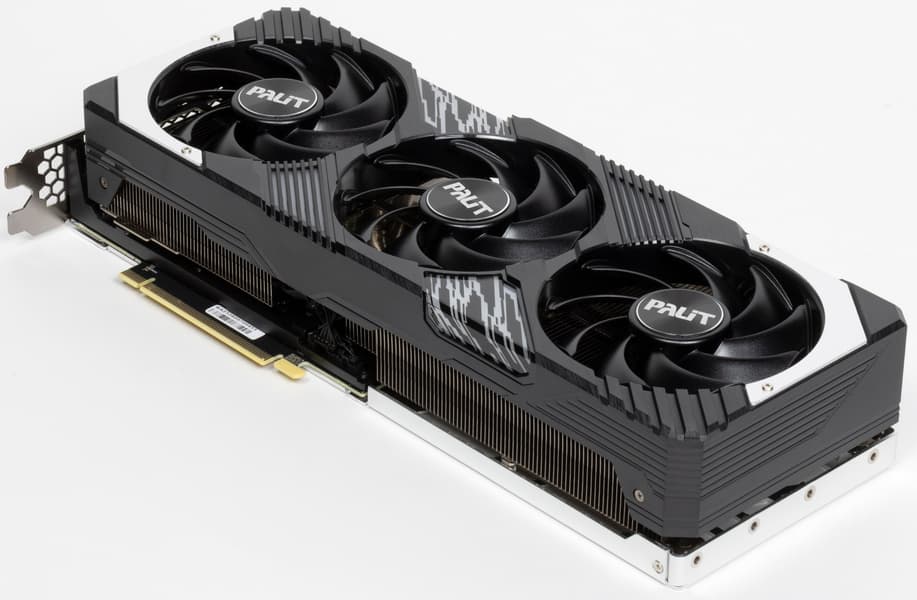 Карта Palit способна потреблять до 300 Вт (разовые всплески могут быть выше), обычно — около 280 Вт. Система охлаждения мощная и тихая. Разгон ограничен уровнем 105%, поэтому особого выигрыша не приносит. Габариты этой модели составляют 33 см в длину и 13 см в высоту, а по толщине видеокарта занимает 4 слота в корпусе. Набор видеовыходов стандартный: 3 DP и 1 HDMI.