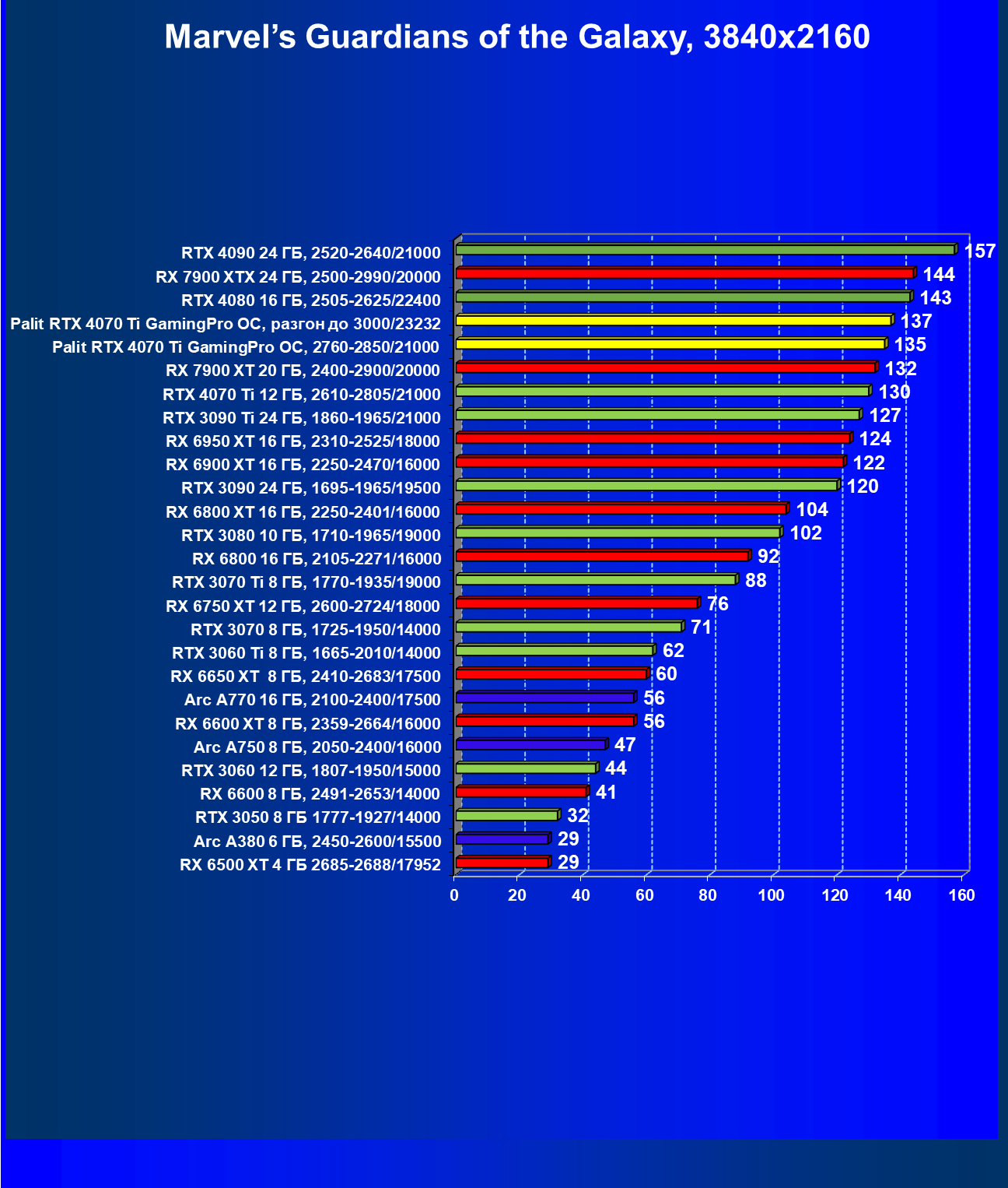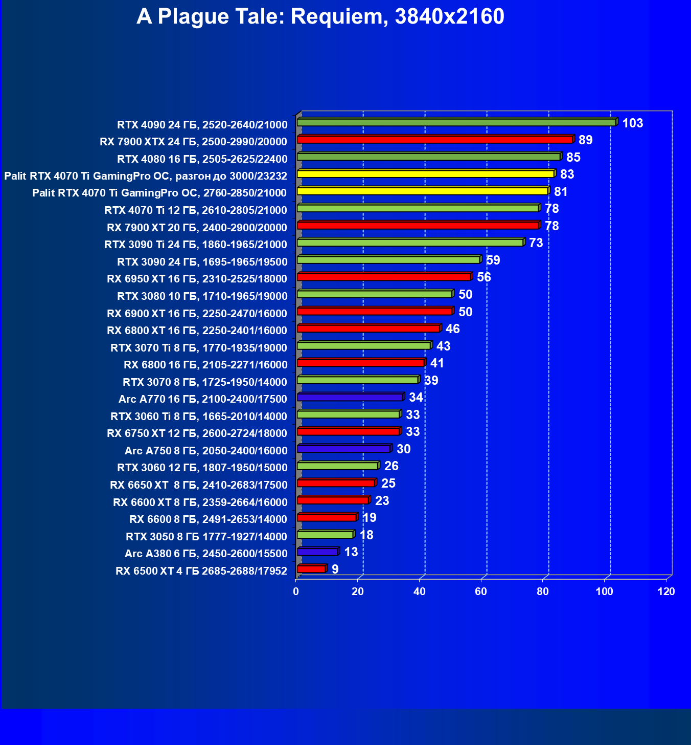 Учитывая нацеленность RTX 4070 Ti на разрешение 4К, мы привели рейтинг, подсчитанный только при использовании разрешения 3840×2160.