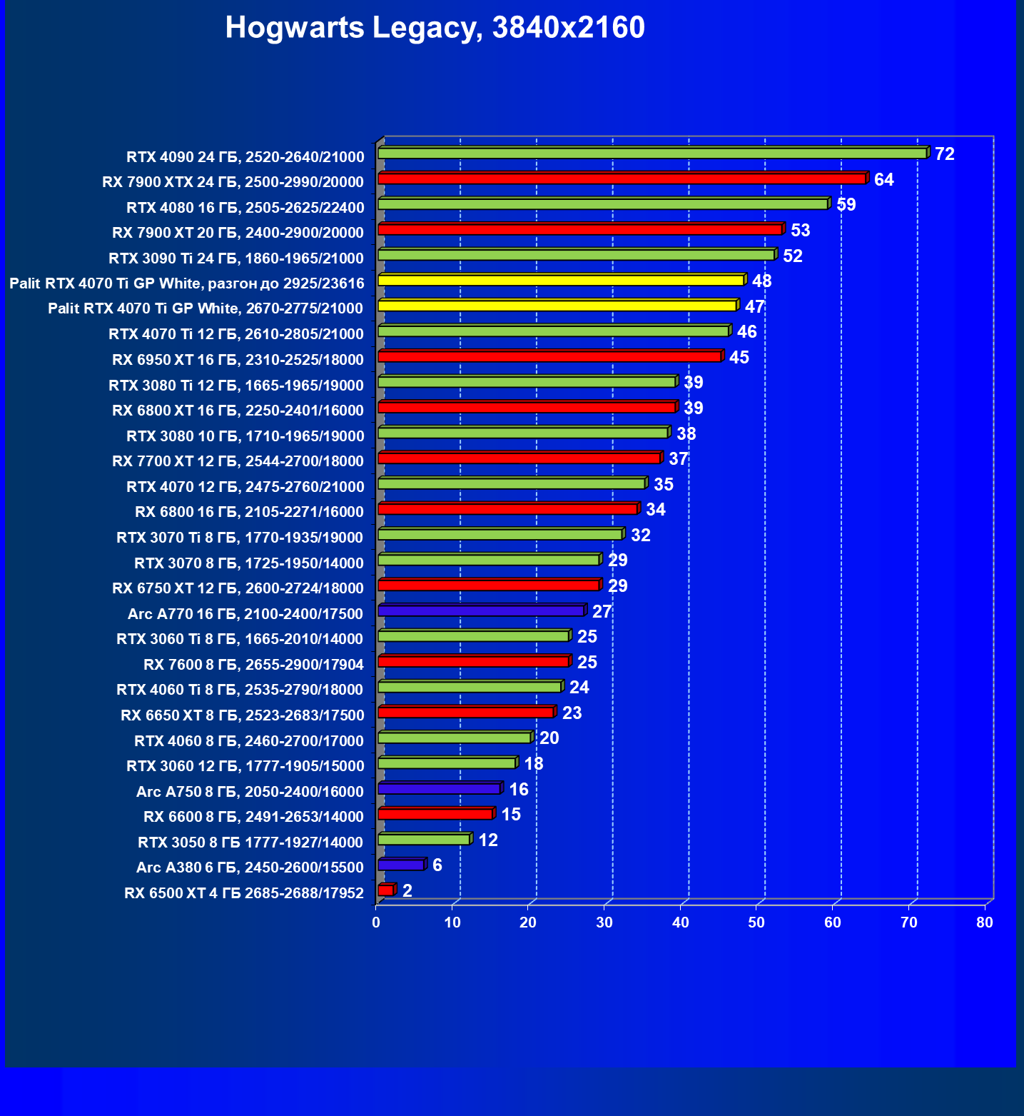 В данном случае карты AMD скромно покинули верхушку рейтинга, где царствуют GeForce RTX 4070 Ti и GeForce RTX 4080.