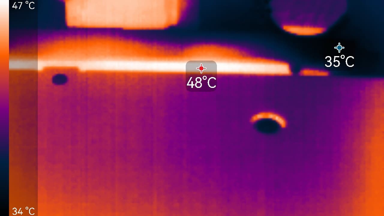После 2-часового прогона под нагрузкой максимальная температура ядра не превысила 70 градусов (самой горячей точки — 83 °C), а температура микросхем памяти — 64 градусов, что является отличным результатом для видеокарт такого уровня. Энергопотребление карты доходило до 271 Вт. Напомним, что безопасный предел нагрева памяти GDDR6X — 105 °C.