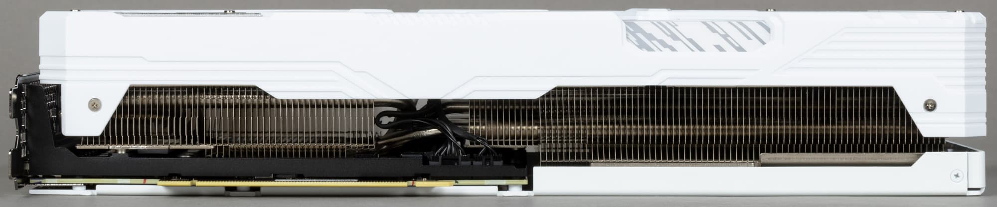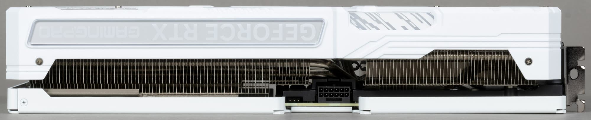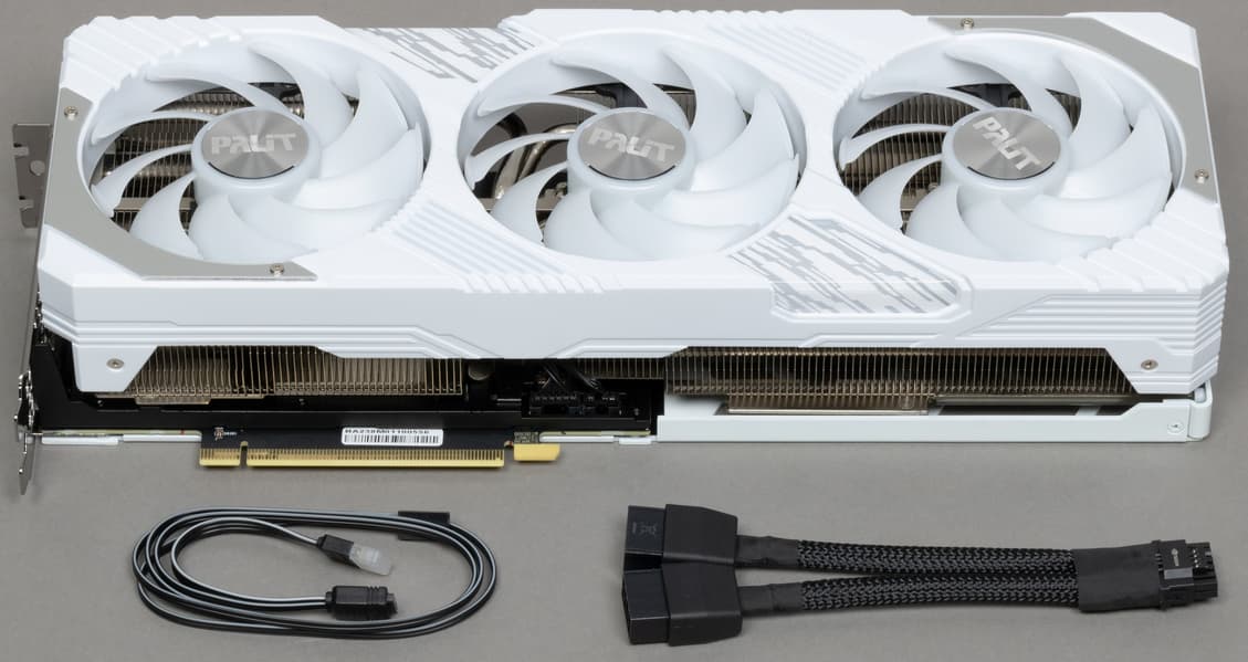Карта Palit имеет 16-контактный разъем питания версии PCIe 5.0. Хотя в комплекте поставки имеется адаптер-переходник для подключения разъемов питания типа PCIe 2.0 (с 2 таких разъемов), лучше всё же использовать блоки питания стандарта ATX 3.0 с полноценной поддержкой питания PCIe 5.0 (с кабелем 12VHPWR). Имеющийся же переходник питания ни в коем случае нельзя изгибать непосредственно после 16-контактного разъема.