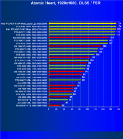 Рейтинг составлен по 9 тестам, в которых используется технология трассировки лучей и одновременно технология Nvidia DLSS, AMD FSR или Intel XeSS. Этот рейтинг нормирован по самому слабому ускорителю в данной группе — Radeon RX 6500 XT (то есть сочетание скорости и функций Radeon RX 6500 XT приняты за 100%).