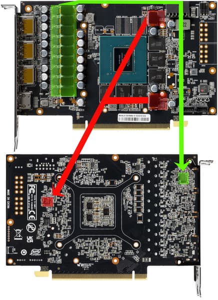 Зеленым цветом отмечена схема питания ядра, красным — памяти. Все ШИМ-контроллеры расположены на оборотной стороне PCB.