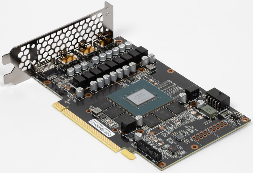Сбоку справа на карте мы видим посадочные места, похожие на те, куда устанавливаются 8-контактные разъемы питания. На самом деле они предназначены для подключения мощных внешних вентиляторов в системах, использующих профессиональные версии подобных видеокарт (для игровых и профессиональных видеокарт используются одни и те же GPU, разница может быть лишь в объеме памяти, конфигурации рабочих блоков и, конечно же, в программном обеспечении).