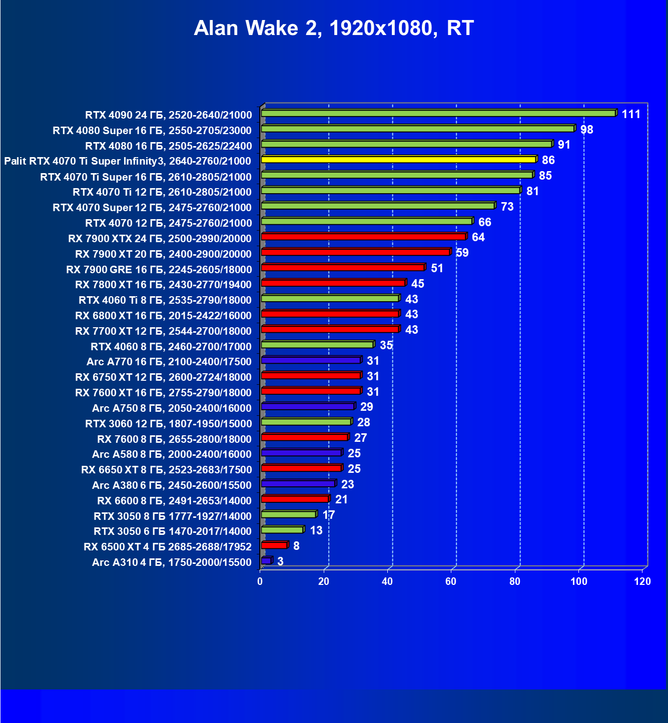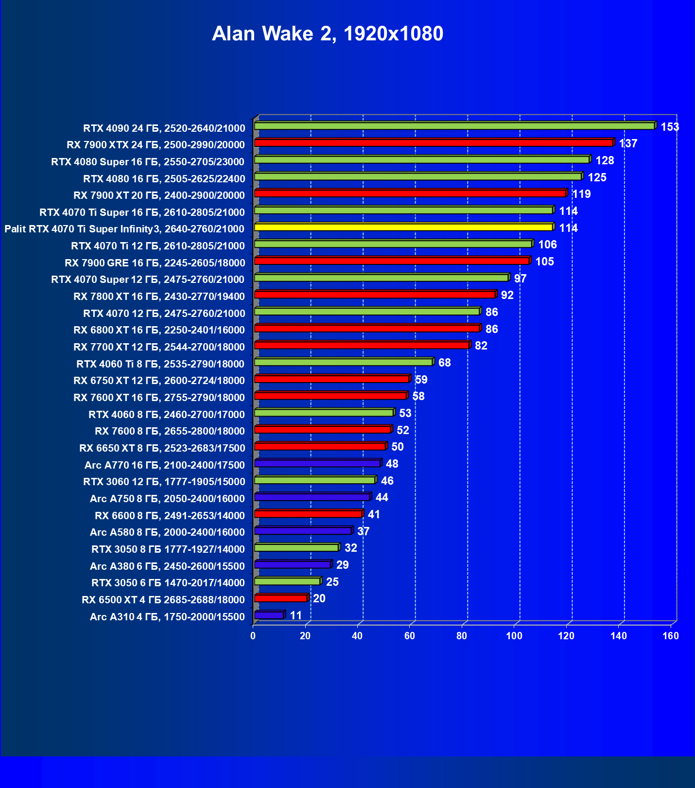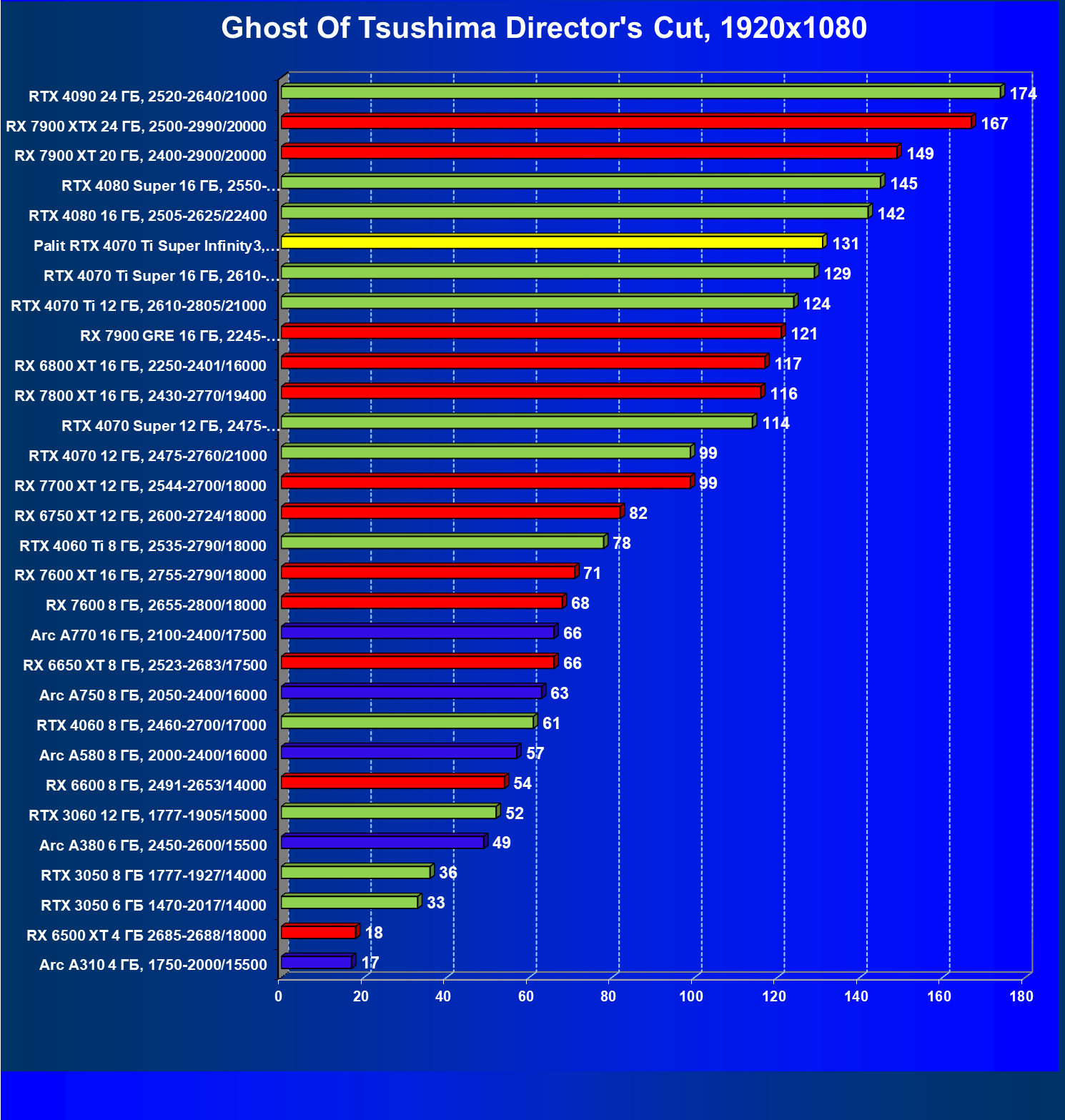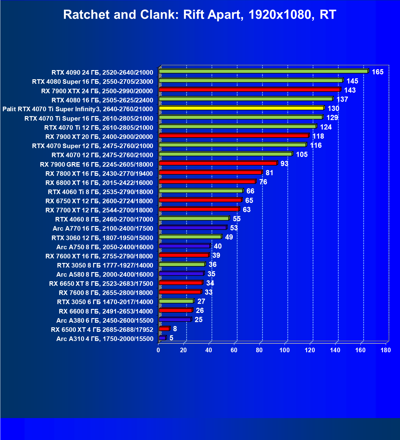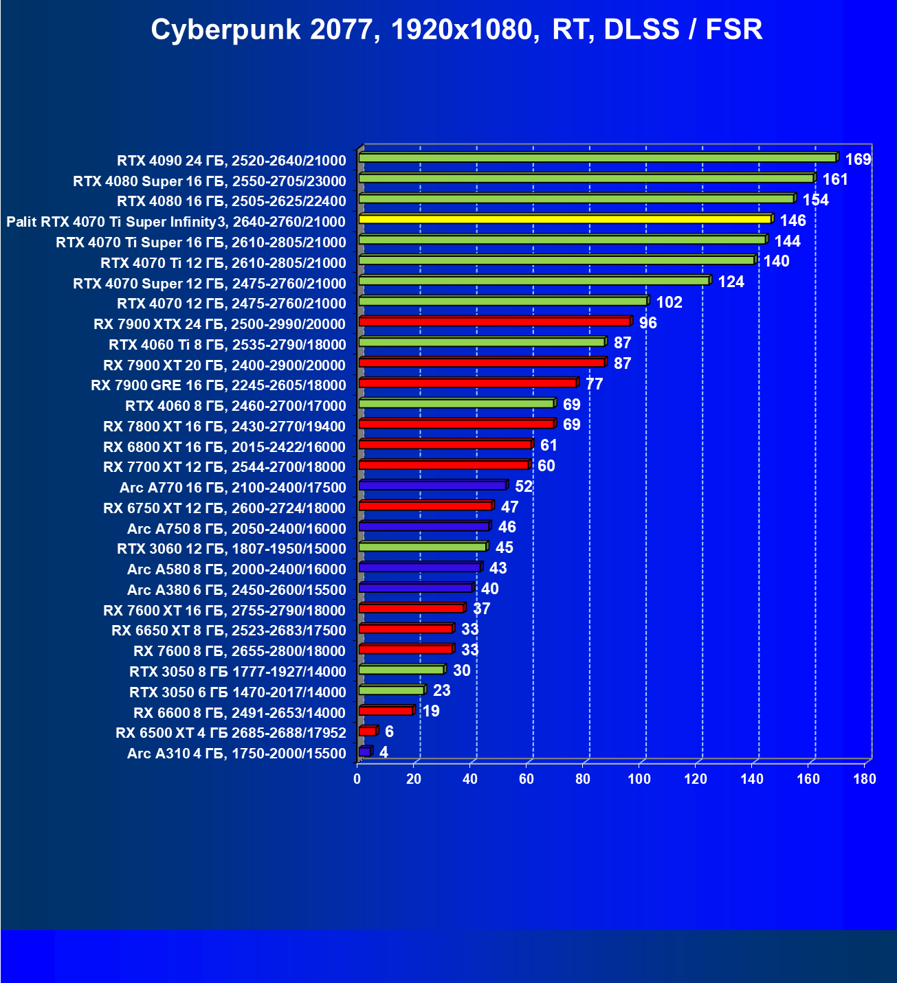 Очевидно, что в классических играх привлекательность GeForce RTX 4070 Ti Super и его ближайшего конкурента из стана AMD примерно равны, а вот стоимость карты Palit высоковата (ее просто практически не возят в Россию), поэтому она оказалась на предпоследнем месте в своей группе.