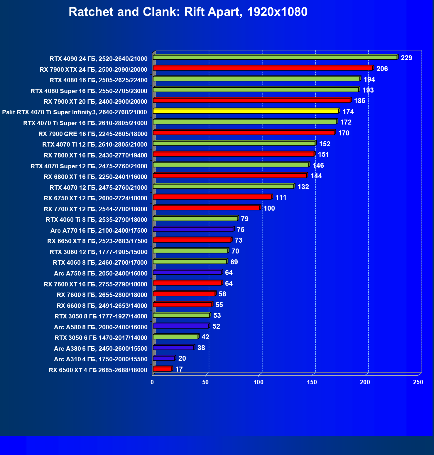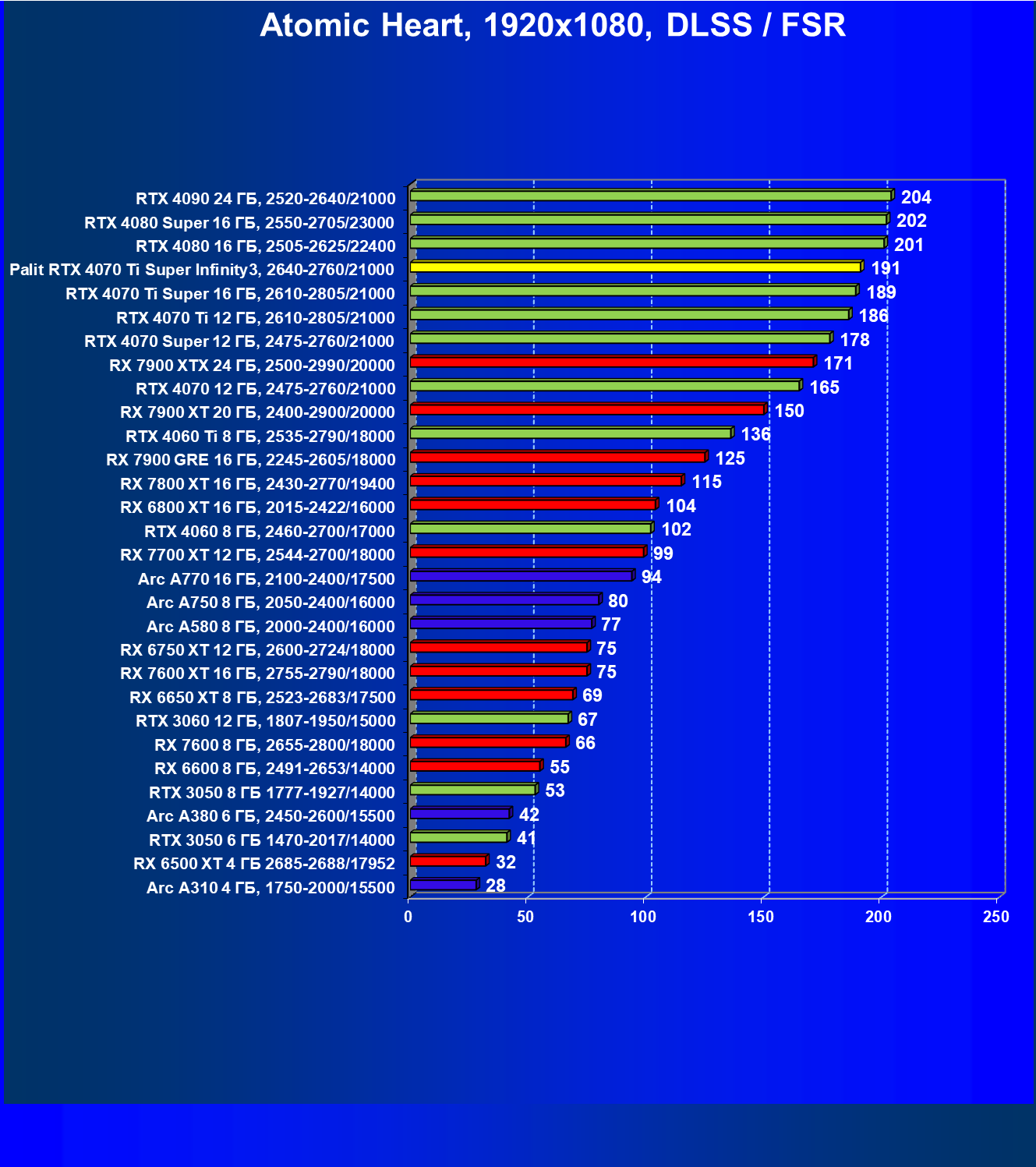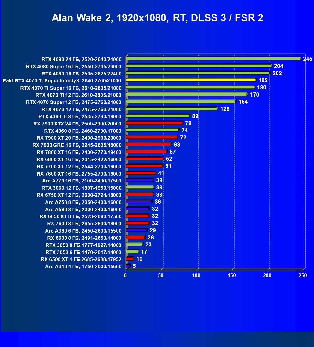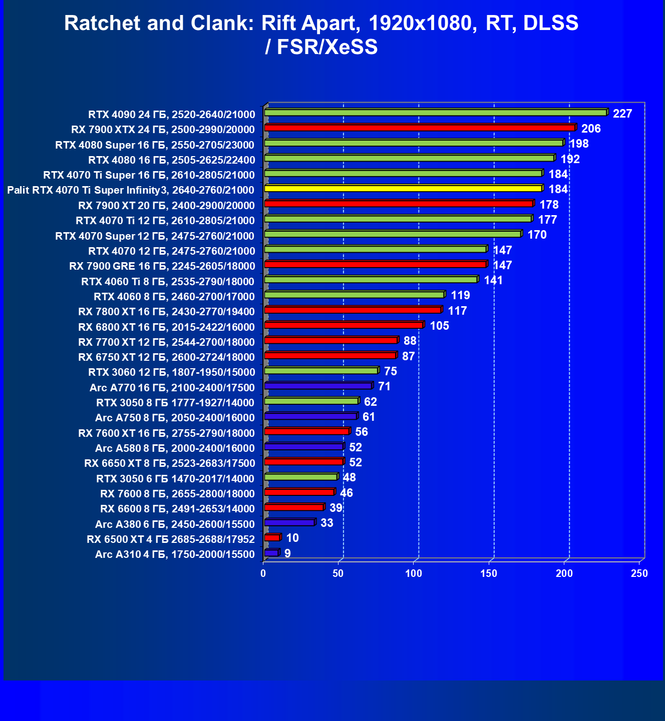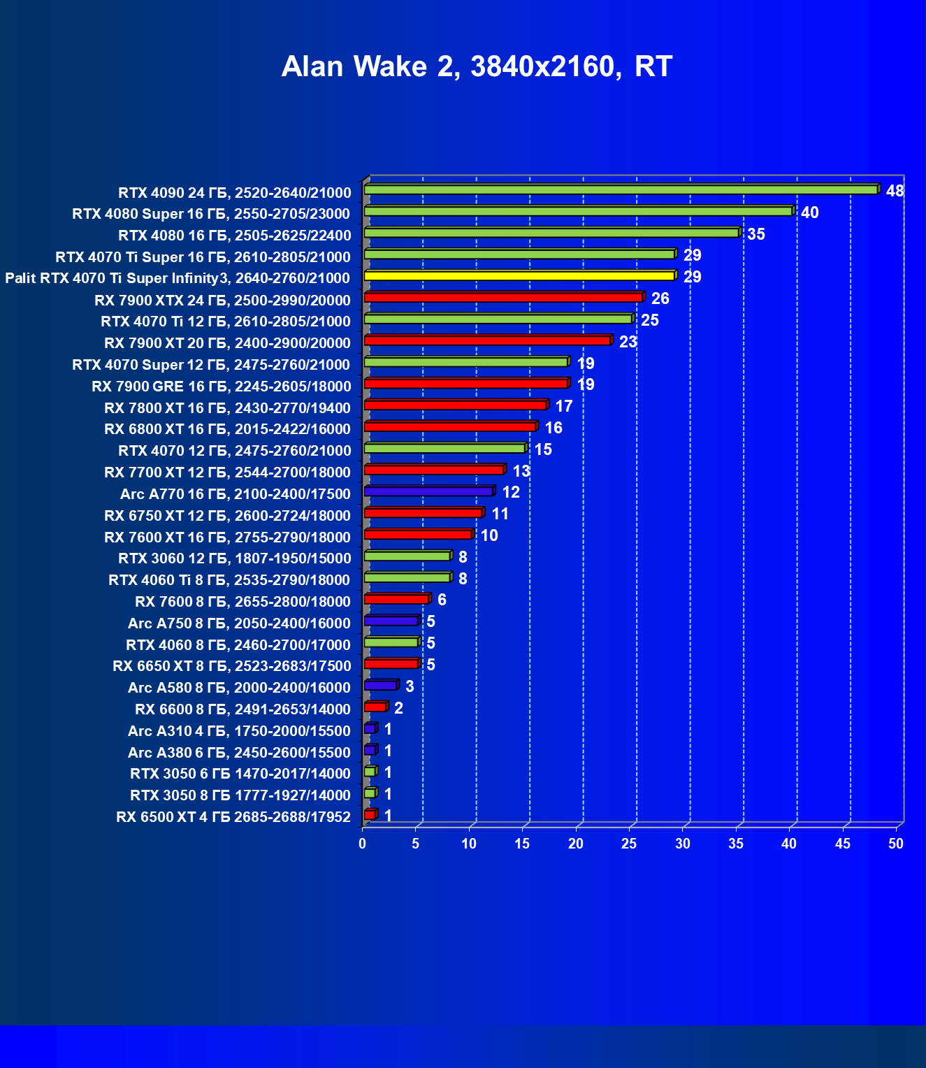 Очевидно, что в классических играх привлекательность GeForce RTX 4070 Ti Super и его ближайшего конкурента из стана AMD примерно равны, а вот стоимость карты Palit высоковата (ее просто практически не возят в Россию), поэтому она оказалась на предпоследнем месте в своей группе.