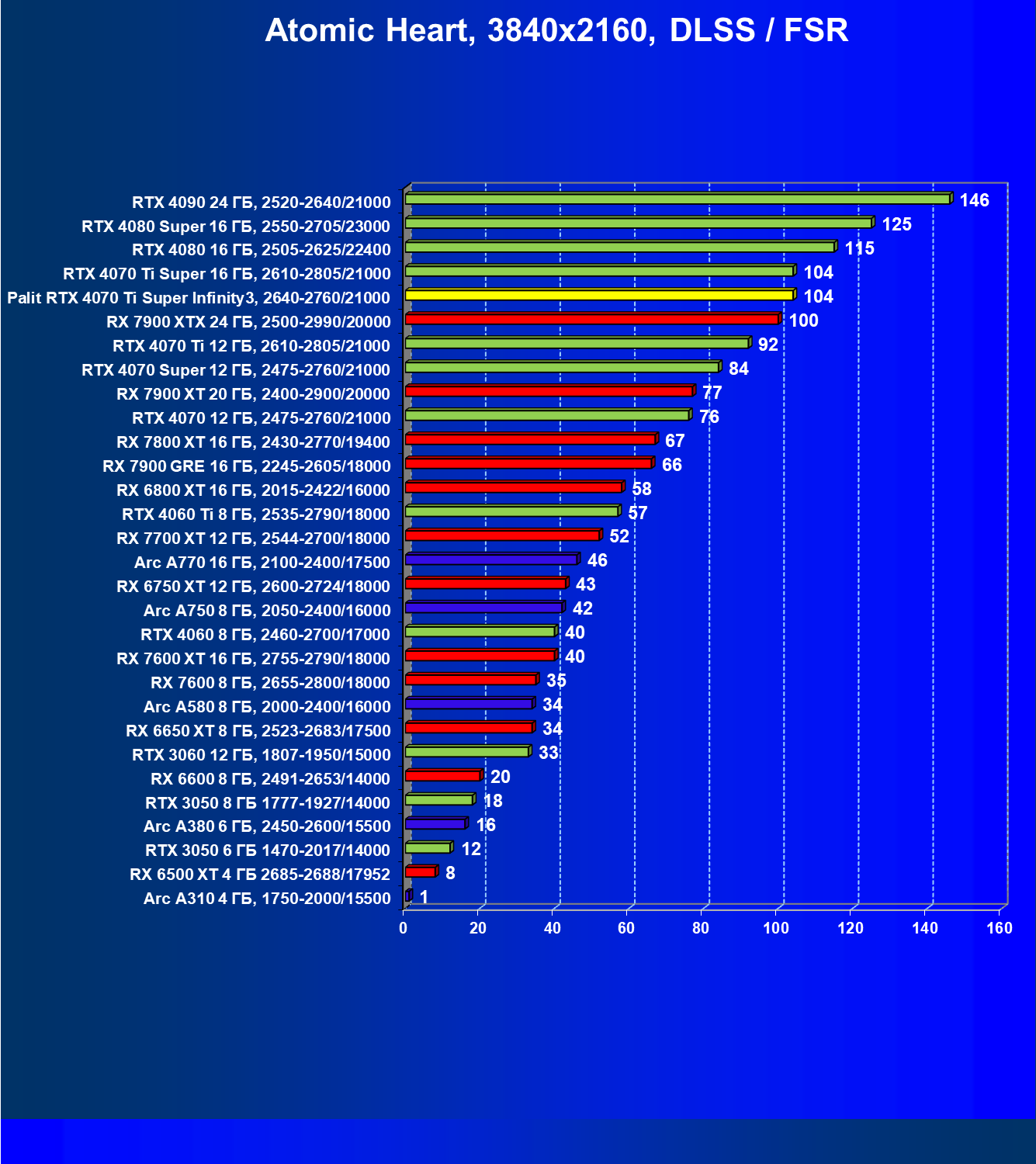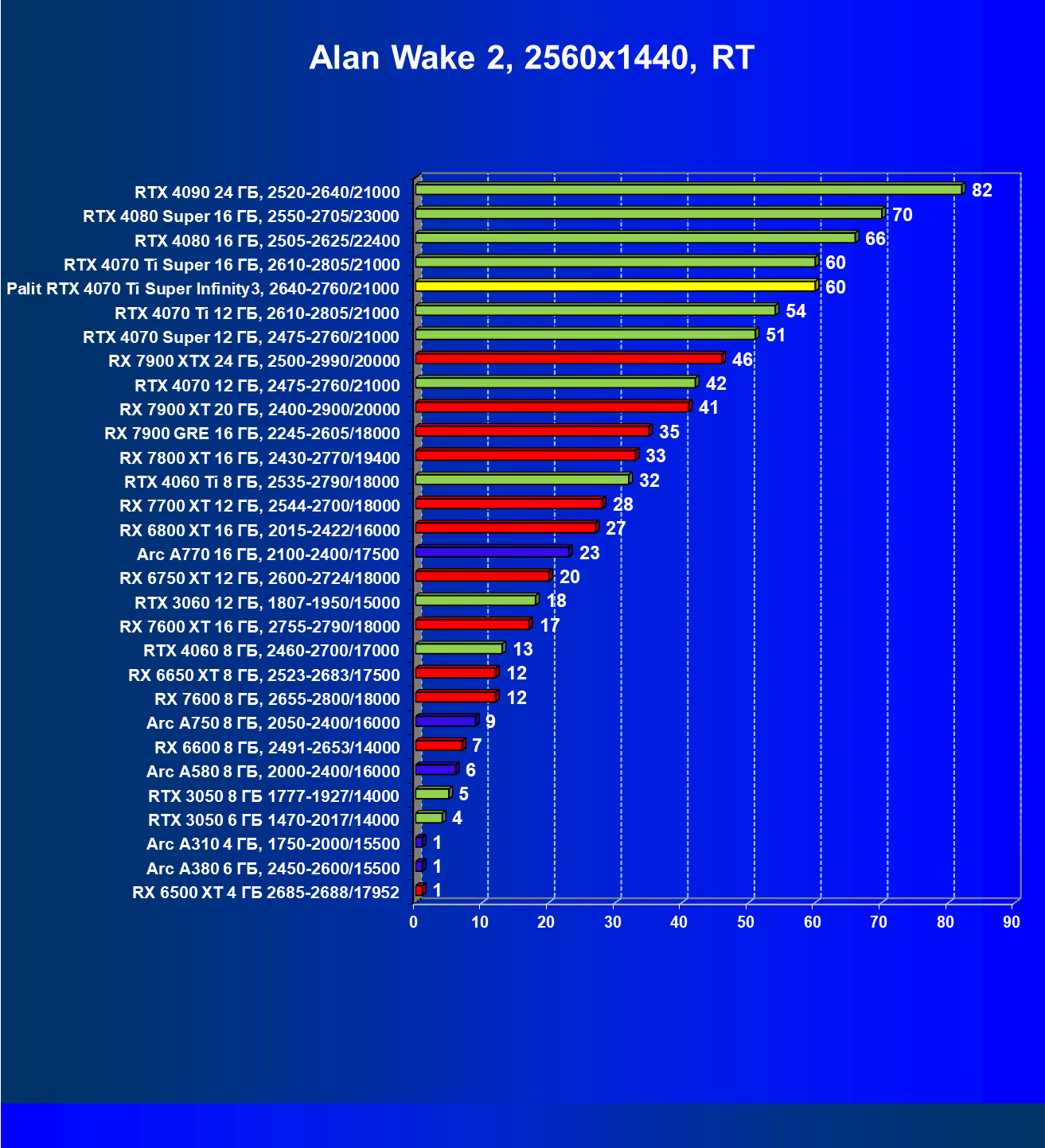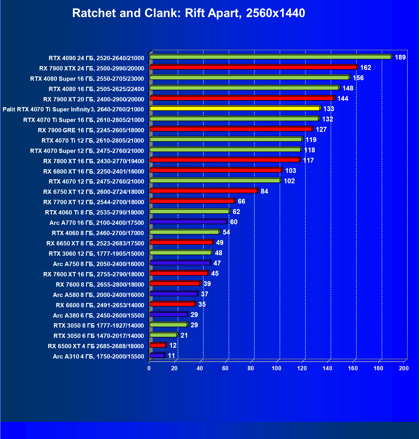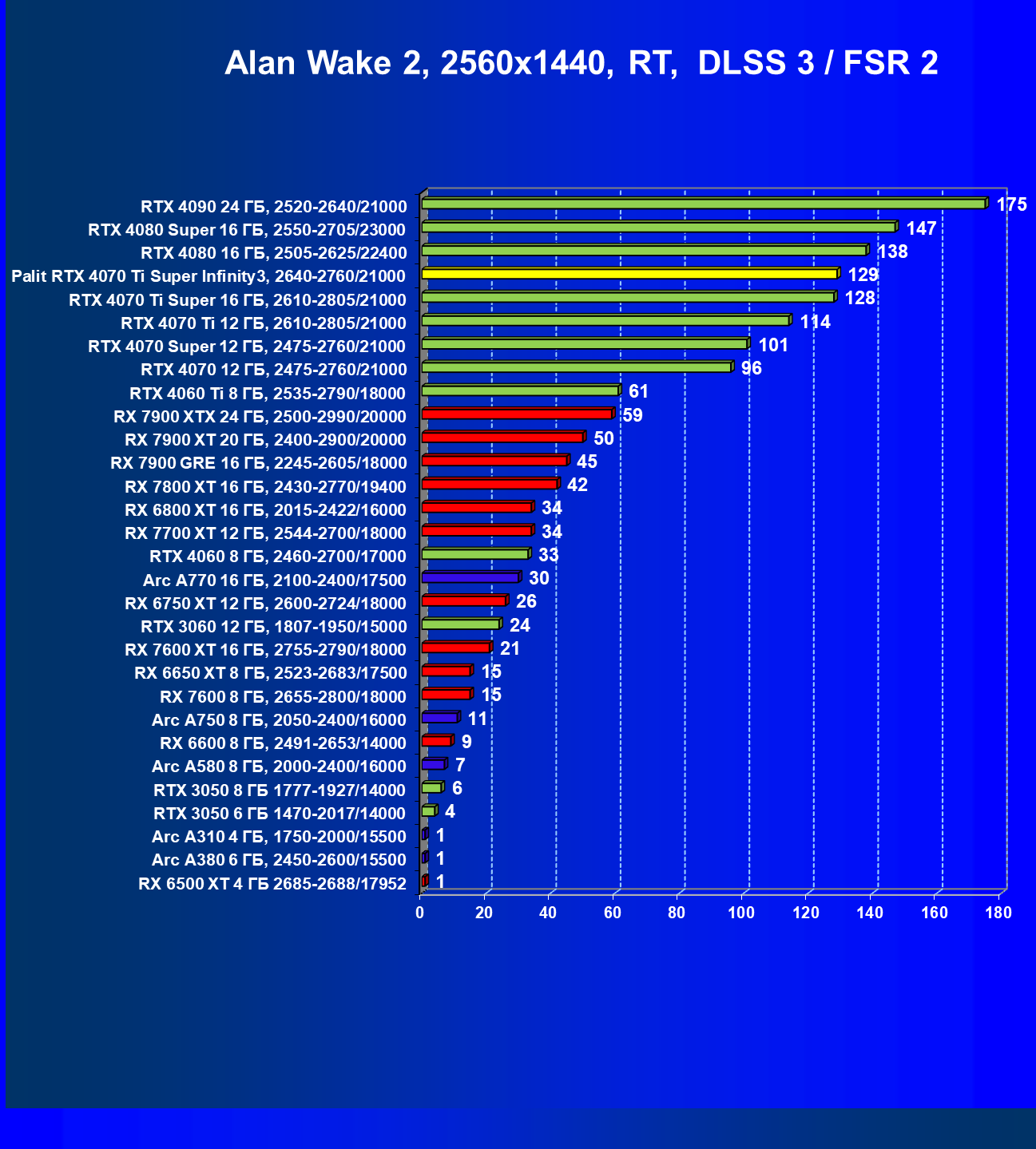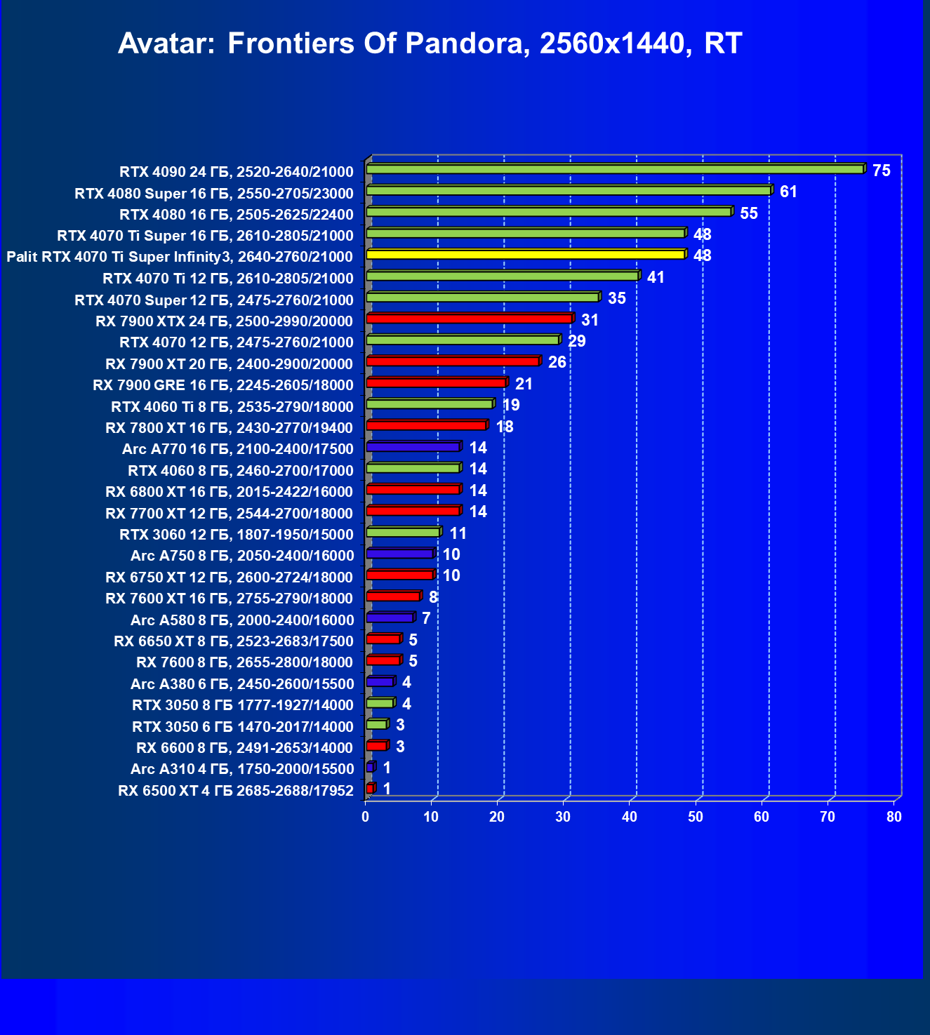 Очевидно, что в классических играх привлекательность GeForce RTX 4070 Ti Super и его ближайшего конкурента из стана AMD примерно равны, а вот стоимость карты Palit высоковата (ее просто практически не возят в Россию), поэтому она оказалась на предпоследнем месте в своей группе.