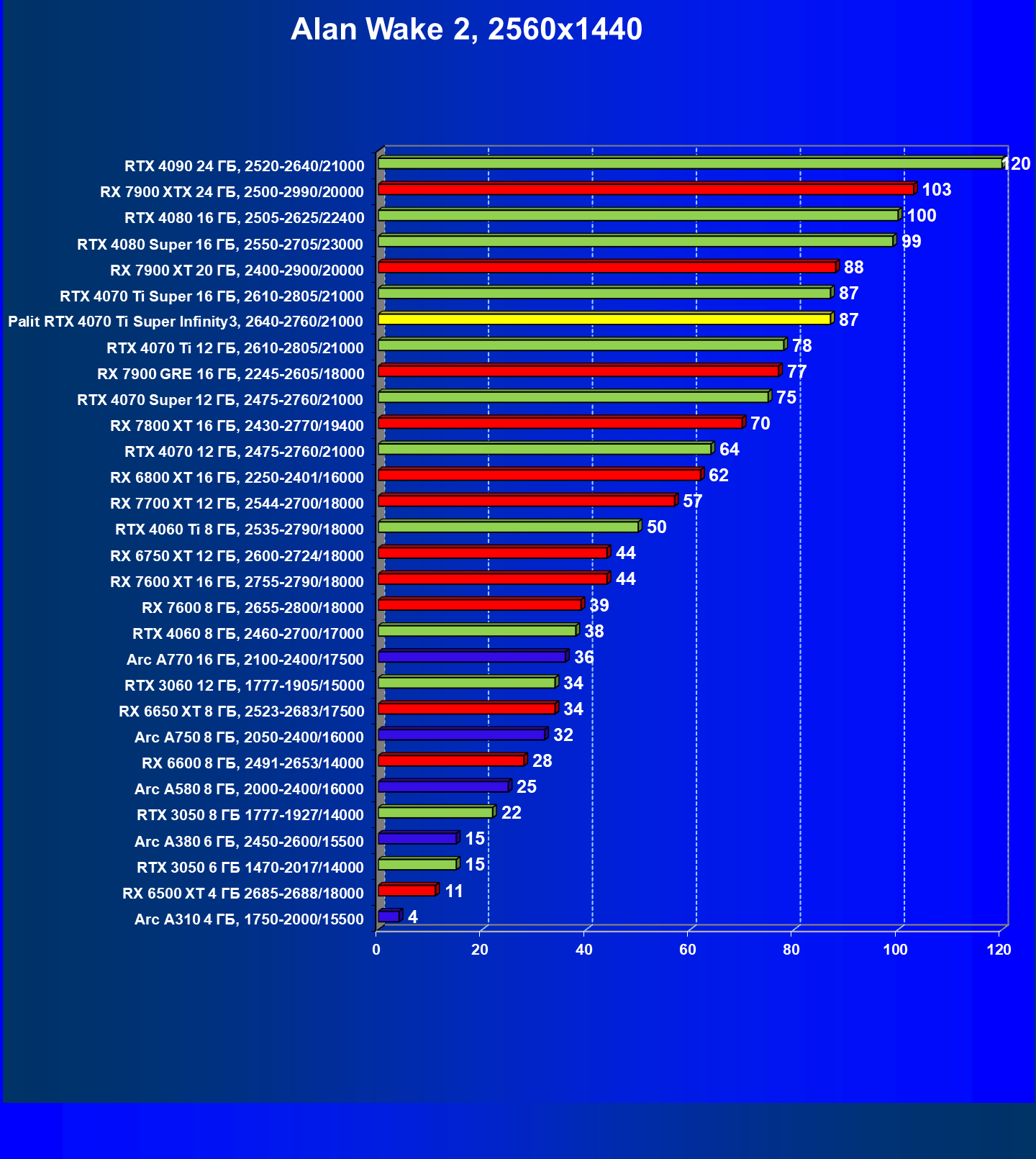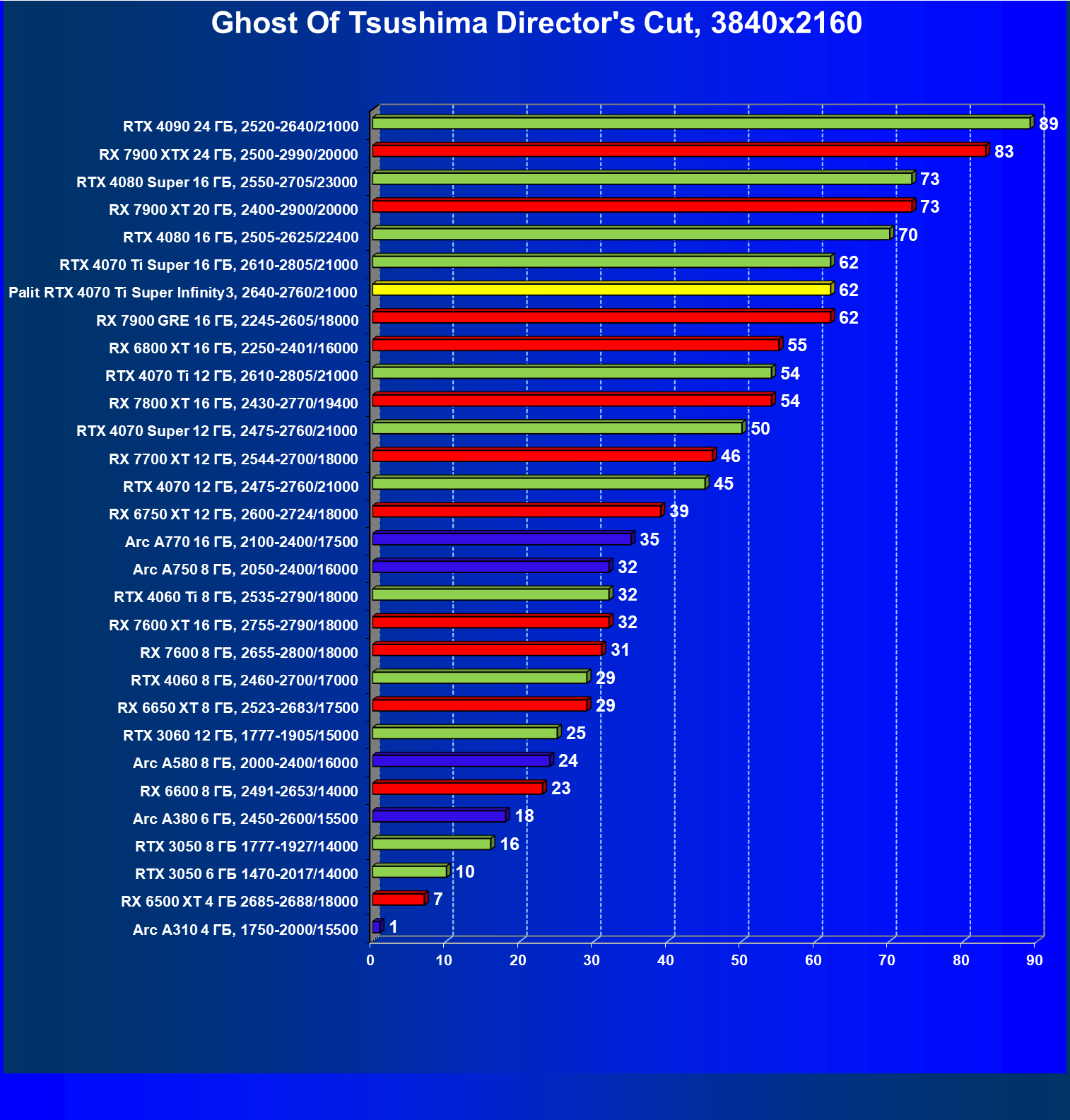 | 03 | Palit RTX 4070 Ti Super Infinity3, 2640—2760/21000 | 640 | 6011 | 94 000 |