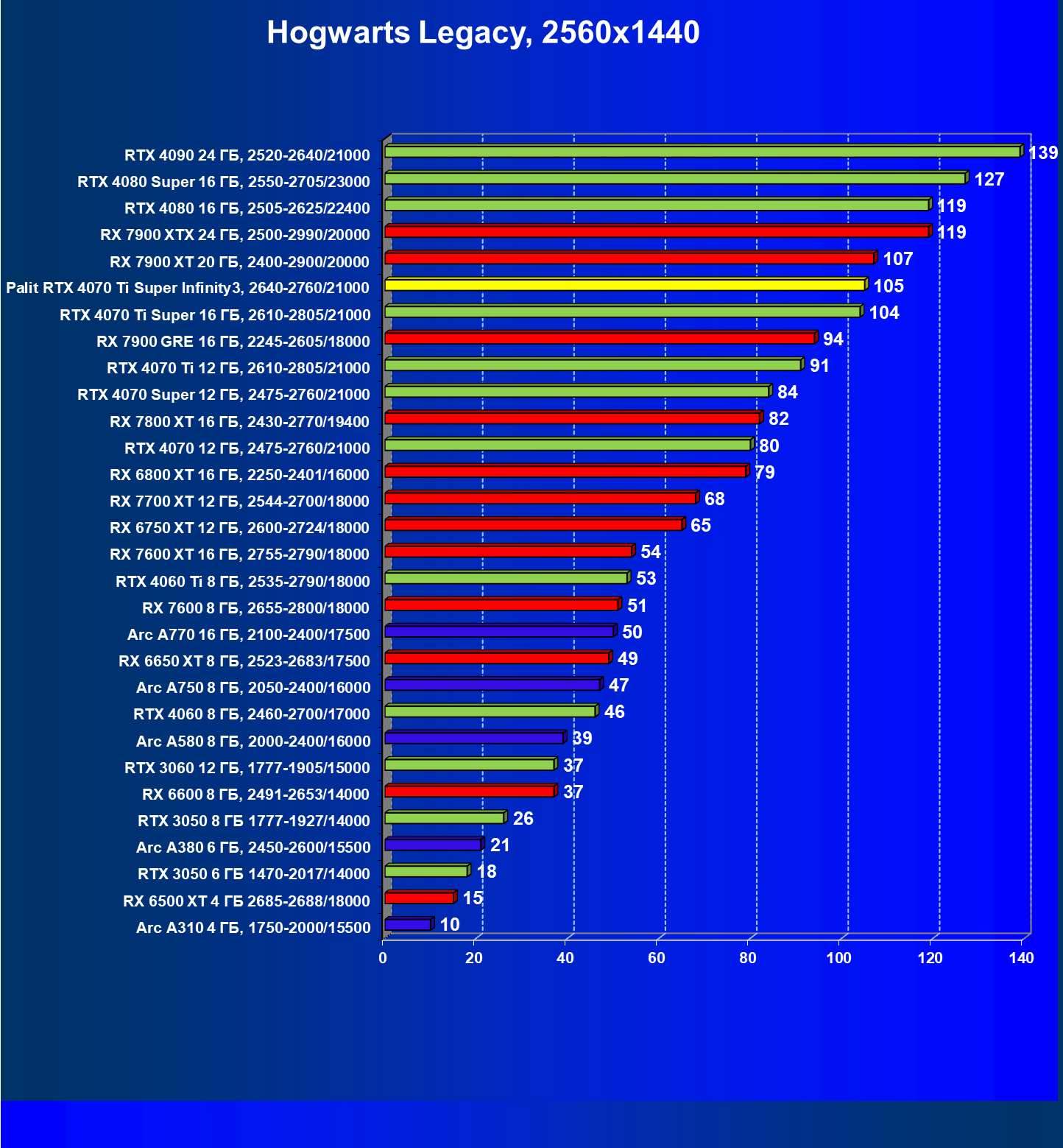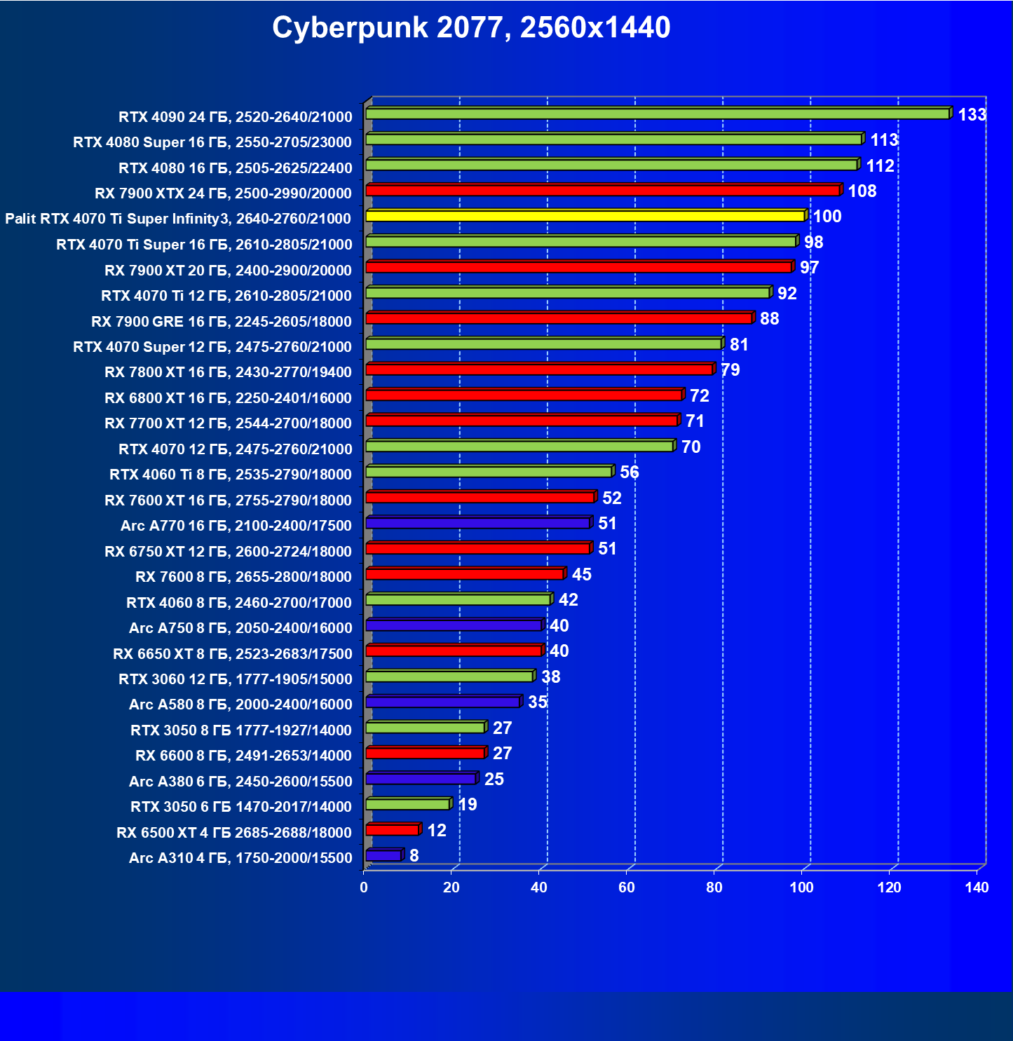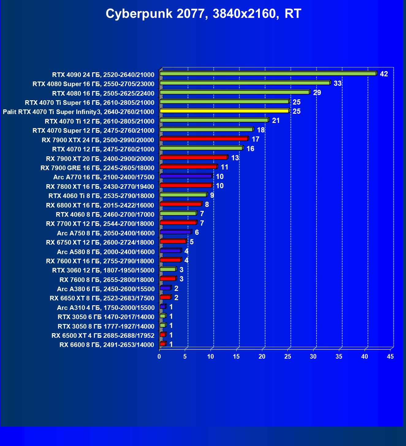 | 06 | Palit RTX 4070 Ti Super Infinity3, 2640—2760/21000 | 3519 | 374 | 94 000 |