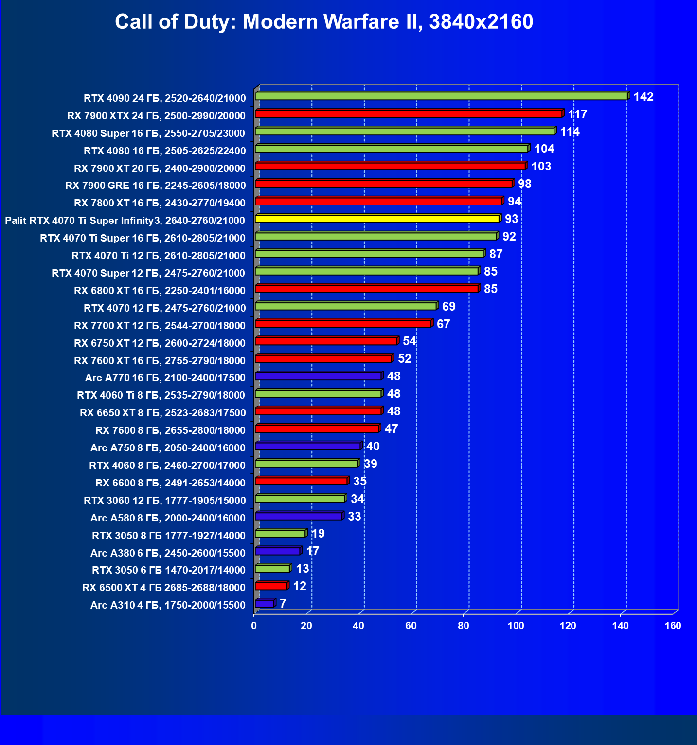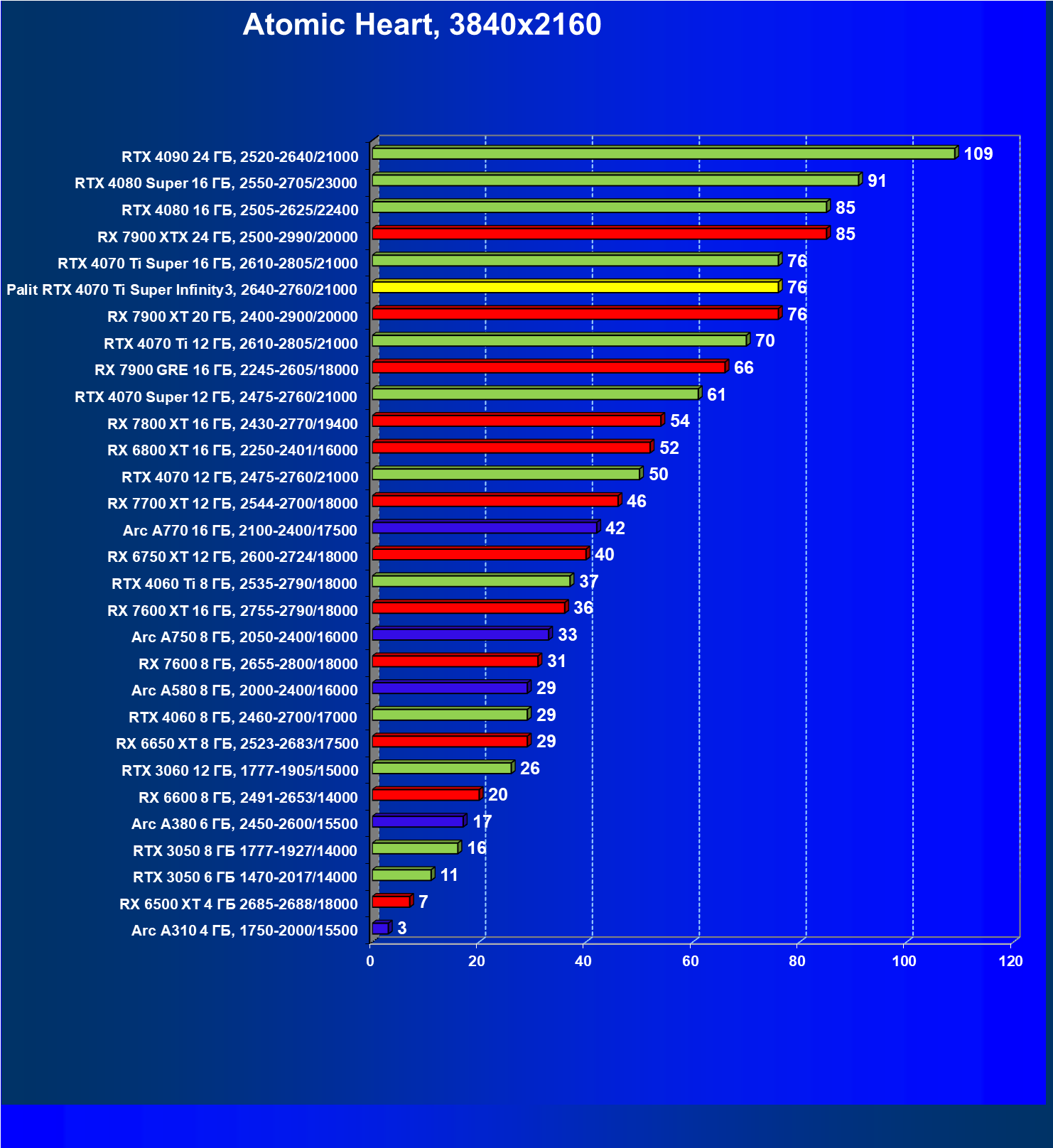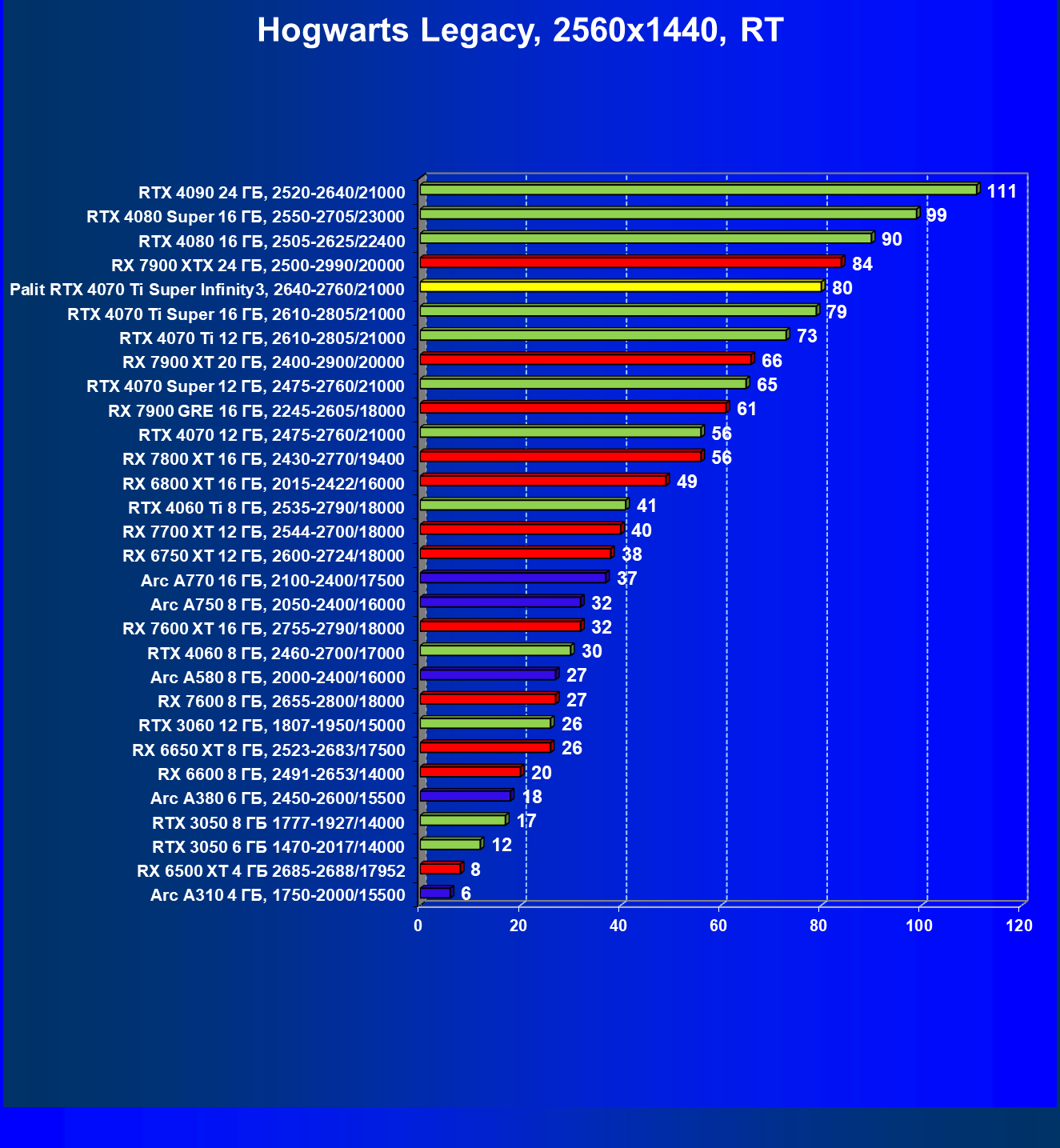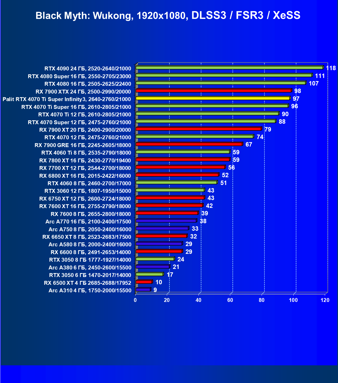 | 06 | Palit RTX 4070 Ti Super Infinity3, 2640—2760/21000 | 3519 | 374 | 94 000 |