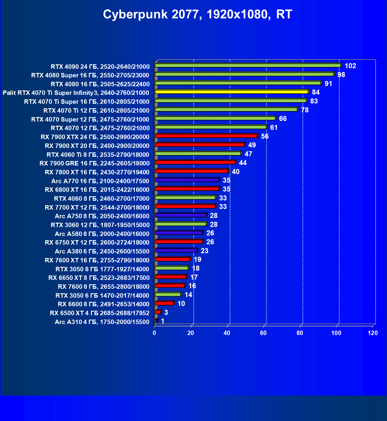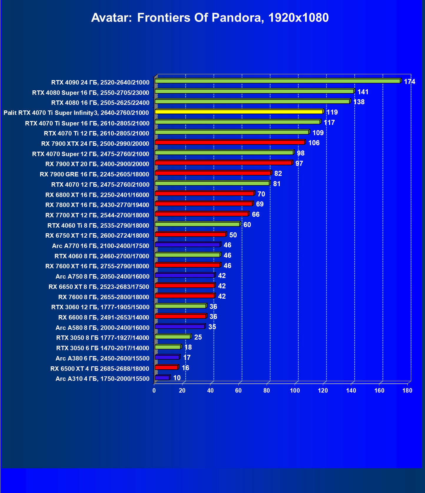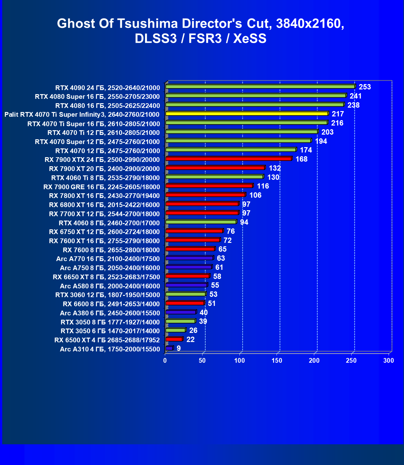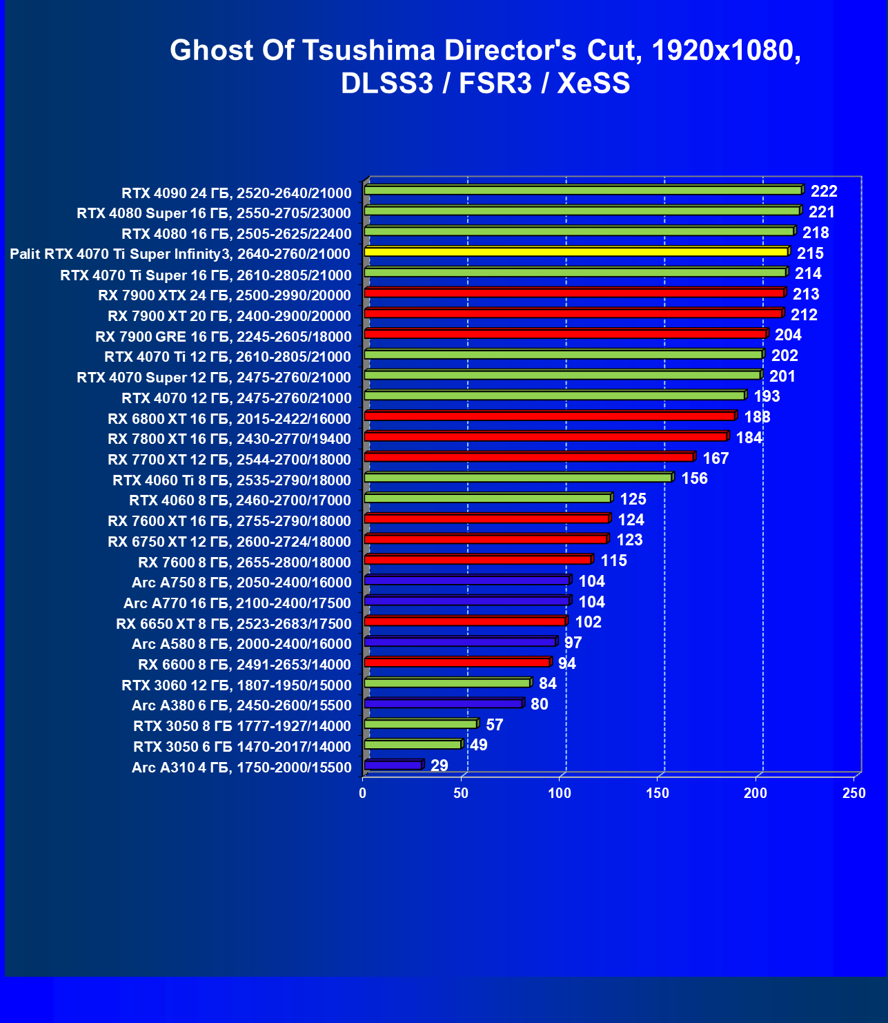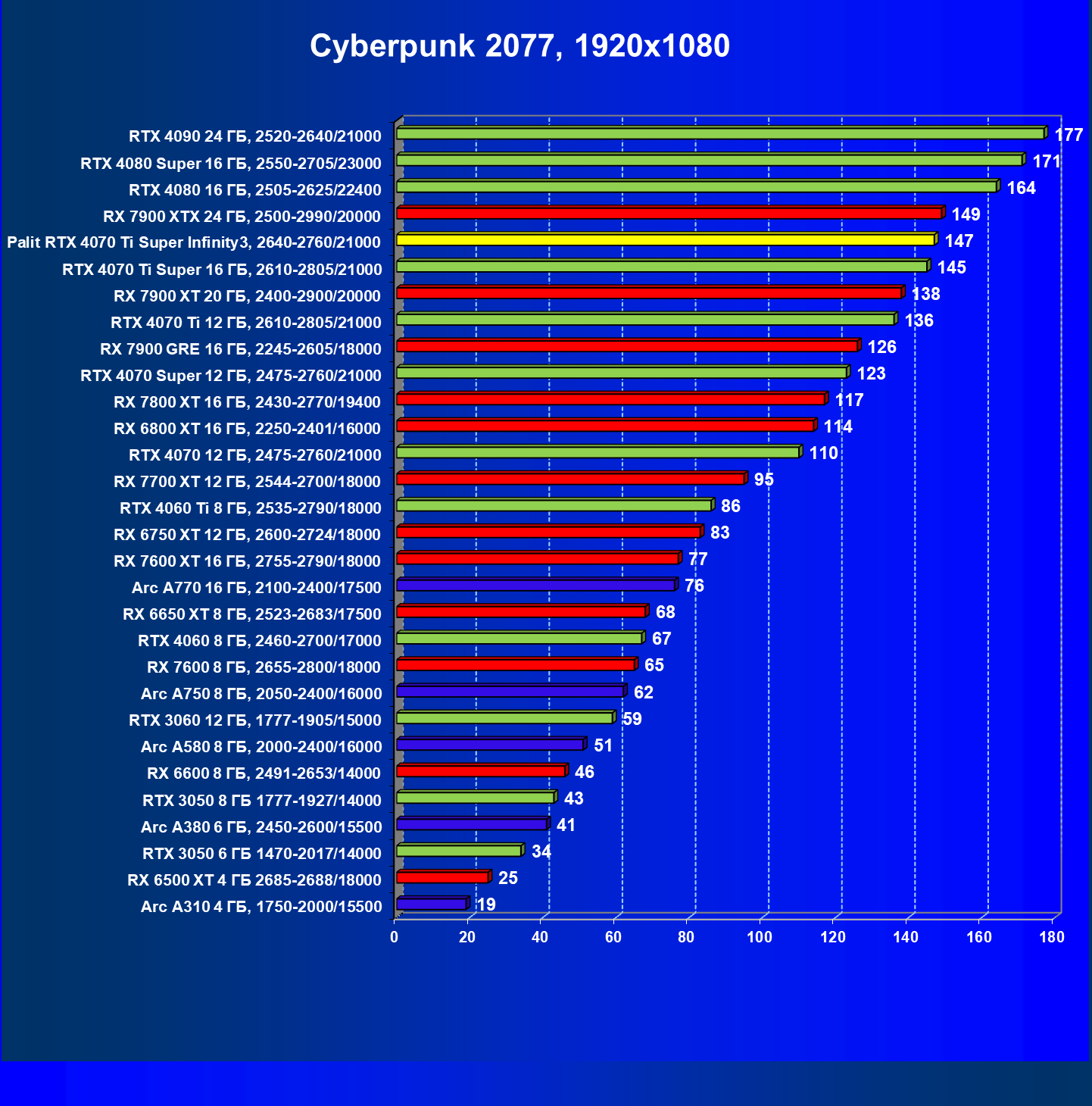 | 16 | Palit RTX 4070 Ti Super Infinity3, 2640—2760/21000 | 374 | 3519 | 94 000 |