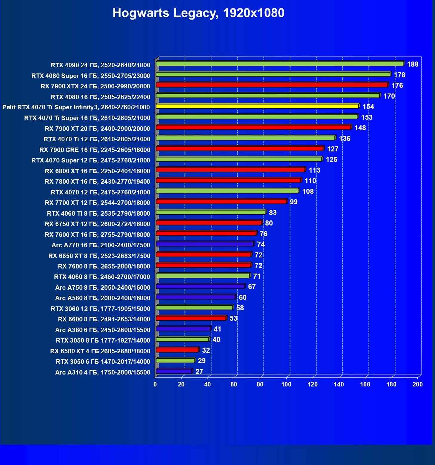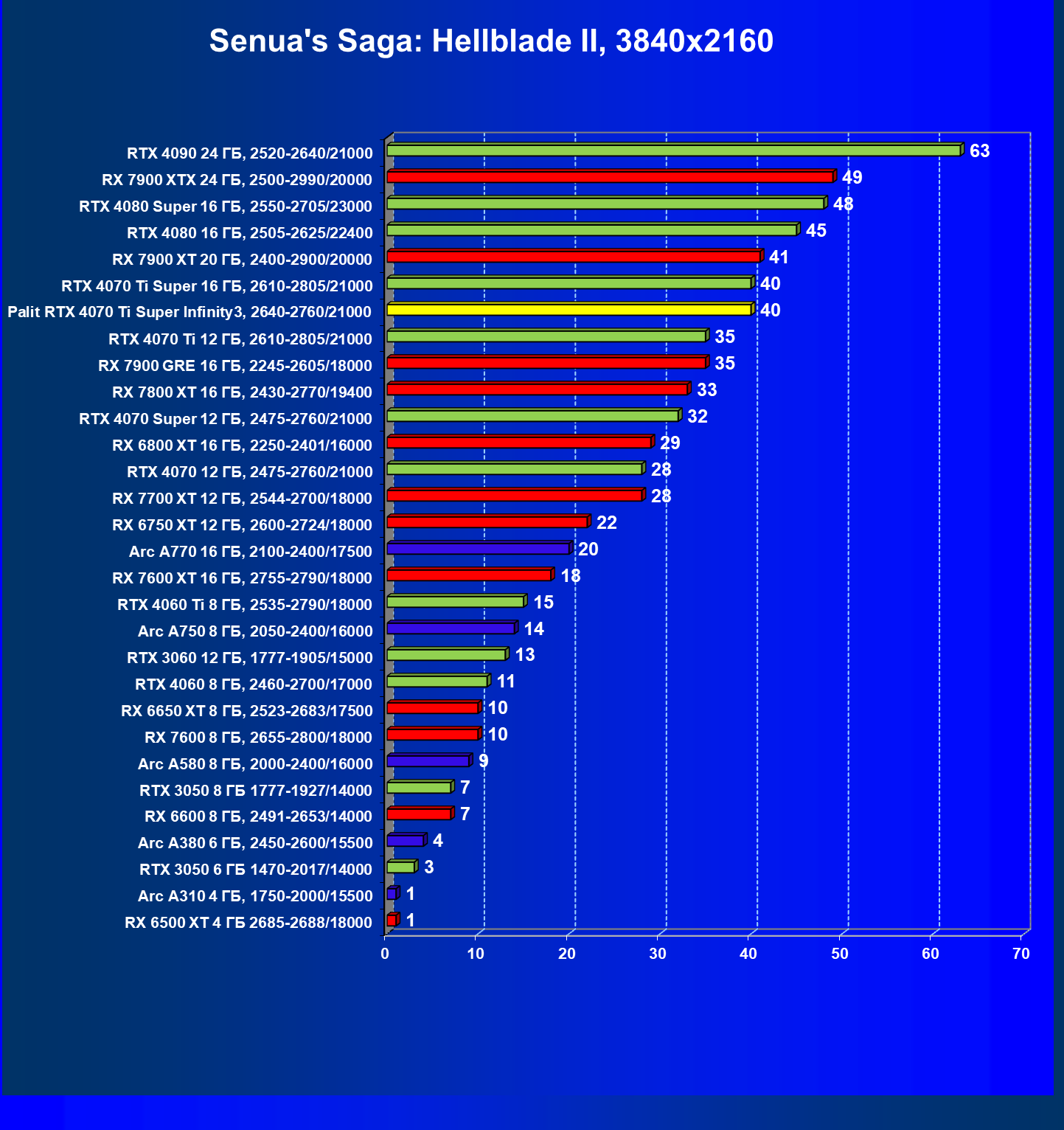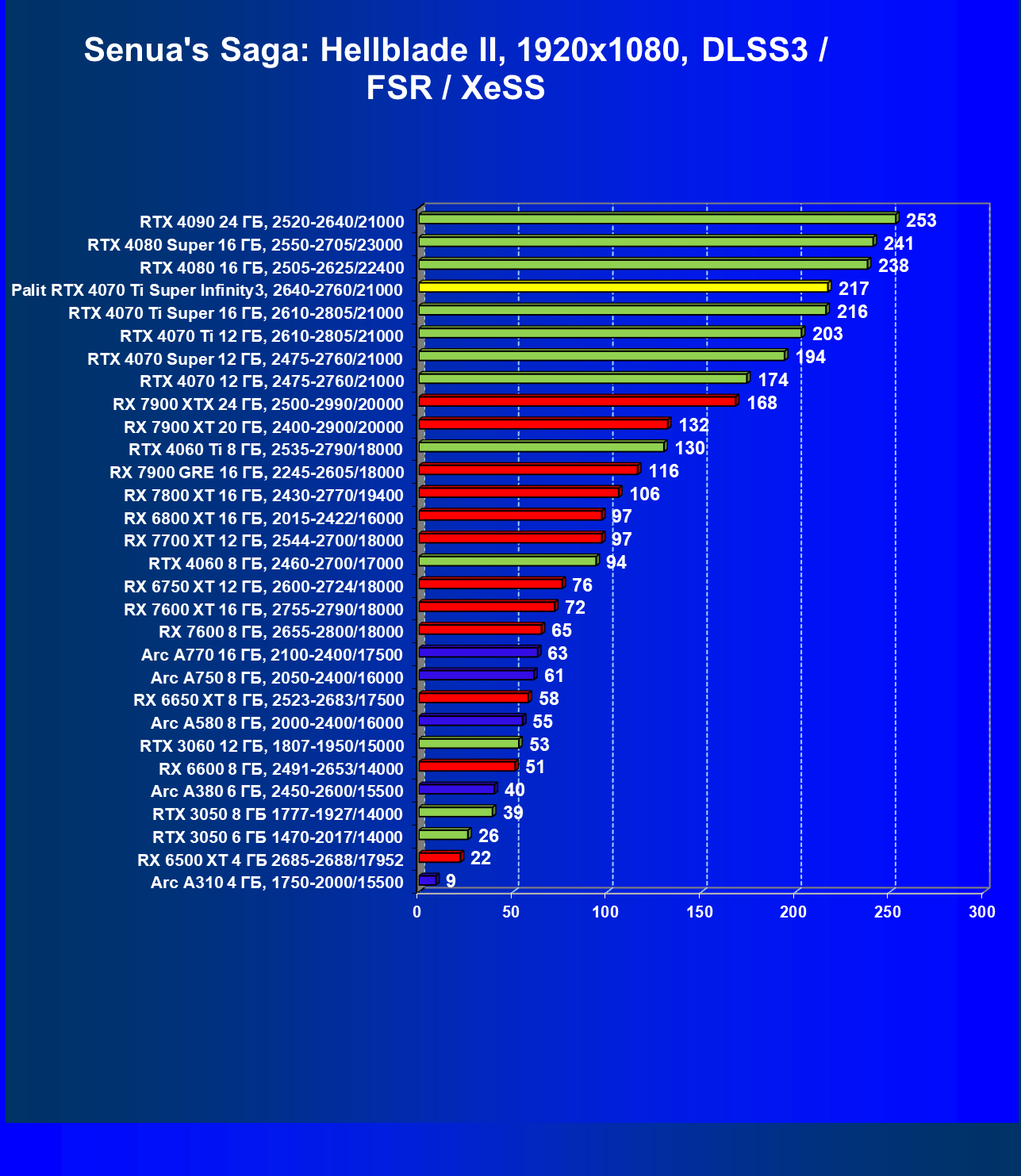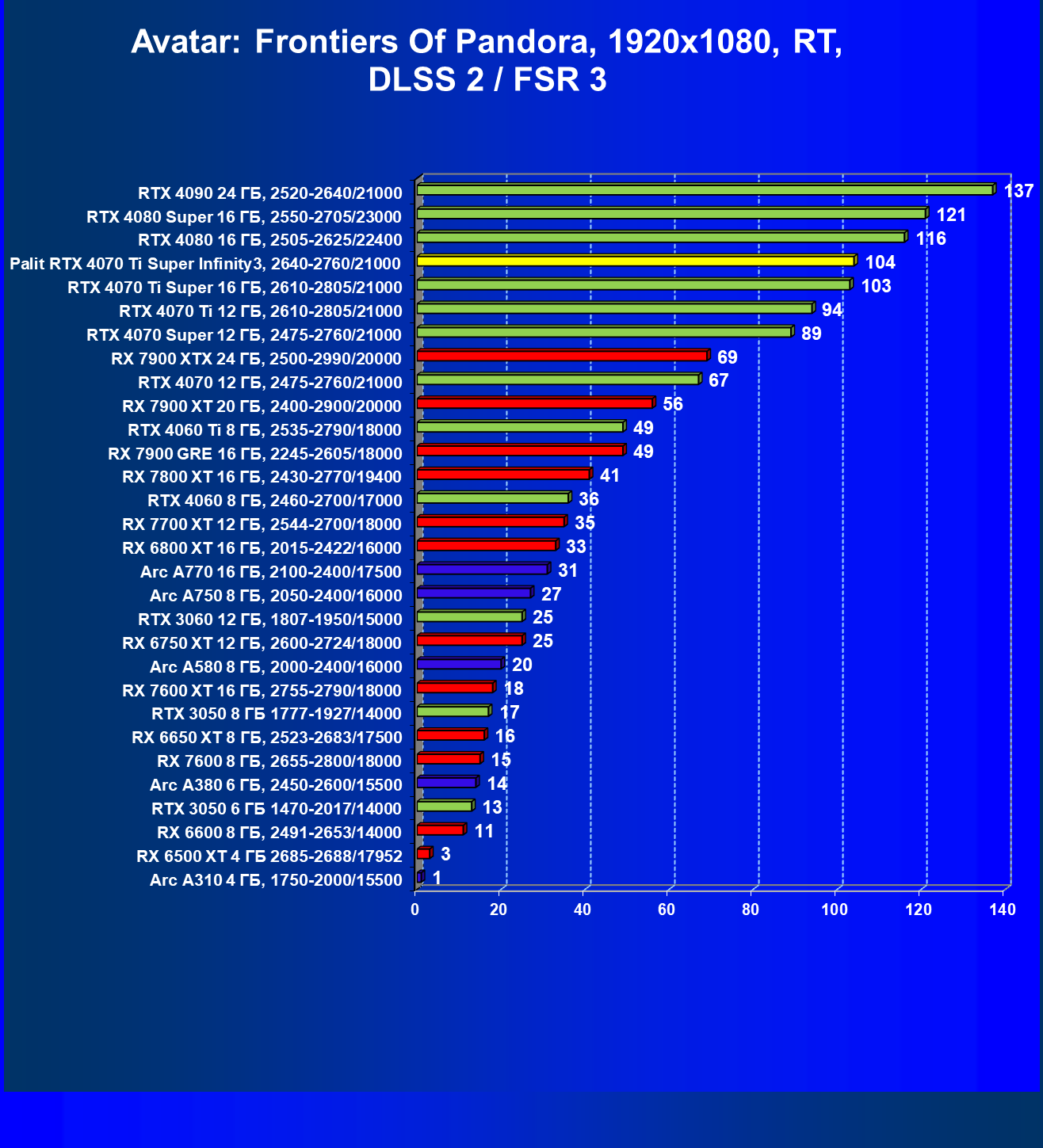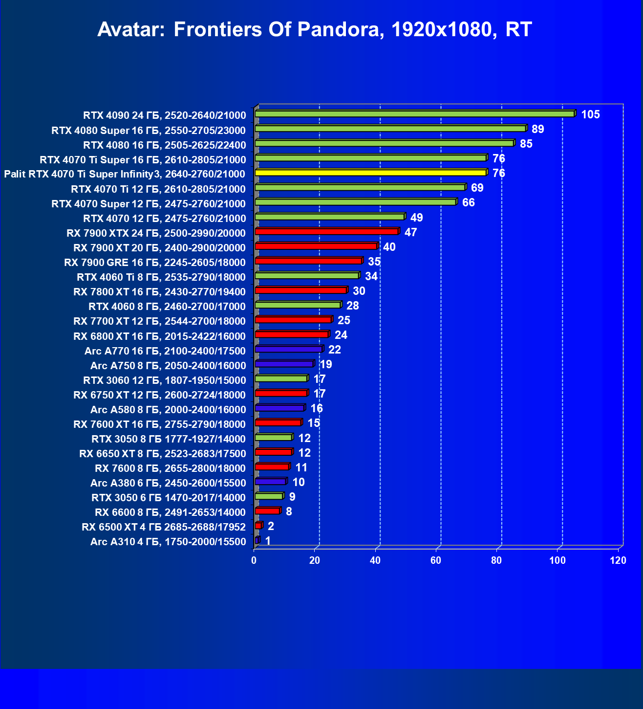 | 16 | Palit RTX 4070 Ti Super Infinity3, 2640—2760/21000 | 374 | 3519 | 94 000 |