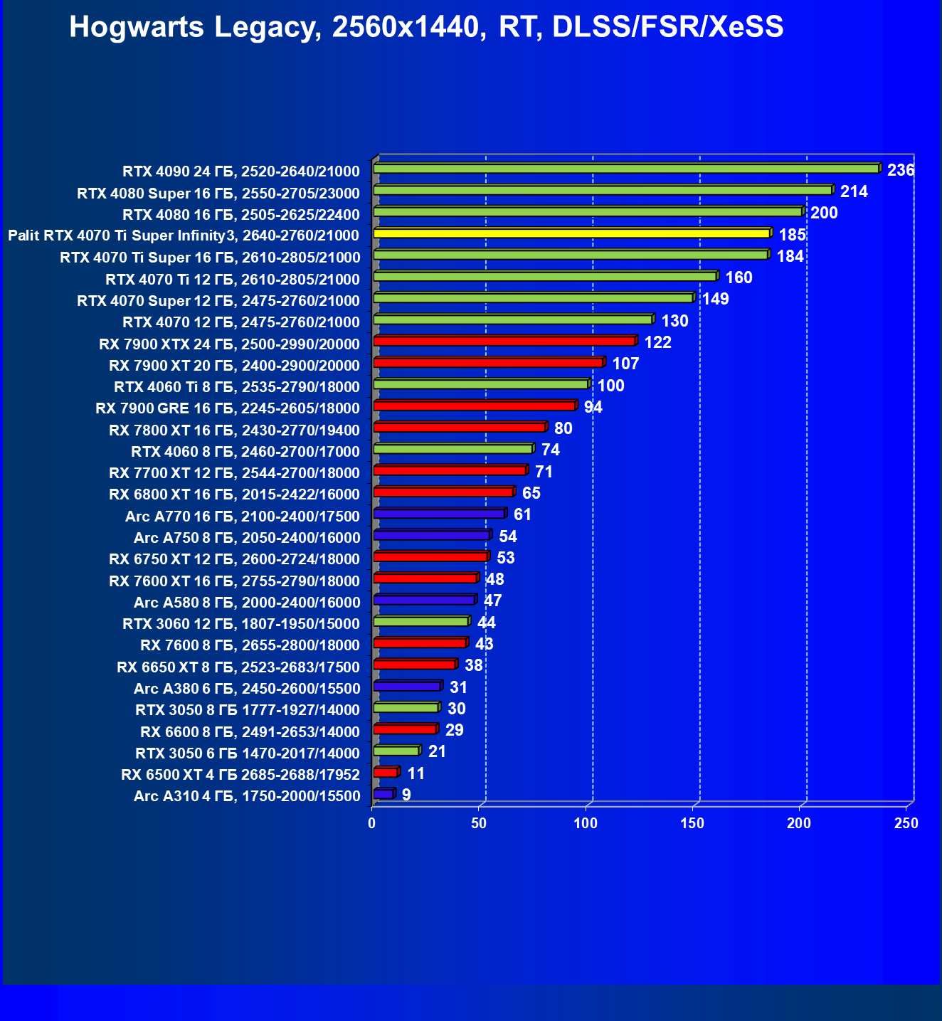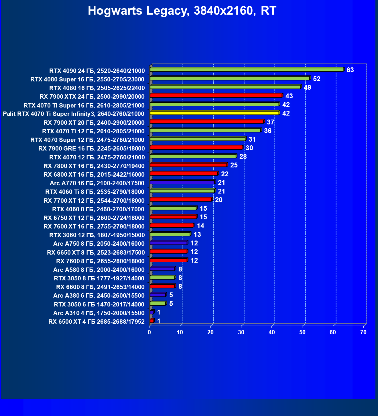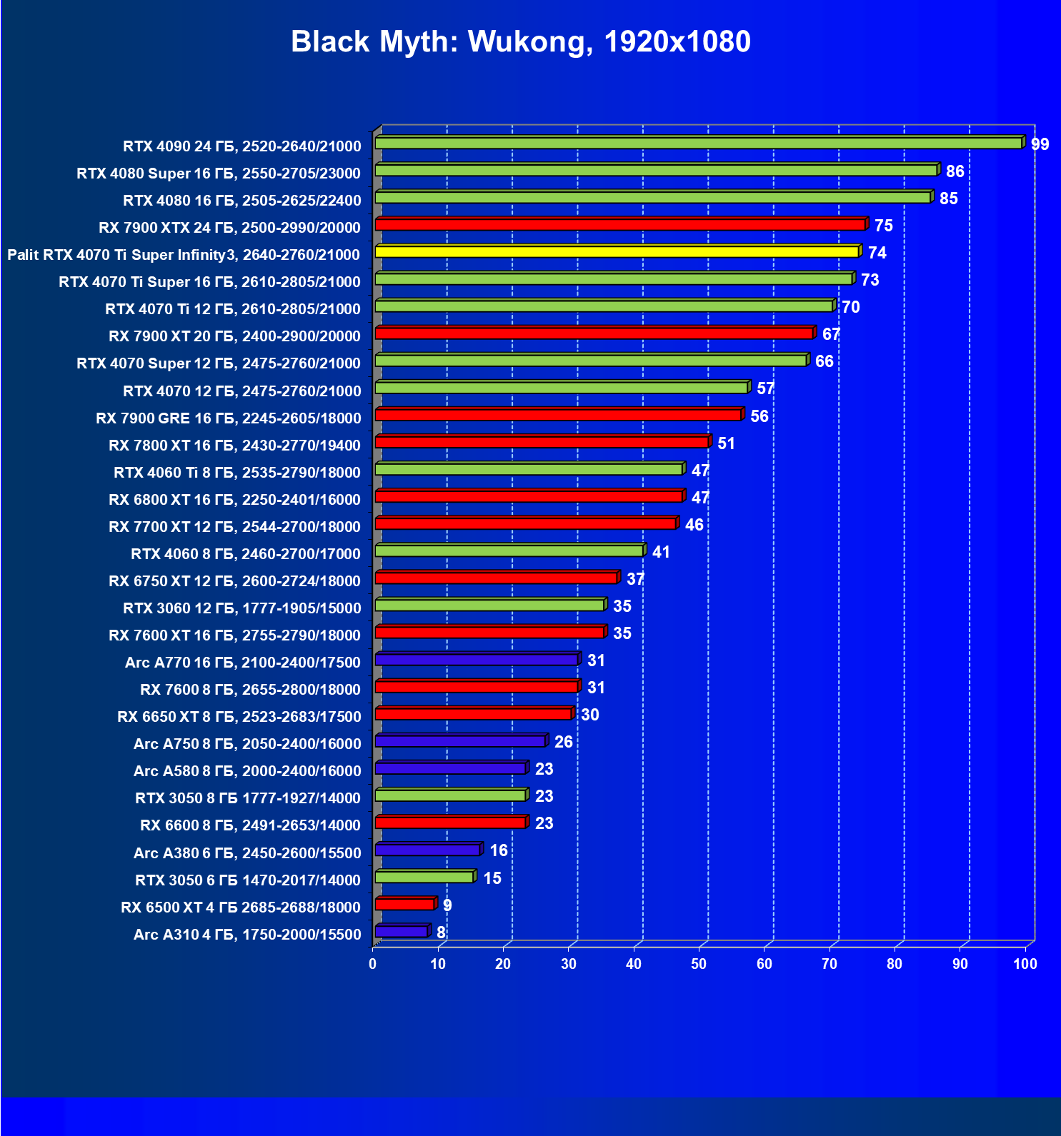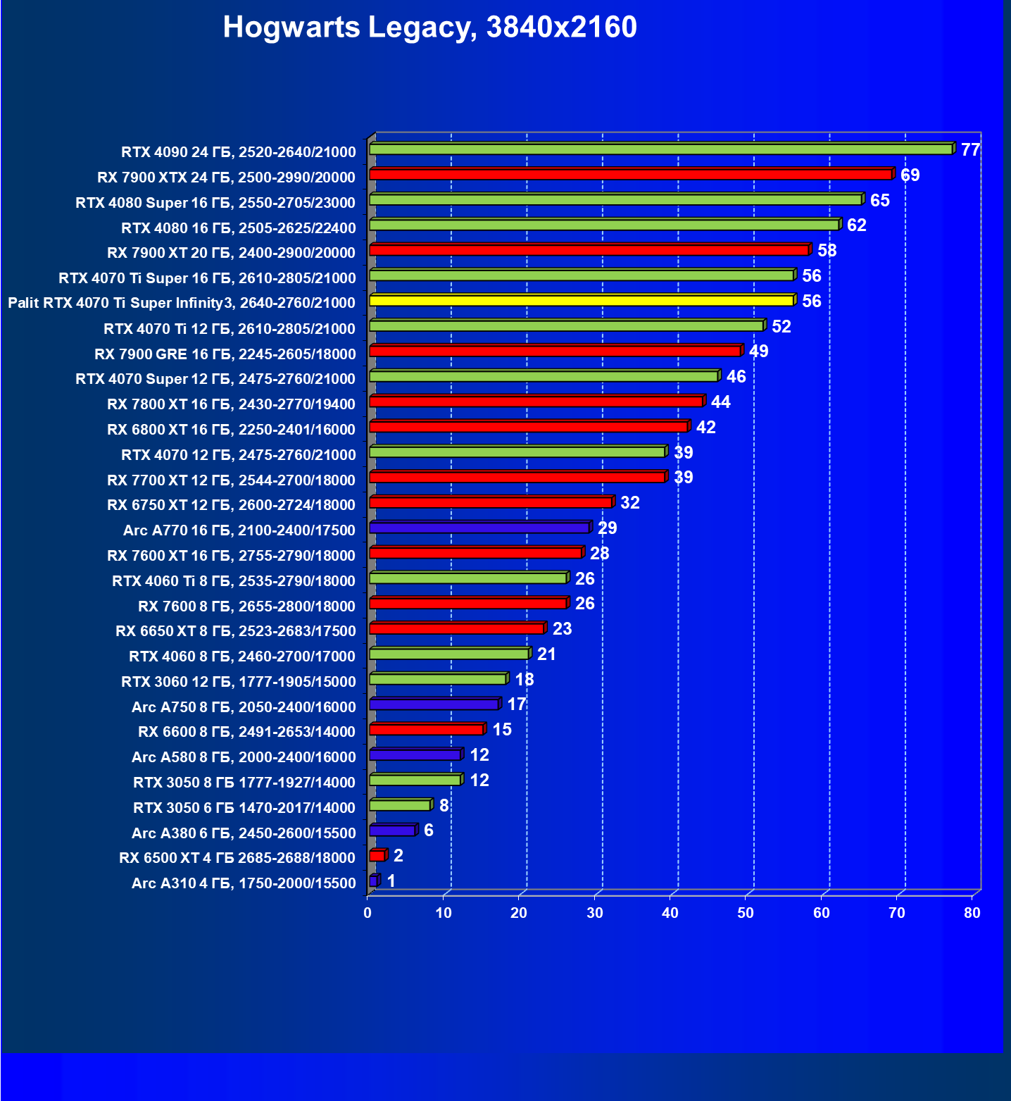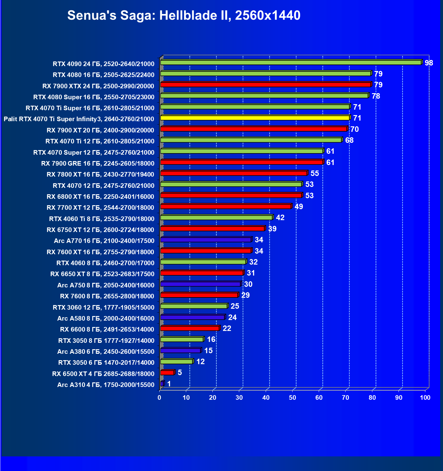 | 16 | Palit RTX 4070 Ti Super Infinity3, 2640—2760/21000 | 374 | 3519 | 94 000 |