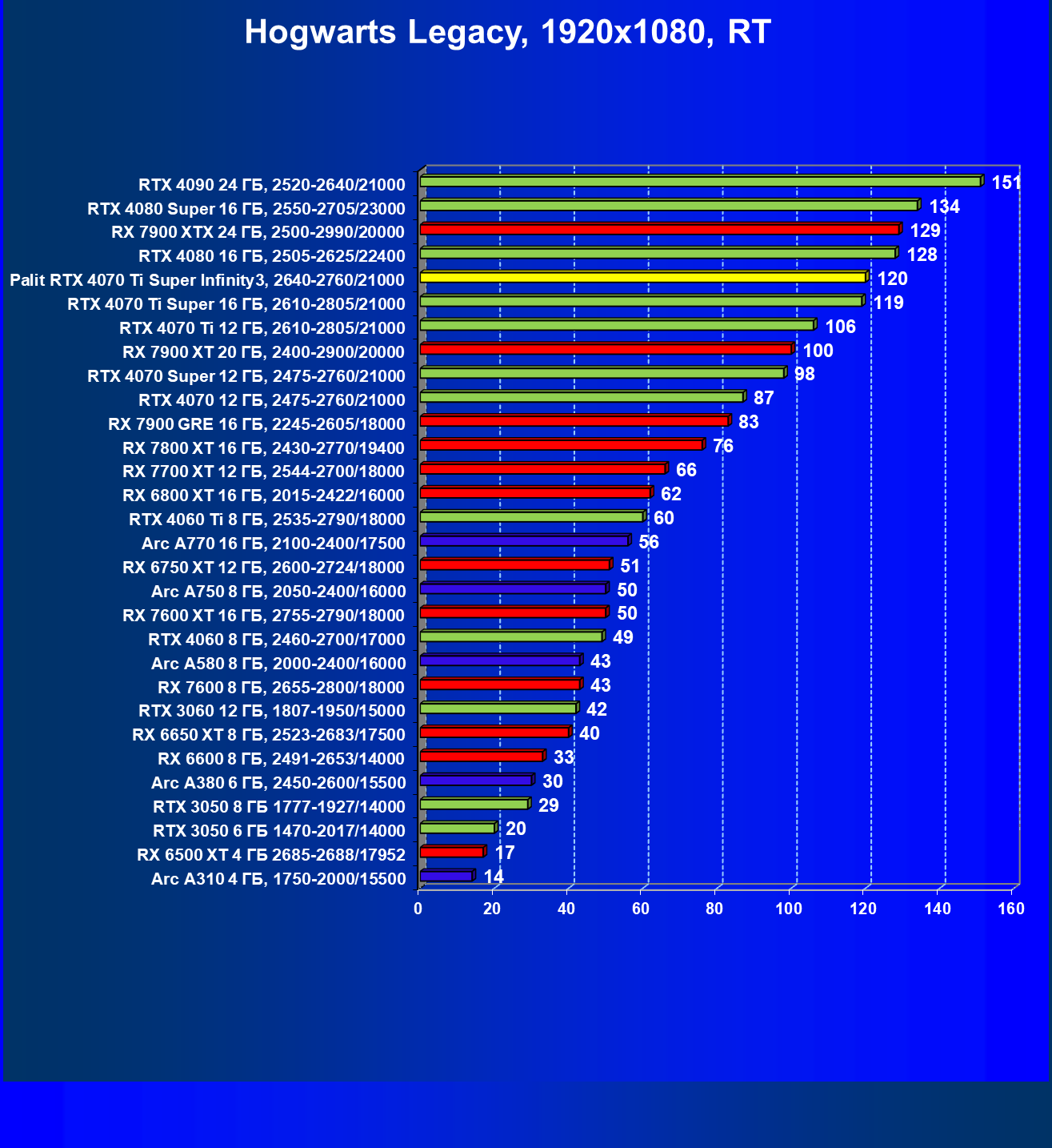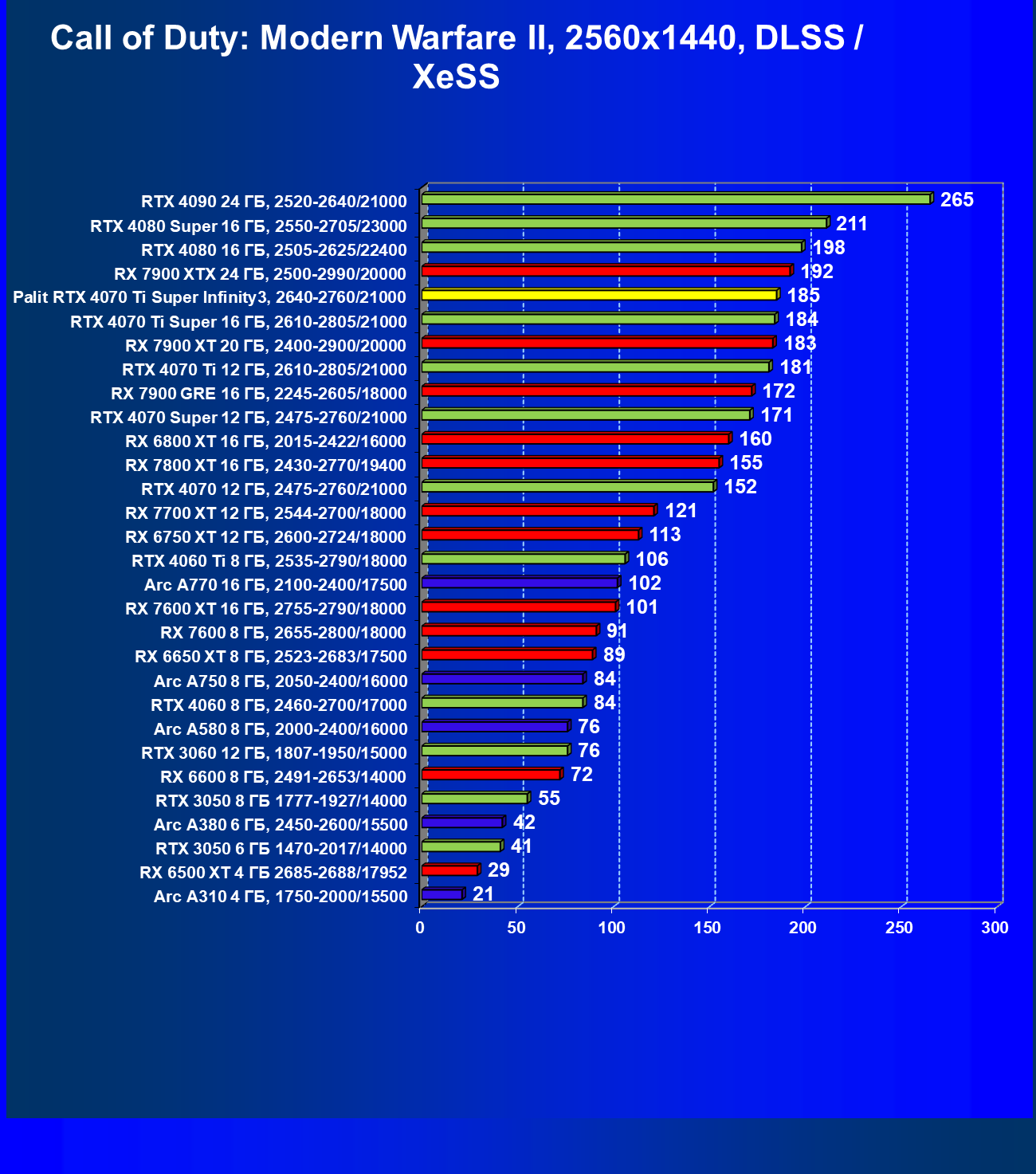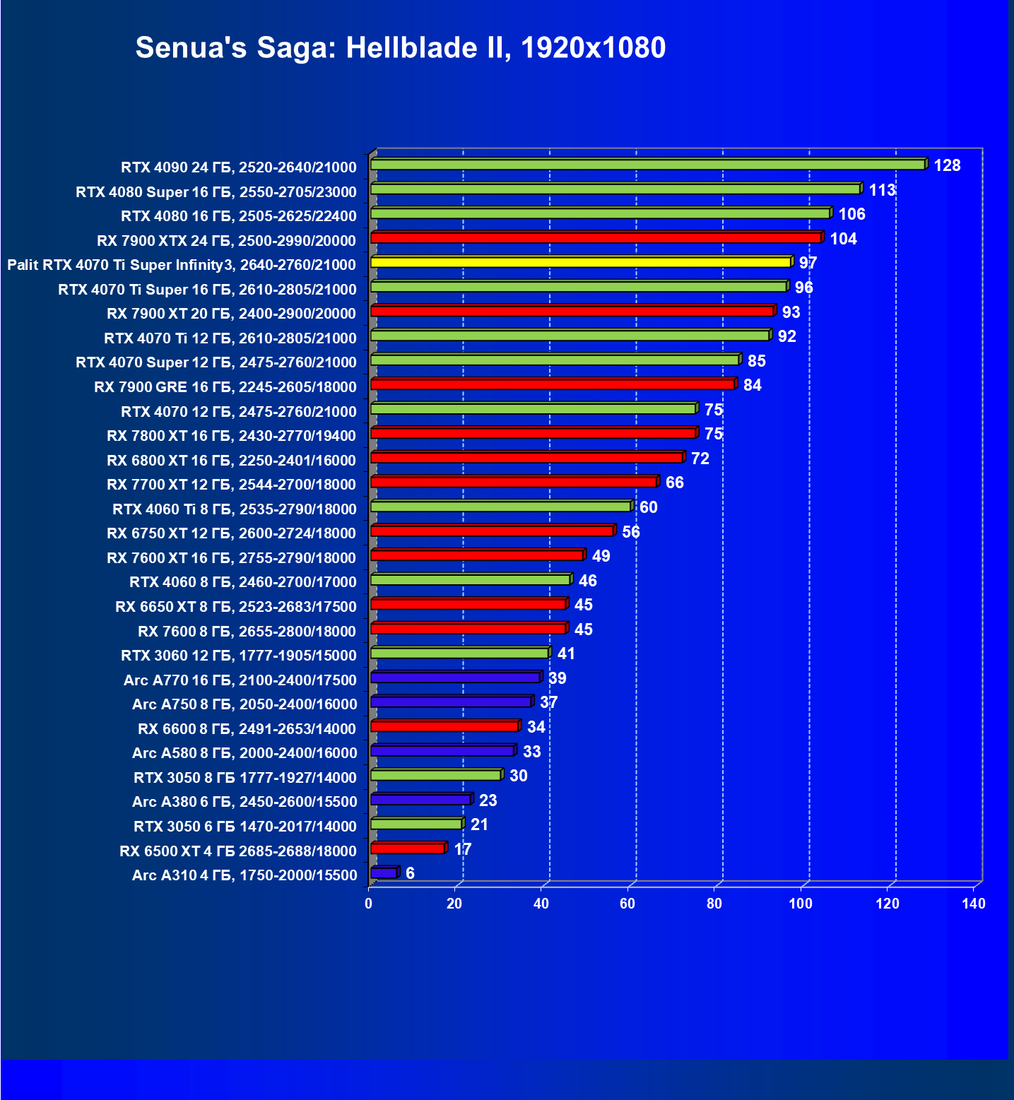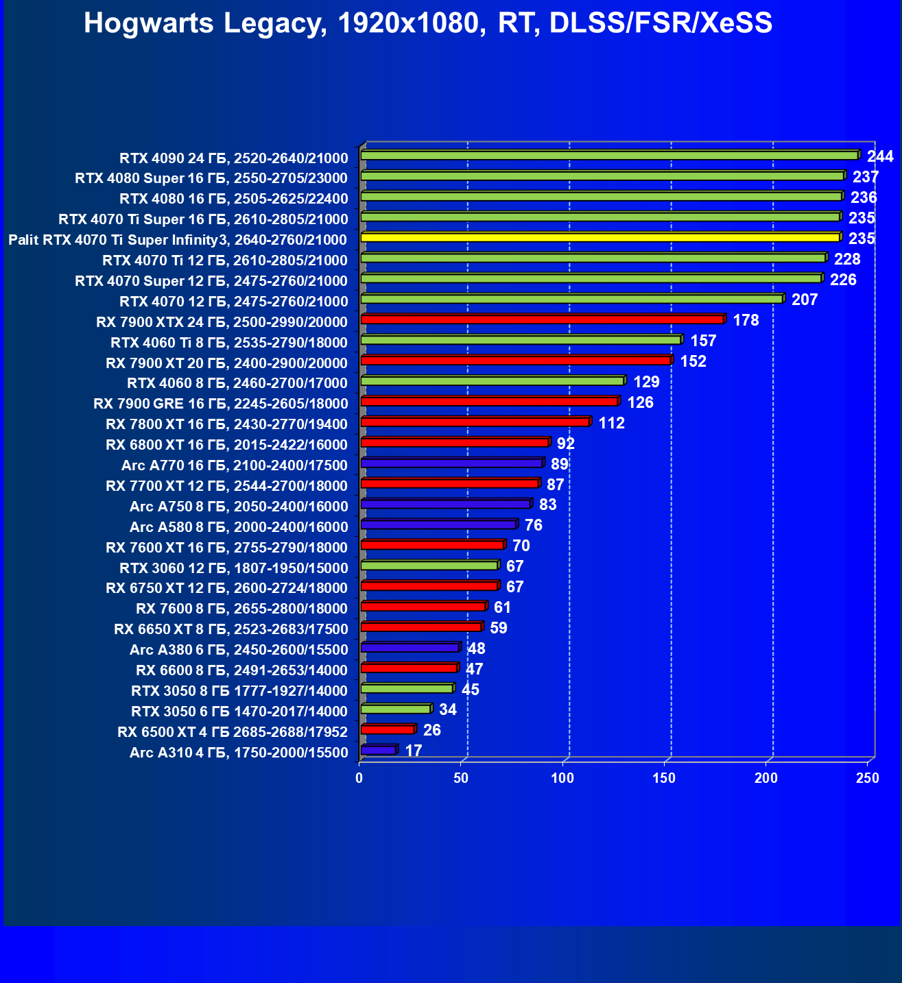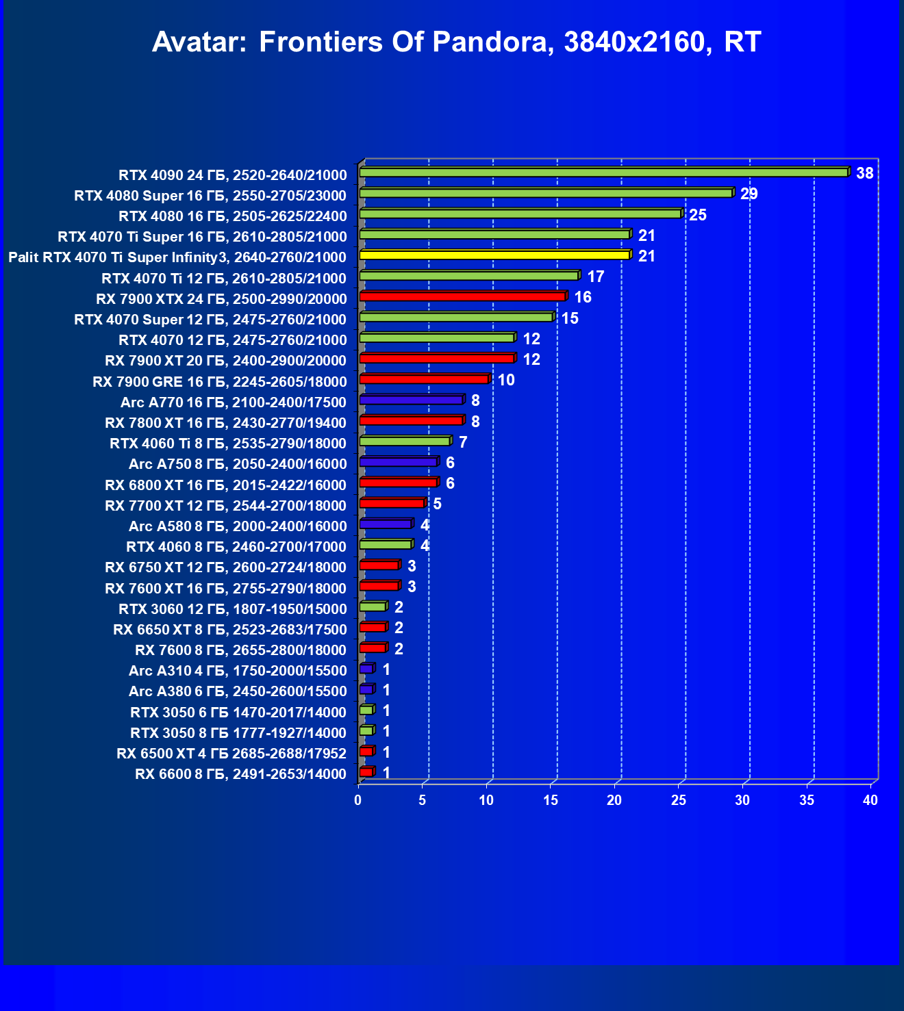 | 16 | Palit RTX 4070 Ti Super Infinity3, 2640—2760/21000 | 374 | 3519 | 94 000 |