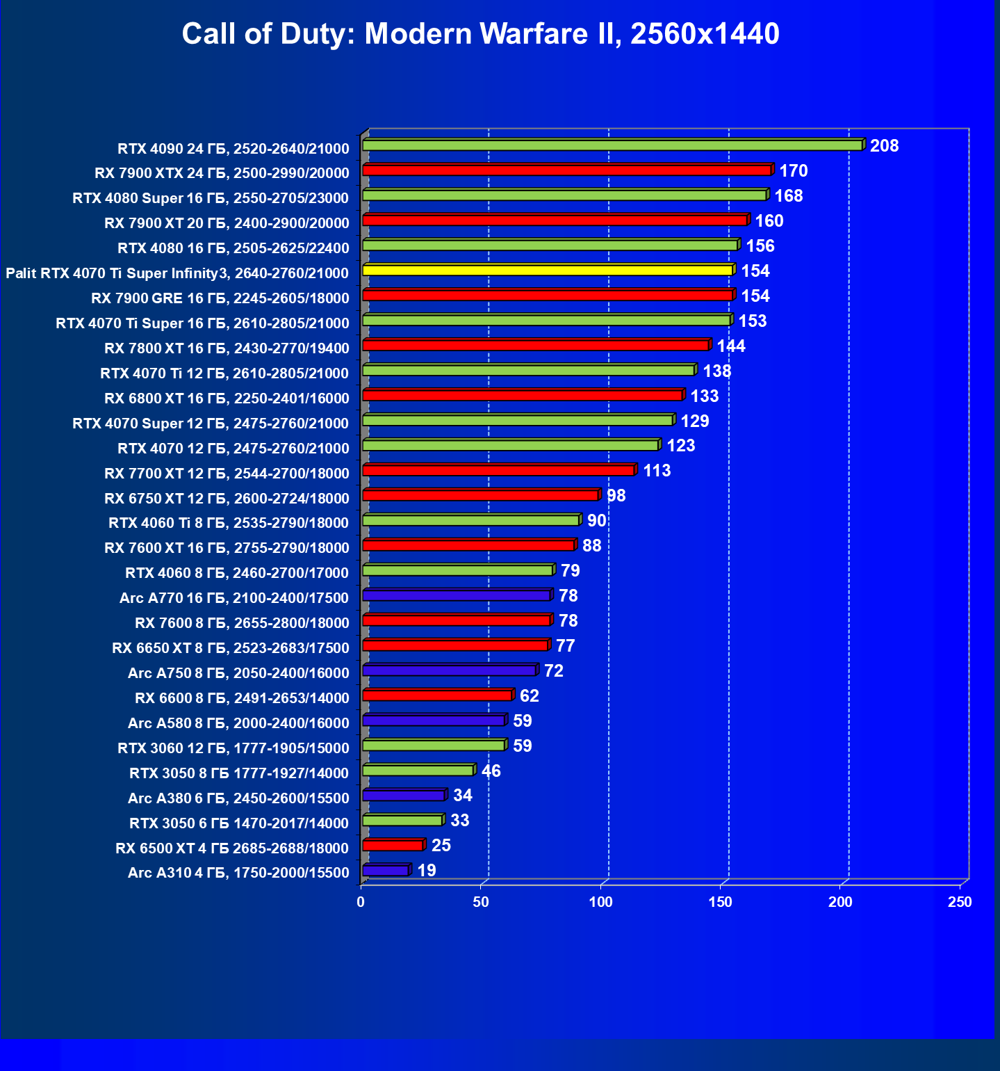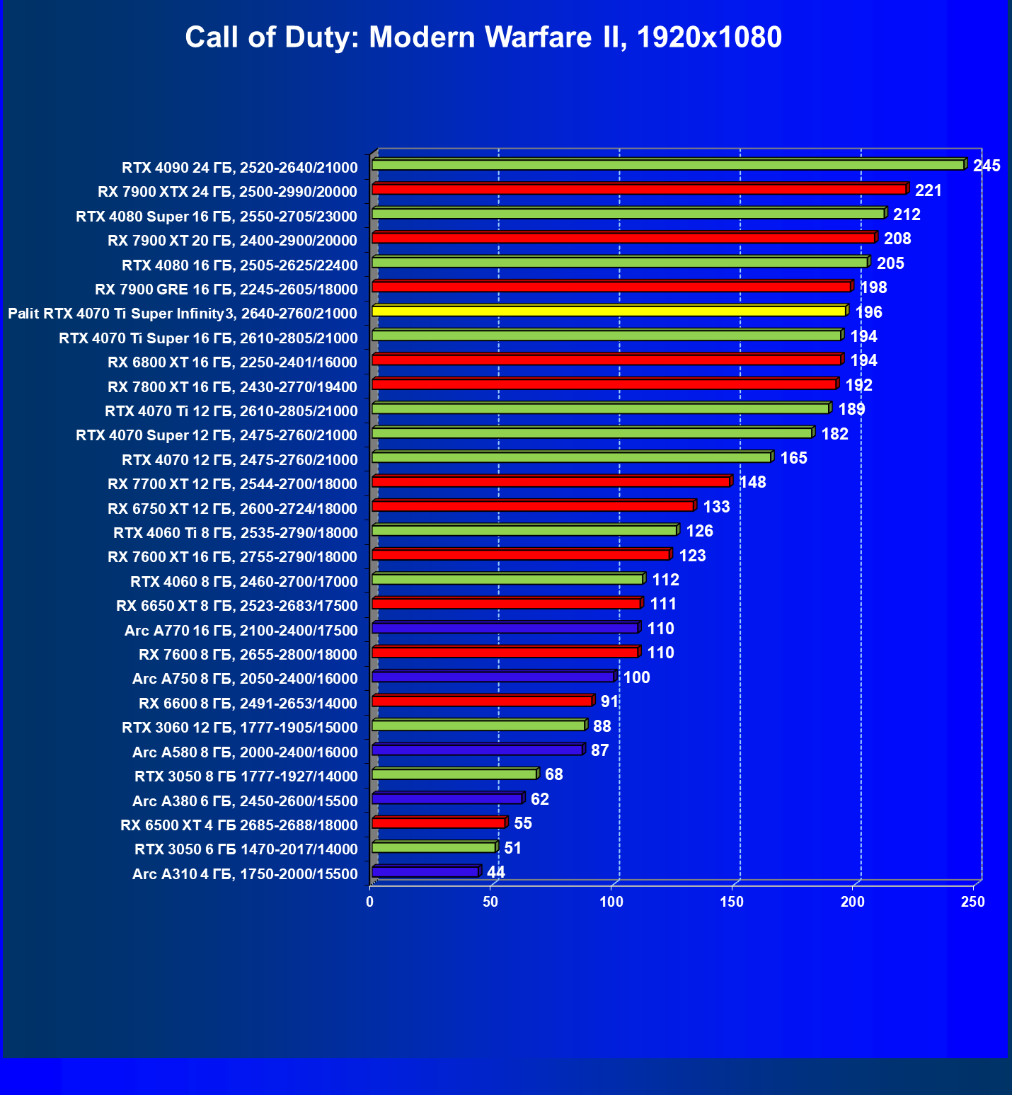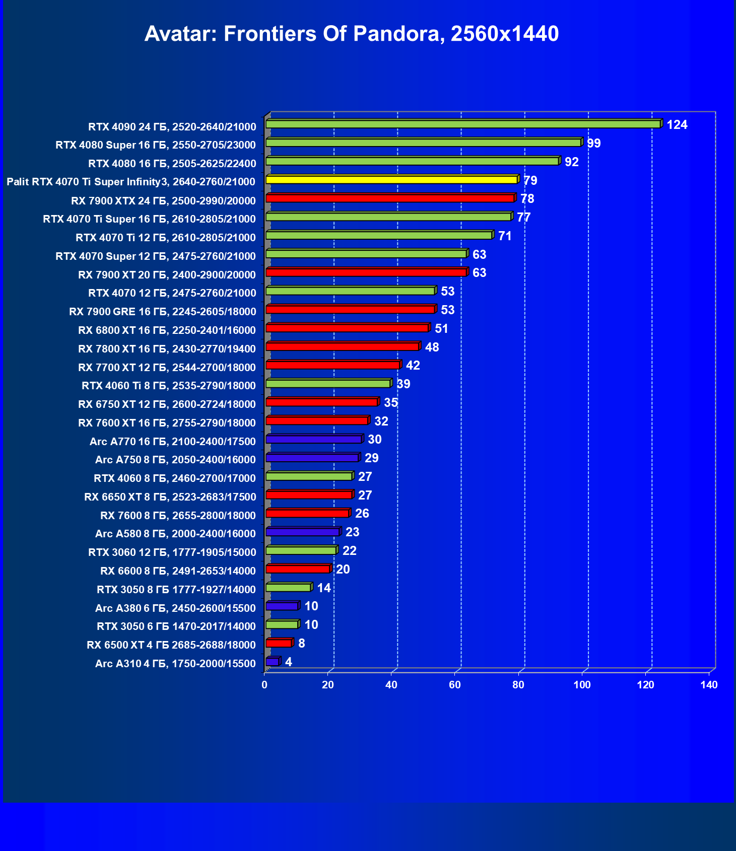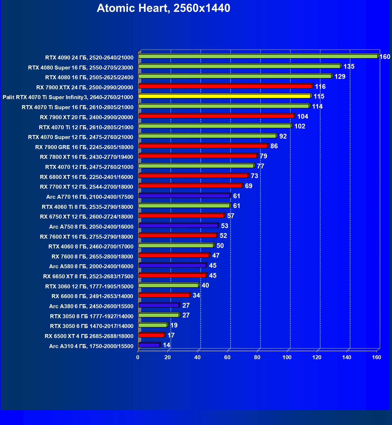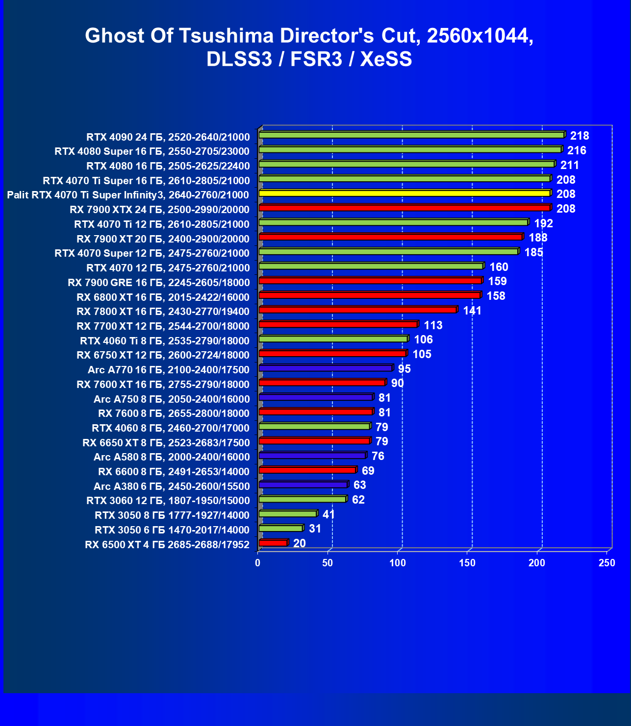 | 16 | Palit RTX 4070 Ti Super Infinity3, 2640—2760/21000 | 374 | 3519 | 94 000 |