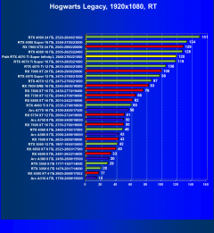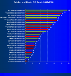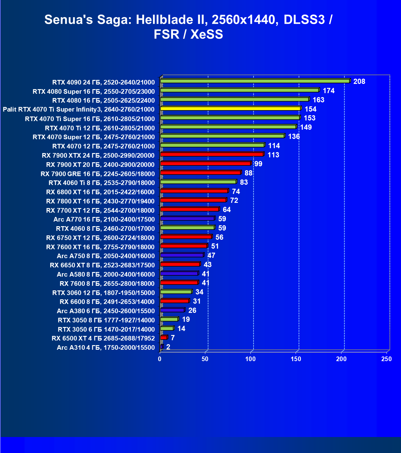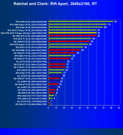 - Результаты тестов со включенной аппаратной трассировкой лучей и/или DLSS/FSR/XeSS в разрешениях 1920×1080, 2560×1440 и 3840×2160