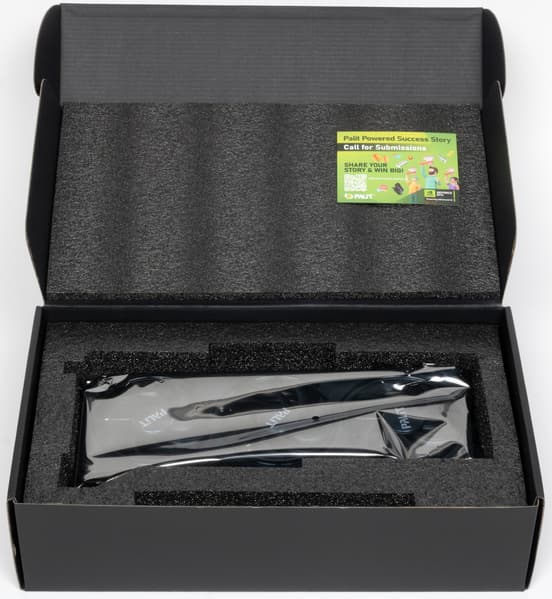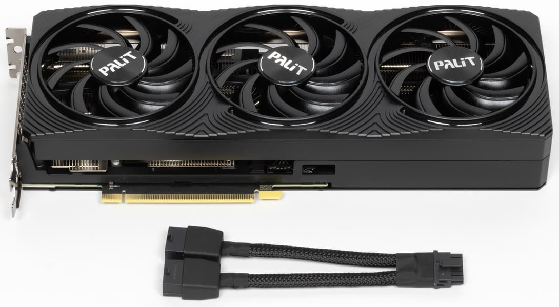 Карта Palit имеет 16-контактный разъем питания версии PCIe 5.0. Хотя в комплекте поставки имеется адаптер-переходник для подключения разъемов питания типа PCIe 2.0 (с 2 таких разъемов), лучше всё же использовать блоки питания стандарта ATX 3.0 с полноценной поддержкой питания PCIe 5.0 (с кабелем 12VHPWR). Карта может понравиться владельцам ПК, не приветствующих подсветку.