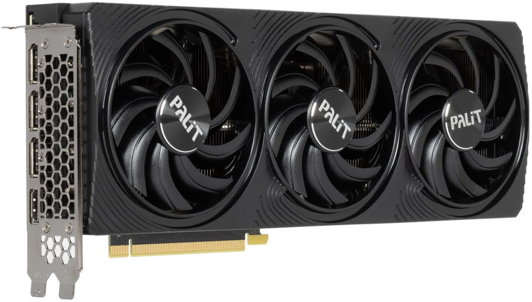 Palit GeForce RTX 4070 Ti Super Infinity3 OC (16 ГБ) — еще один вариант ускорителя высокого уровня, созданный специально для компактных ПК. Точнее, так это заявляется, однако на практике карта всё равно крупная и толстая (29 см в длину, 12 см в высоту, 5 см в толщину) и в типовые корпуса под платы формата Mini-ITX не влезет как минимум по толщине (более двух слотов). Никаких других признаков ориентации на компактные системы мы не обнаружили, печатная плата не переделана относительно «массовой» версии JetStream, просто уменьшен по толщине кулер. И поскольку никакого даунвольтинга, например, не проведено, то потребление карты вполне типичное (до 284 Вт), а нагрев и шум выше, чем у типичных решений на GeForce RTX 4070 Ti Super. Набор видеовыходов стандартный: 3 DP и 1 HDMI.