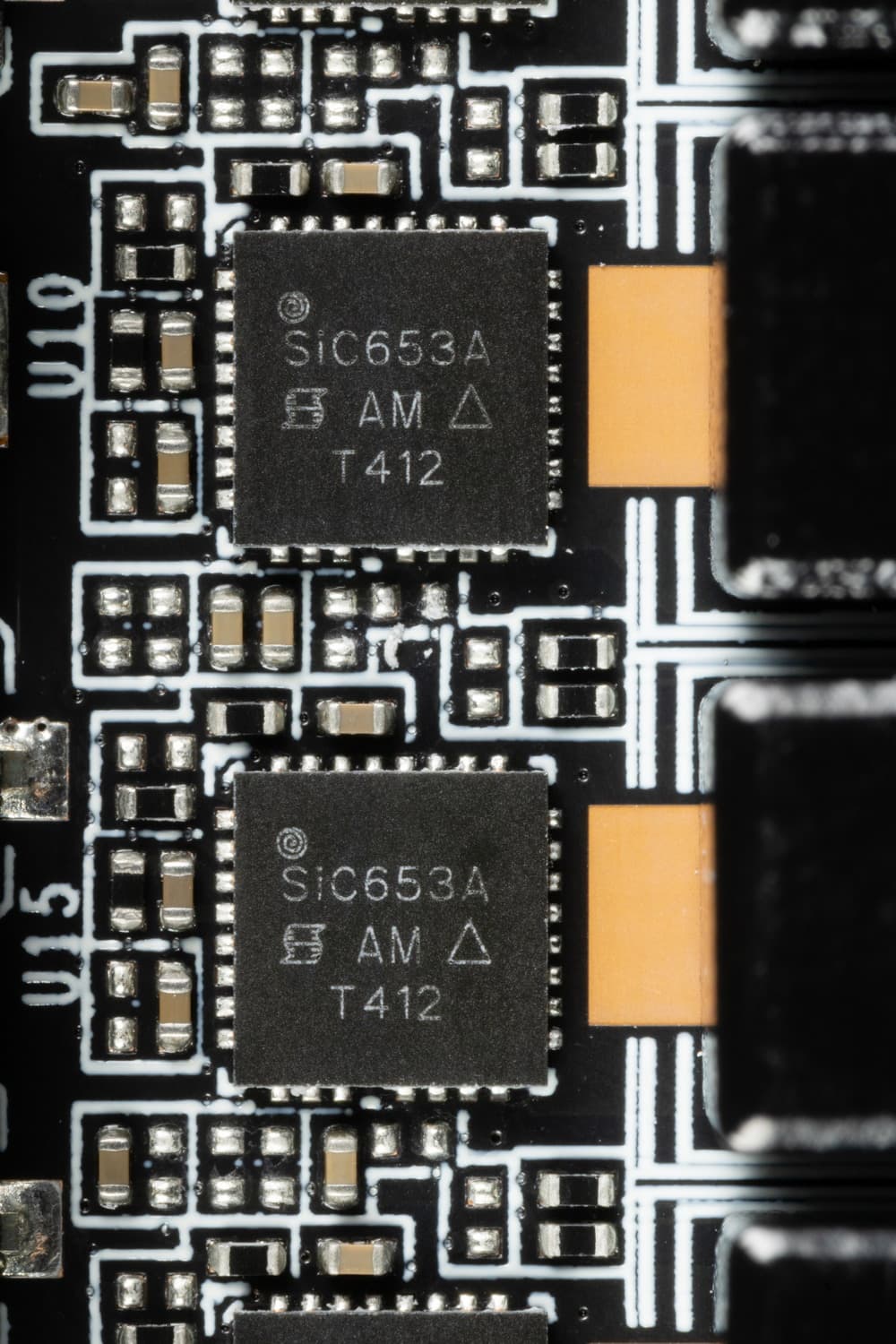 В преобразователе питания используются транзисторные сборки DrMOS — в данном случае SiC653A (Vishay), каждая из которых рассчитана максимально на 50 А.