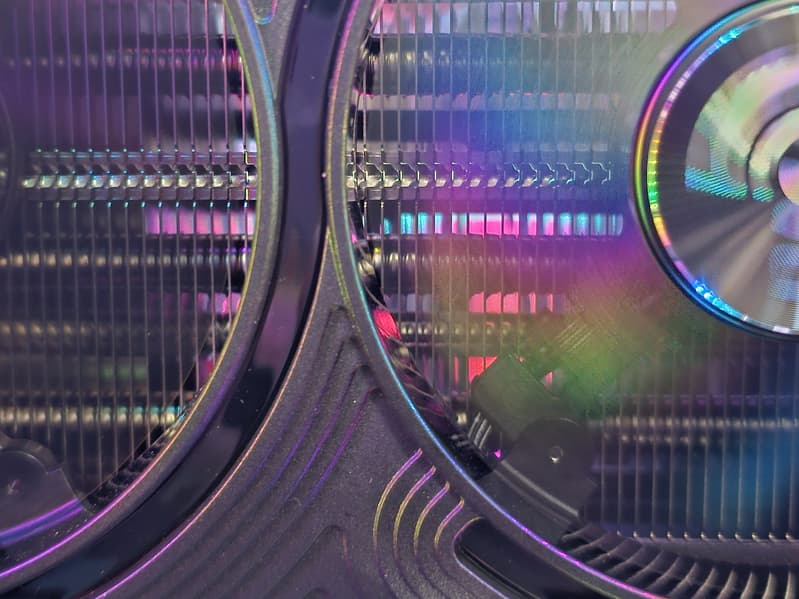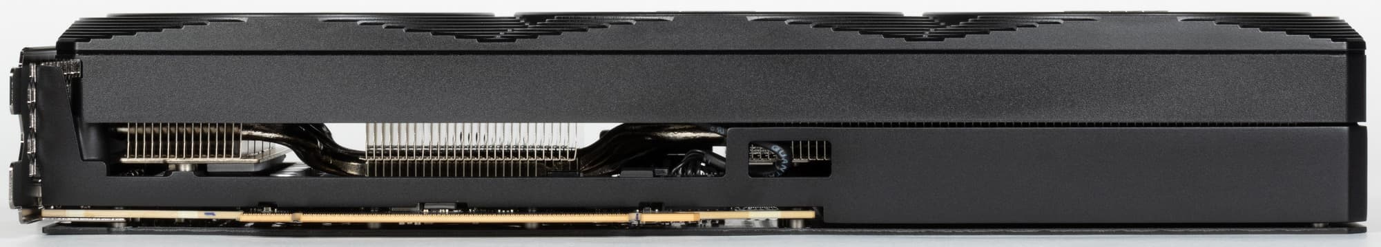 Длина кулера значительно больше длины печатной платы, правый вентилятор продувает радиатор насквозь в хвостовой части карты.