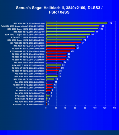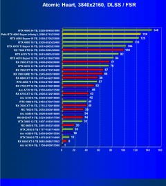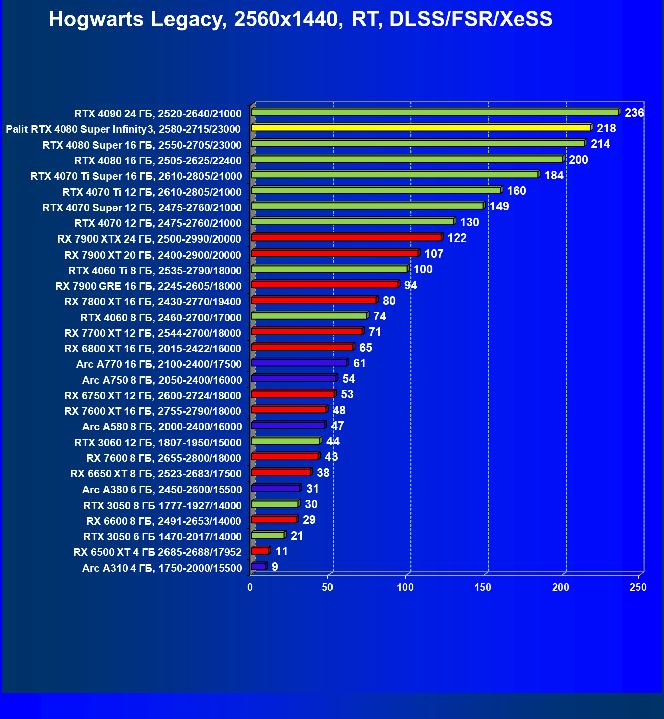 - Результаты тестов со включенной аппаратной трассировкой лучей и/или DLSS/FSR/XeSS в разрешениях 1920×1080, 2560×1440 и 3840×2160