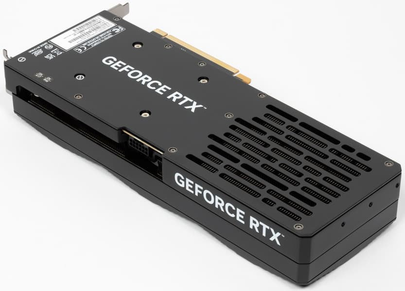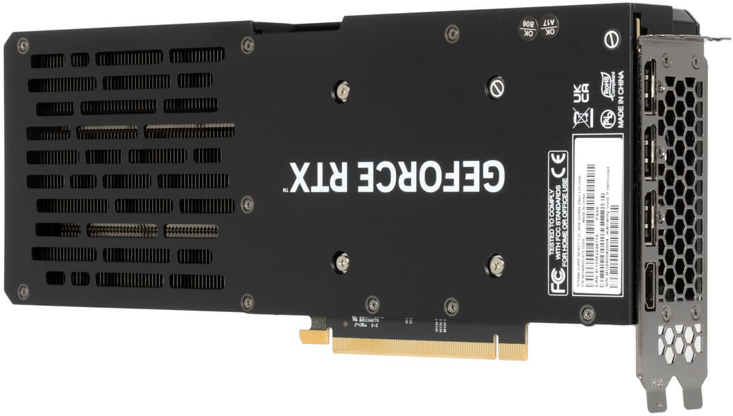 Карта Palit имеет 16-контактный разъем питания версии PCIe 5.0. Хотя в комплекте поставки имеется адаптер-переходник для подключения разъемов питания типа PCIe 2.0 (для 3 таких разъемов), лучше всё же использовать блоки питания стандарта ATX 3.0 с полноценной поддержкой питания PCIe 5.0 (с кабелем 12VHPWR). Напомню, что карта не оснащена подсветкой.