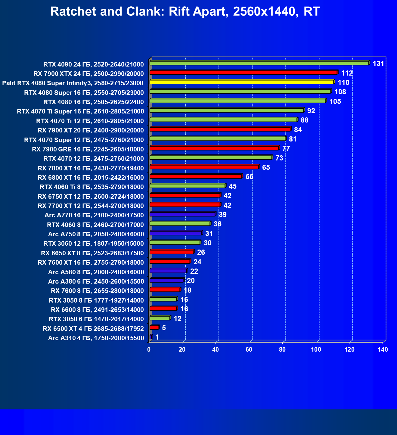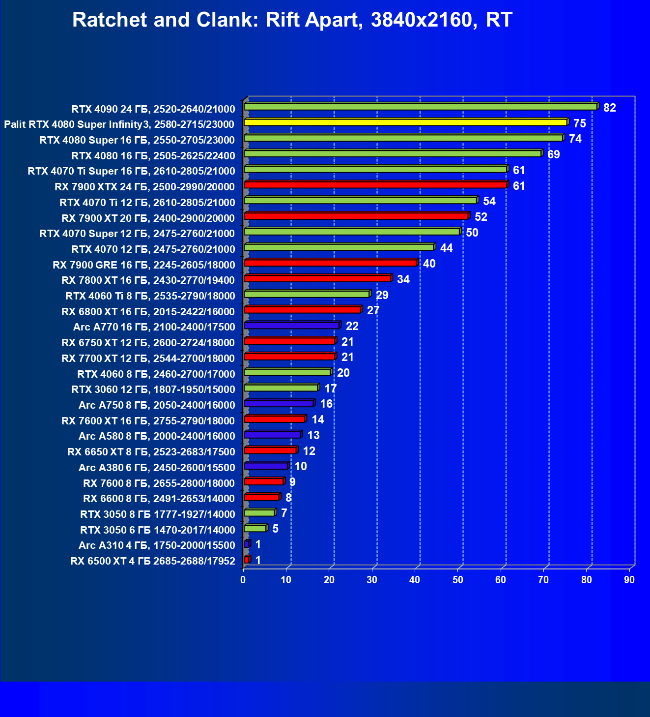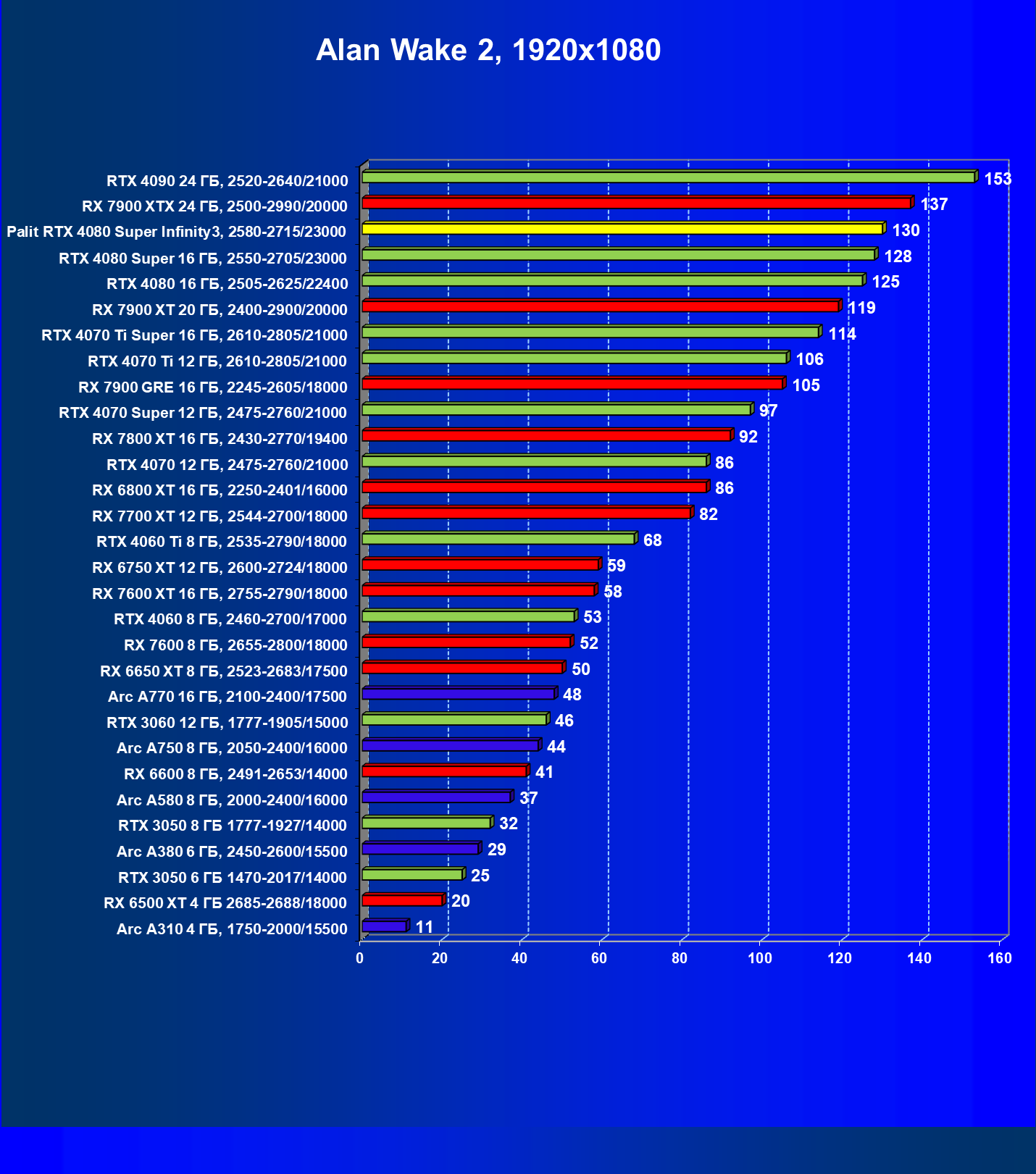 Безусловно, когда мы имеем дело с играми с RT, решения AMD сильно проседают в рейтинге: Radeon RX 7900 XTX весьма существенно уступает даже GeForce RTX 4080, не говоря уже о GeForce RTX 4080 Super.