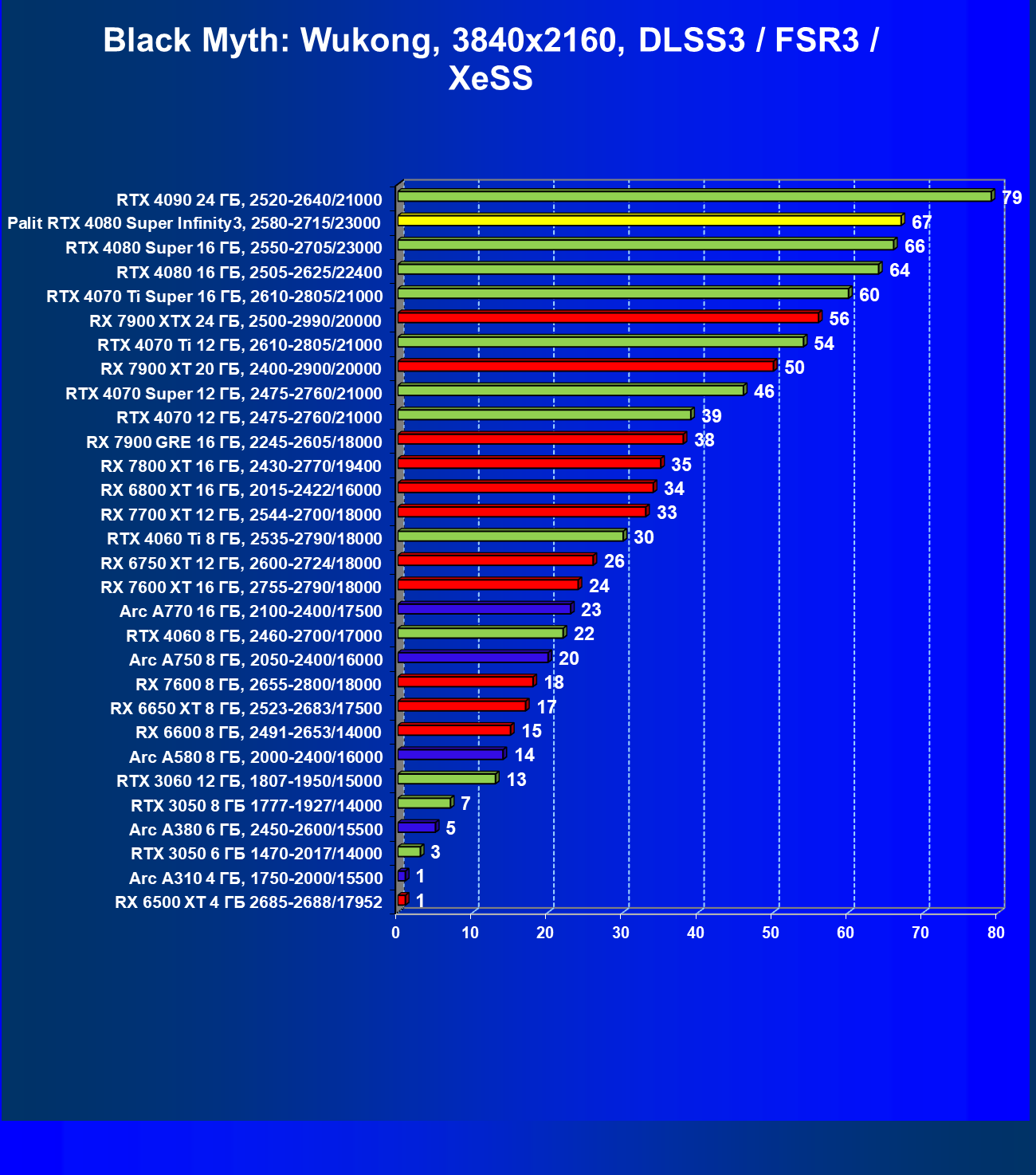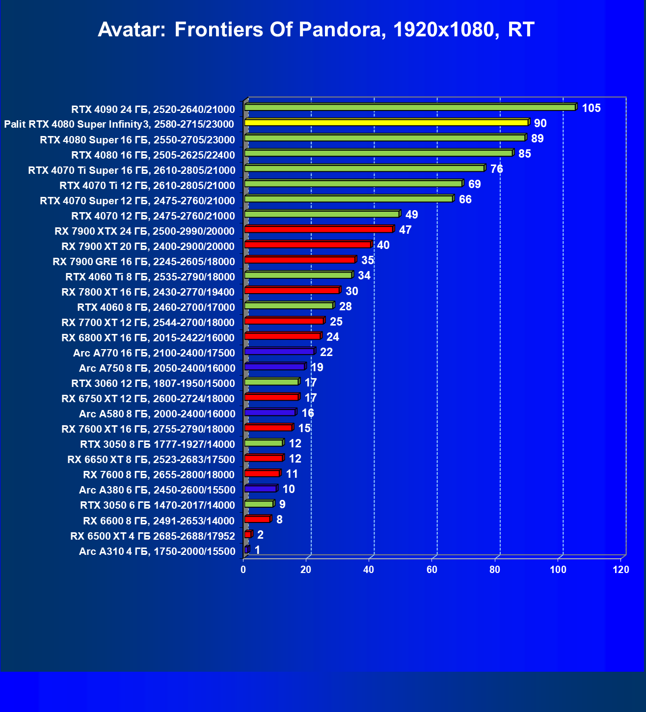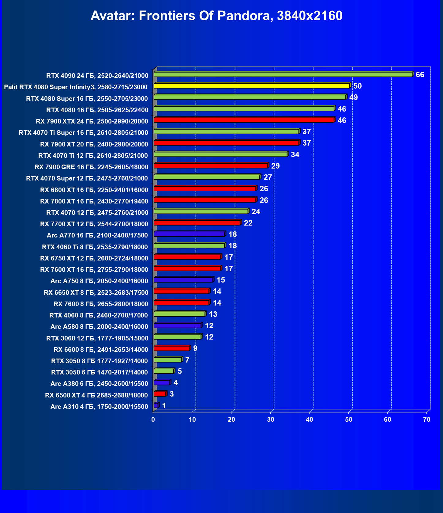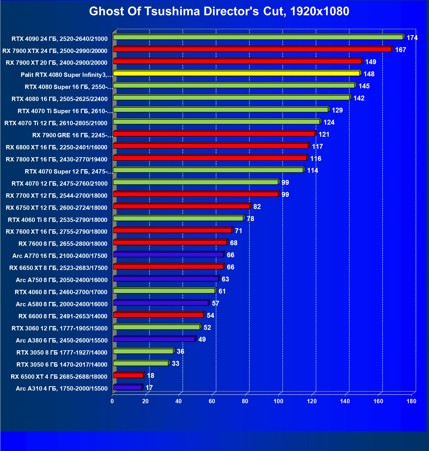 Безусловно, когда мы имеем дело с играми с RT, решения AMD сильно проседают в рейтинге: Radeon RX 7900 XTX весьма существенно уступает даже GeForce RTX 4080, не говоря уже о GeForce RTX 4080 Super.