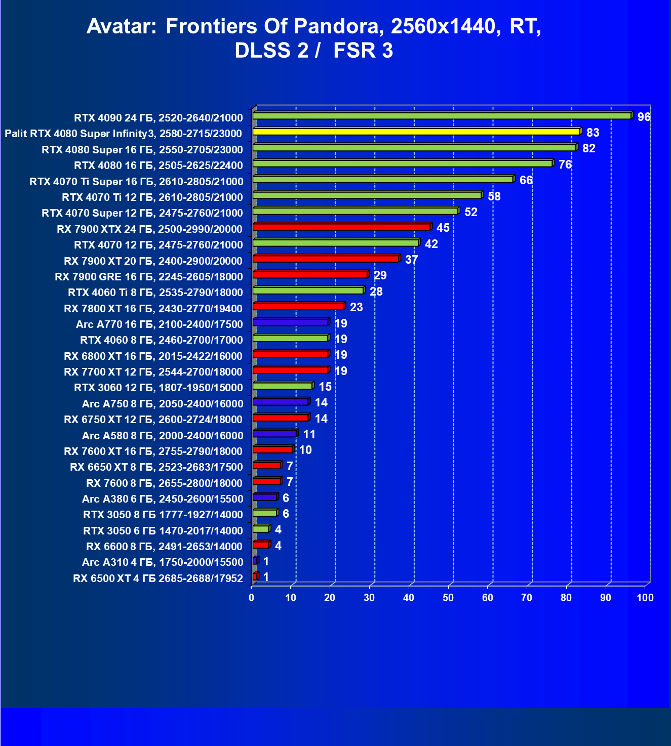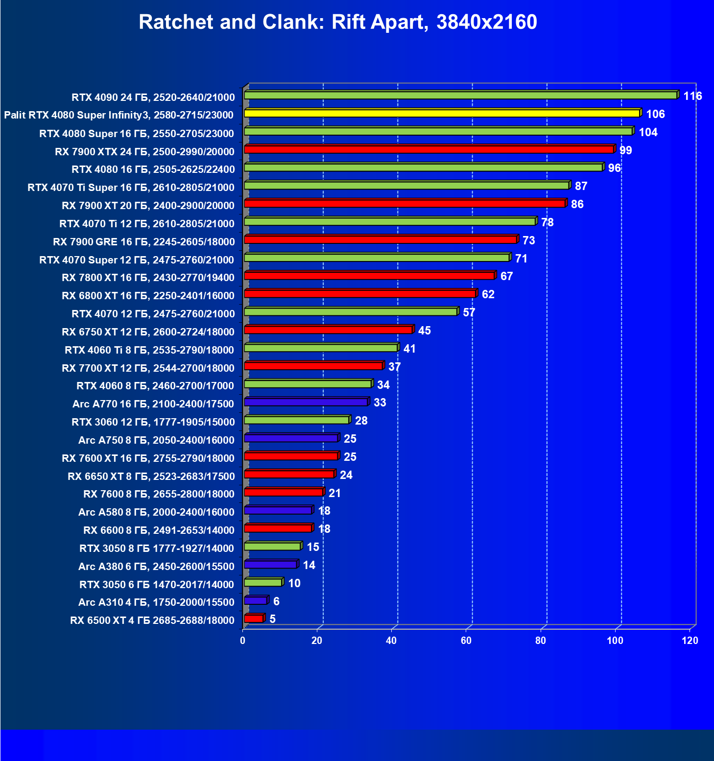 | 02 | Palit RTX 4080 Super Infinity3, 2580—2715/23000 | 7290 | 628 | 116 000 |